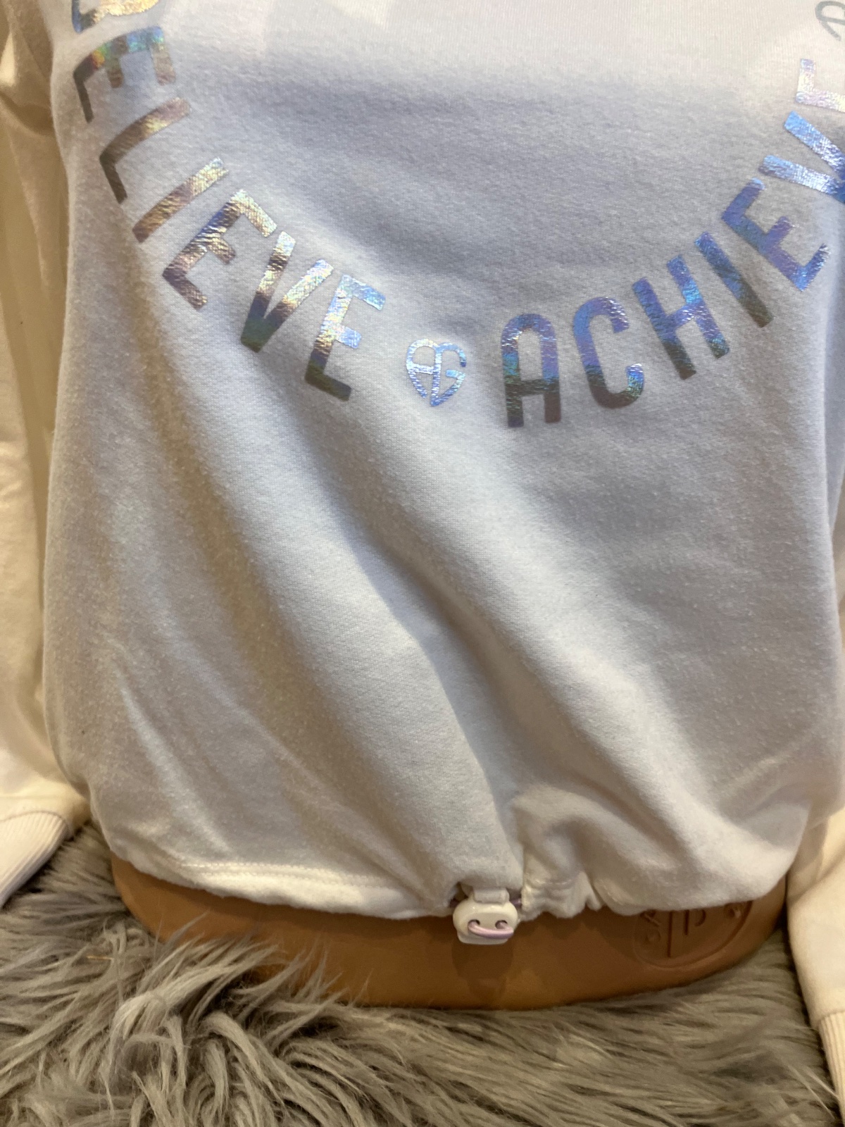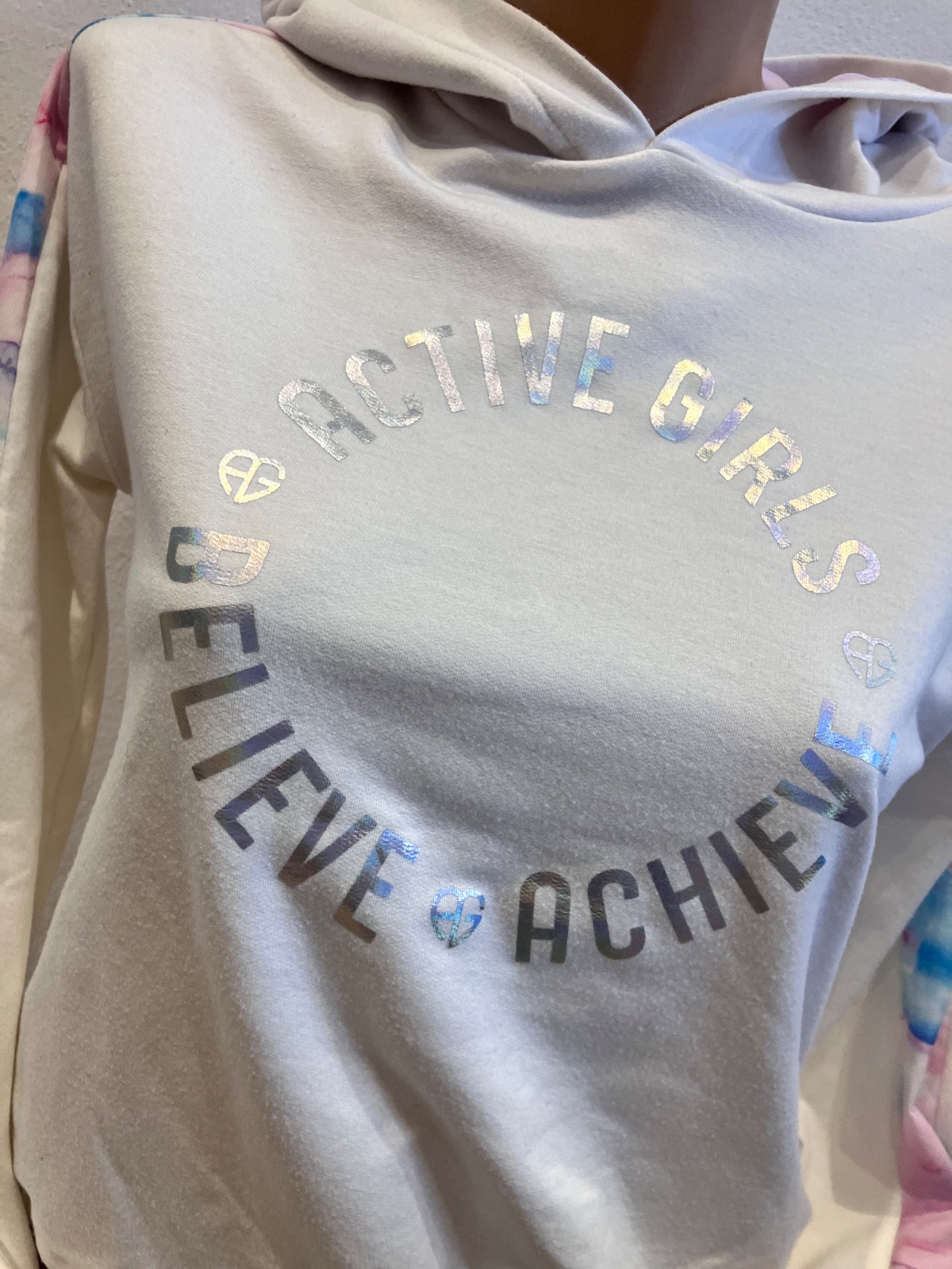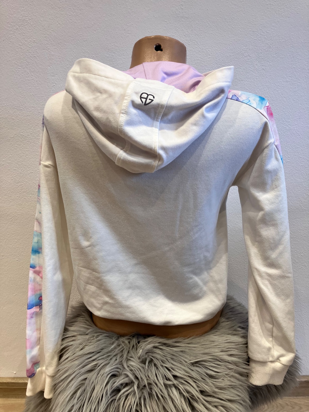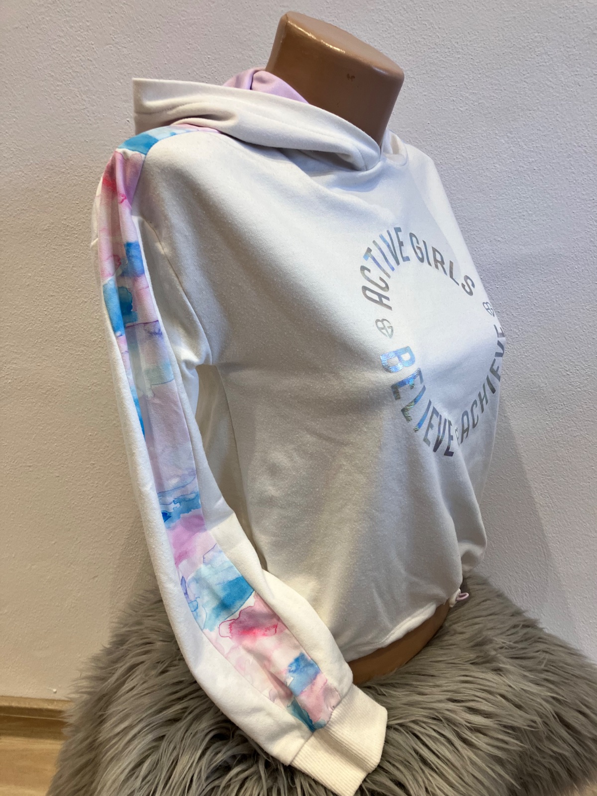 Dievčenská mikina s kapucňou, biela so strieborným nápisom a farebným vzorom na rukávoch, na páse s nastaviteľnou šnúrou, elastická.