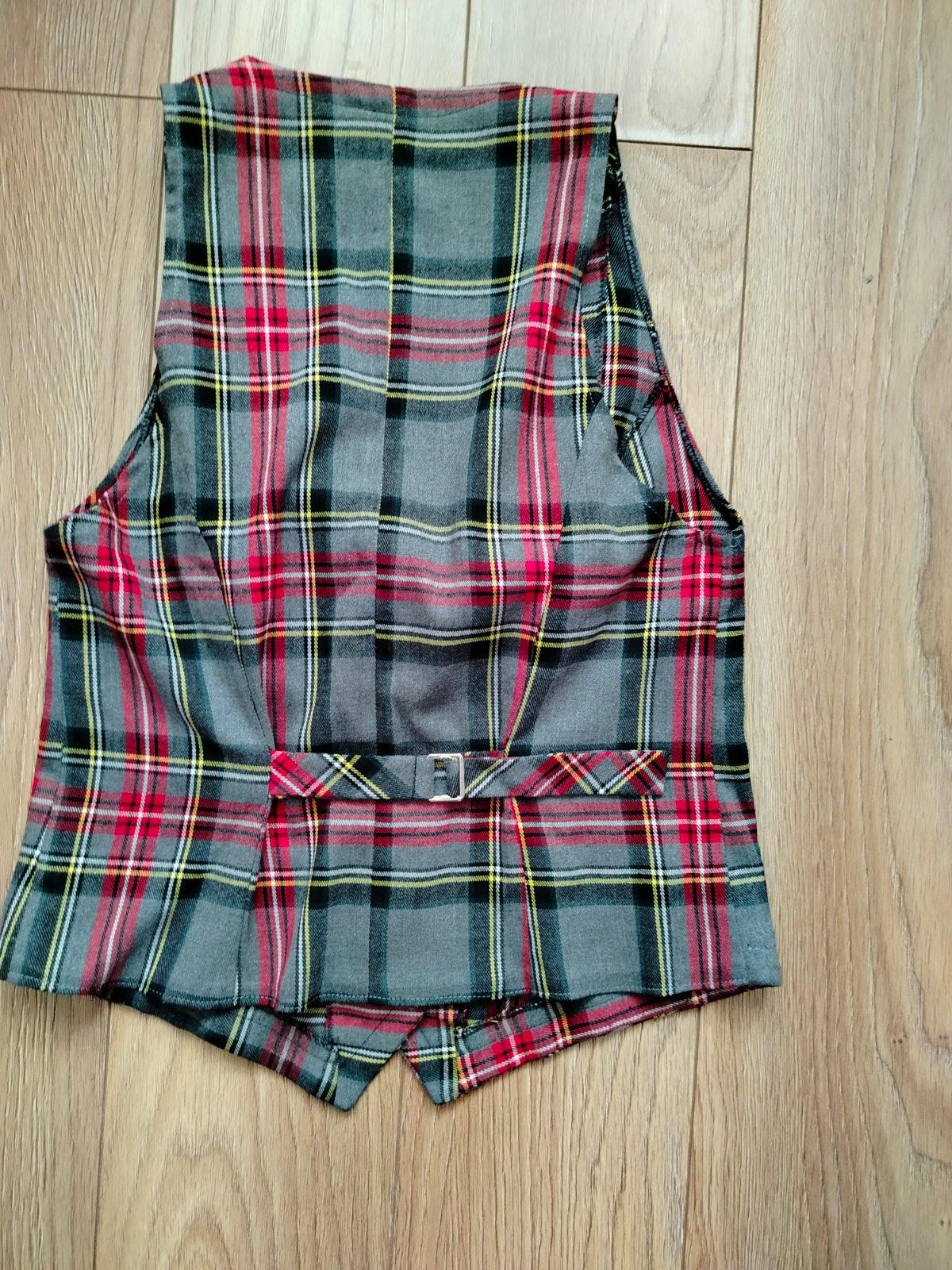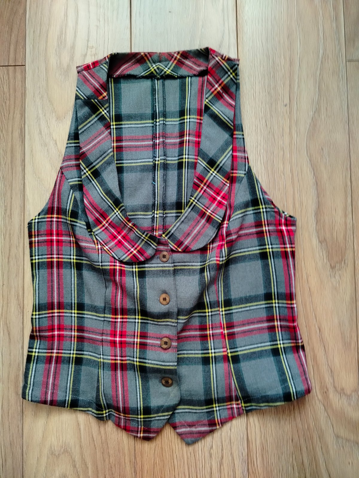 Dámska kockovaná vesta – vlastná tvorba, precízne šitie – takmer ako nová. Štýlová dámska vesta v krásnom tartanovom (kockovanom) vzore v odtieňoch šedej, červenej, čiernej a žltej. Má pekný golier, zapínanie na 4 drevené gombíky a predĺžený predný diel (špic).Vlastná ručná tvorba – precízne ušitá, čisté švy, veľmi dobrá kvalita spracovania.