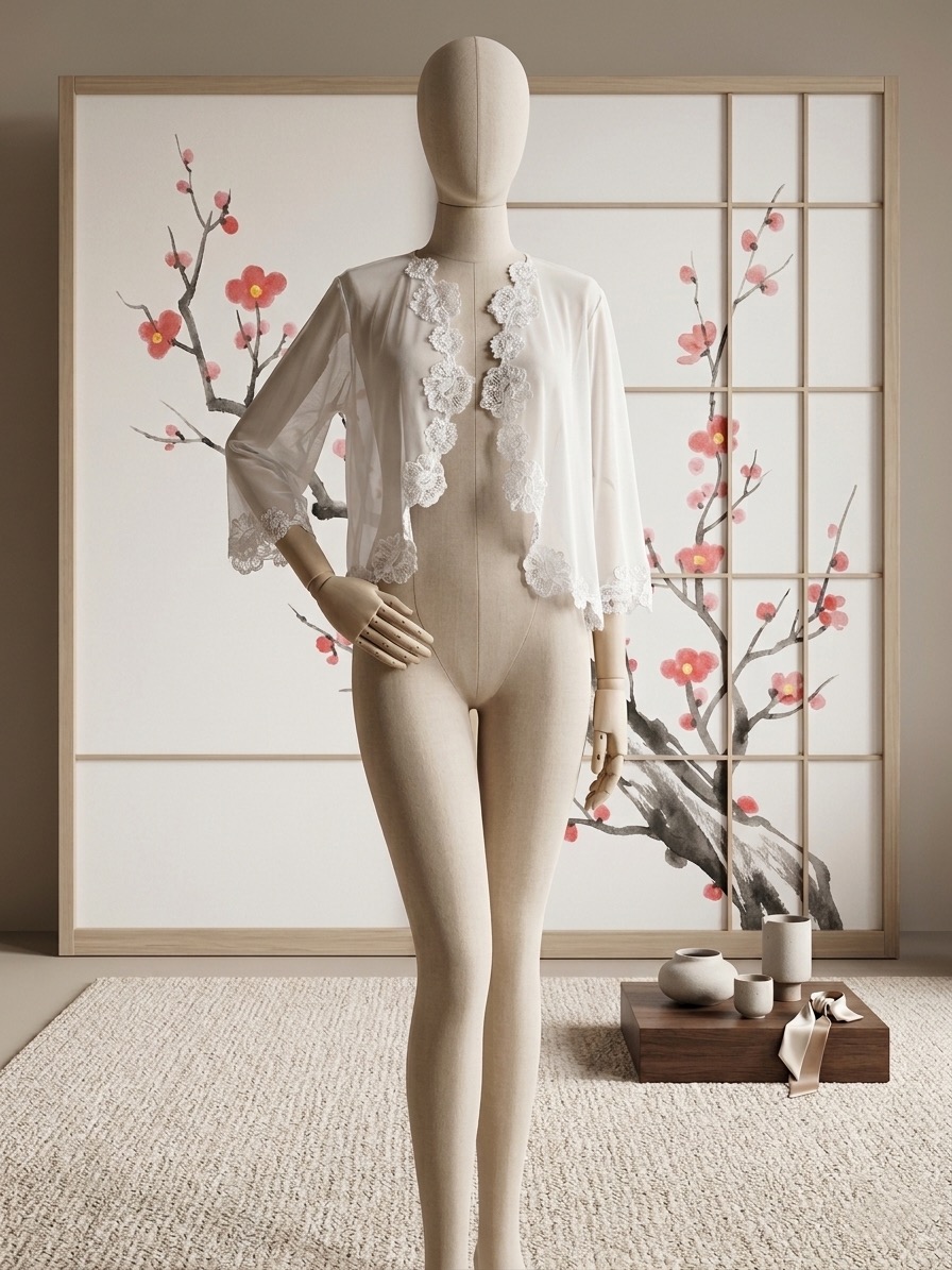 Detaily: Kabátik je vyrobený z jemného priesvitného materiálu, lemovaný výraznou kvetinovou čipkou