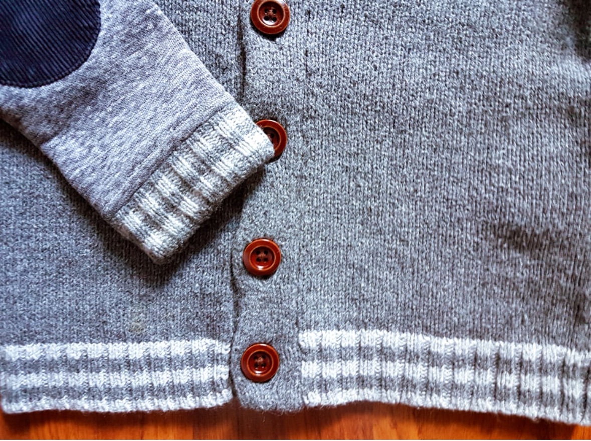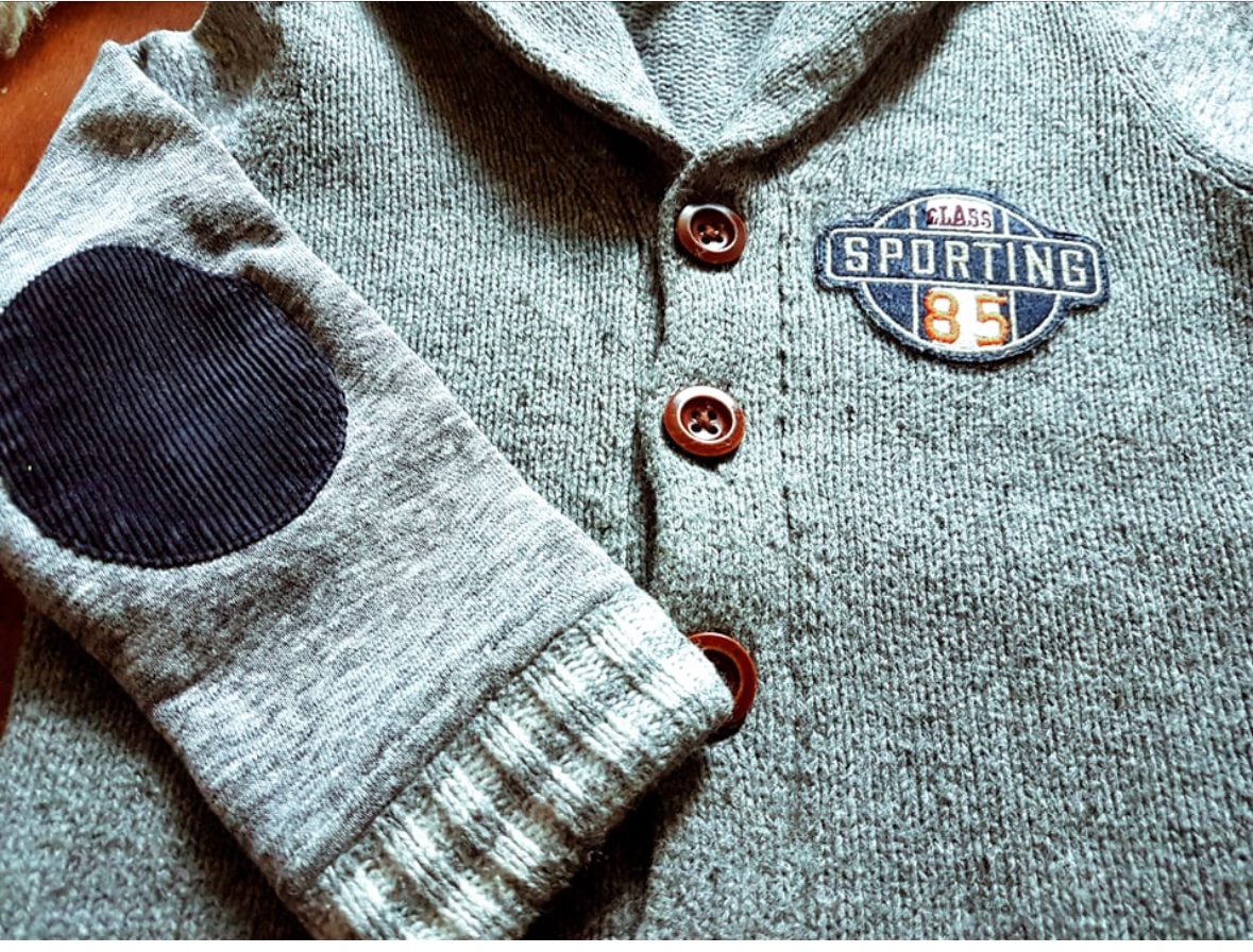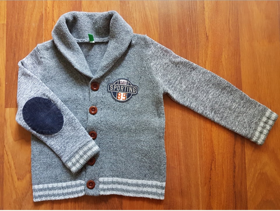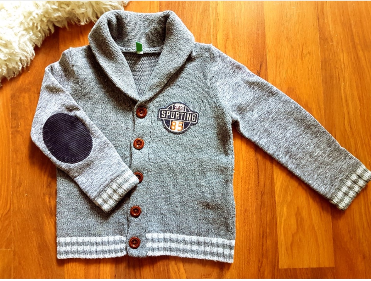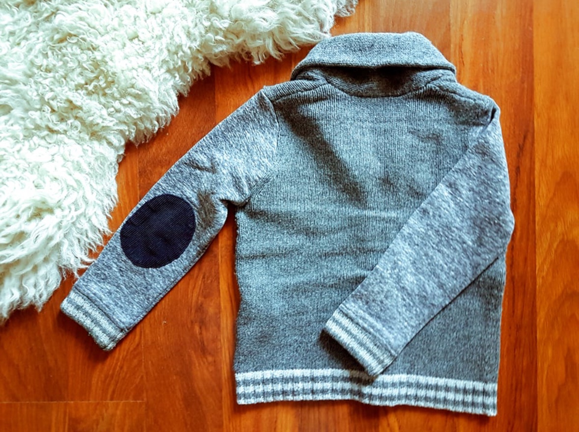 Predný a zadný diel je pletený, rukávky su ako keby s takej makučkej teplakoviny. Na rukavoch - laktoch je našite menšestrové chránenie lakťov.
