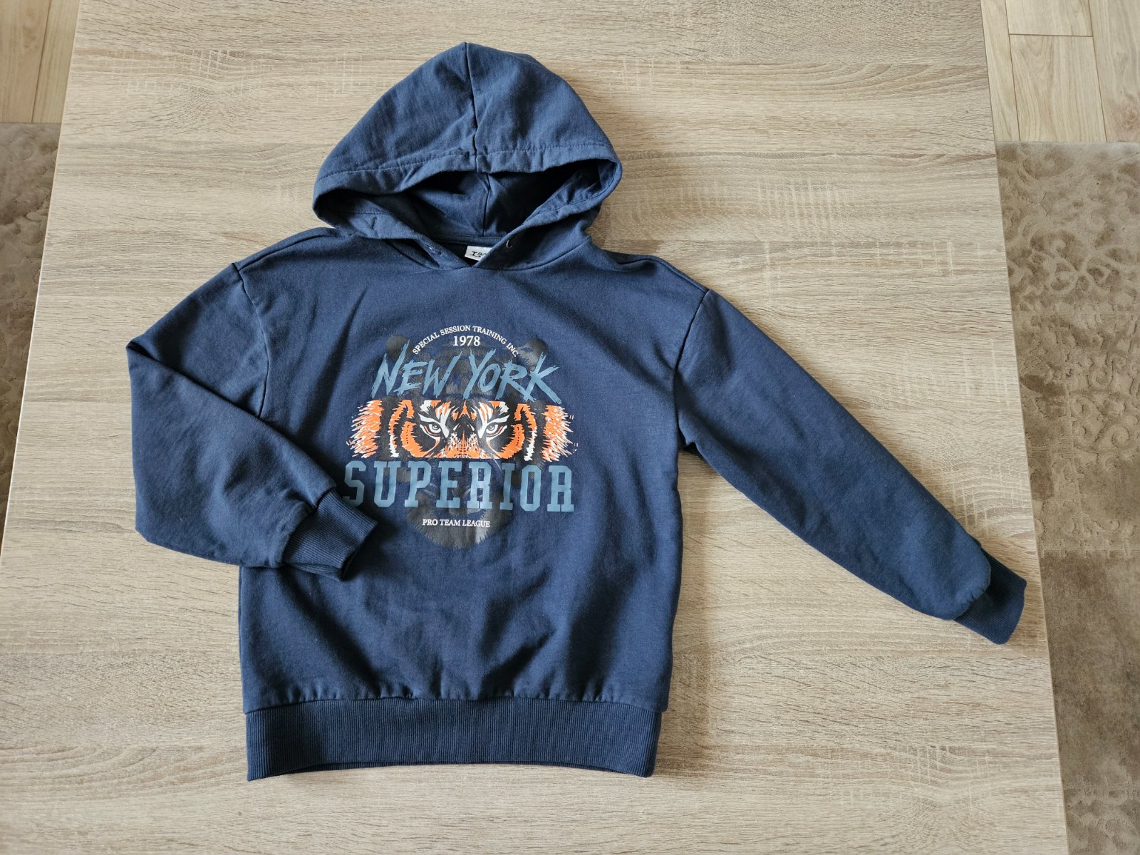 Vobec nenosena, iba oprata. Je pisana velkost 138/140, prave preto sme ju nenosili, hned bola mala. Je to velkost 128.