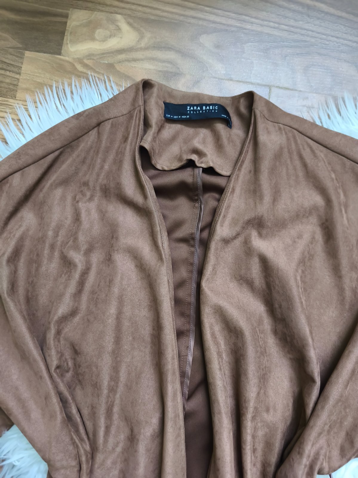 Dámsky štýlový tenký kardigan, v peknej nadčasovej farbe a strihu, chybička krásy, šupe sa koženka na opasku, viď foto, dá sa v pohode vymeniť za iný.
