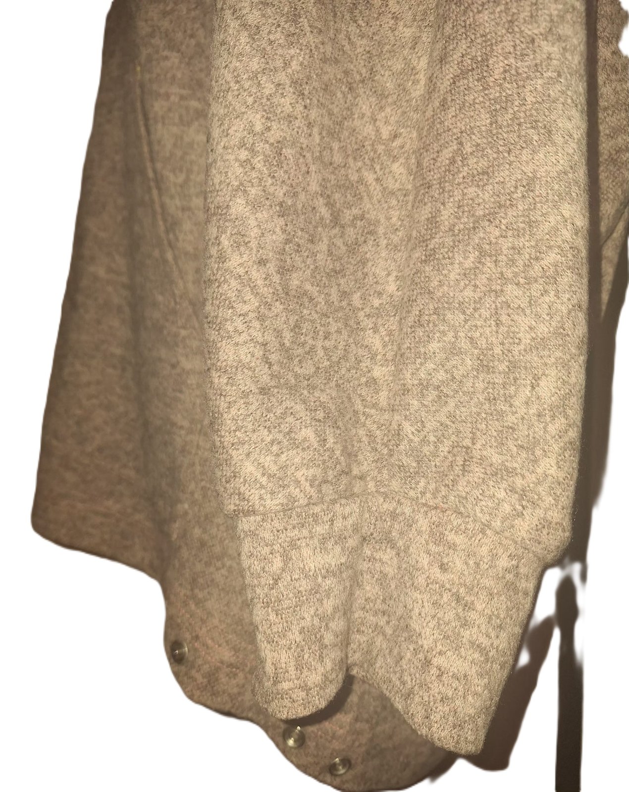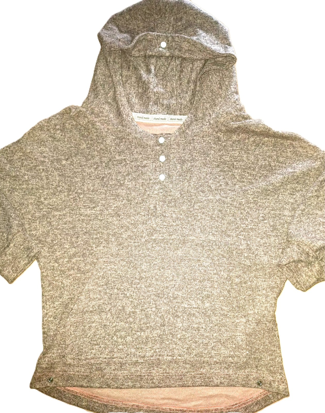 Predĺžená mikina má štýlový strih. Zadný diel je dlhší a tvarovaný do poloblúka. Dolnú záložku je možné upraviť, na čo slúžia dva druky (cvoky). Priekrčník je väčší a lemuje ho väčšia kapucňa. Na prednom diele je léga s cvokmi. Klokanie vrecko je umiestnené na prednom diele, rukávy sú zakončené manžetami. Materiál je pružný melírovaný úplet s jemným vlasom, farba marhuľovo-sivá. Mikina bola minimálne nosená.