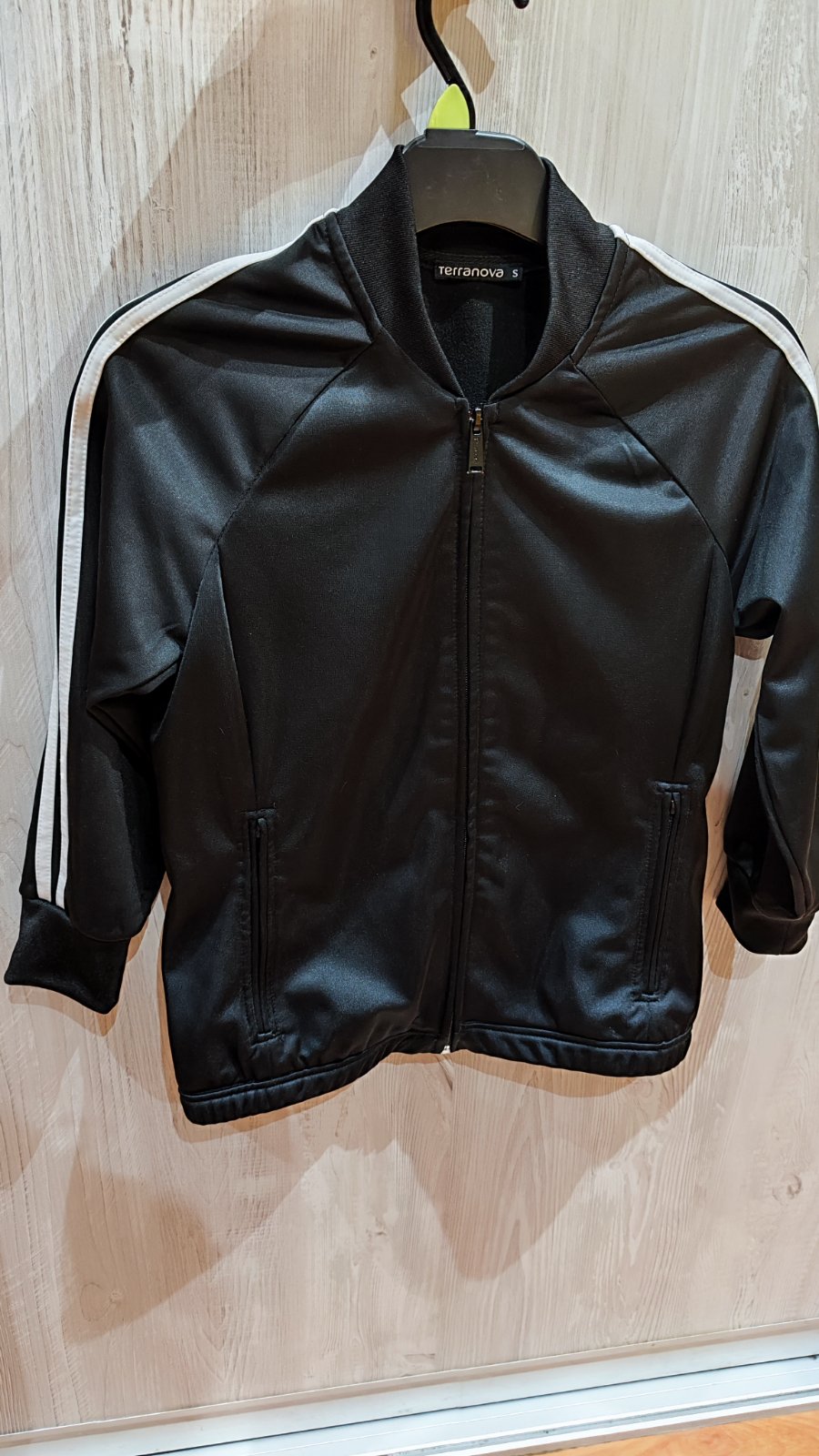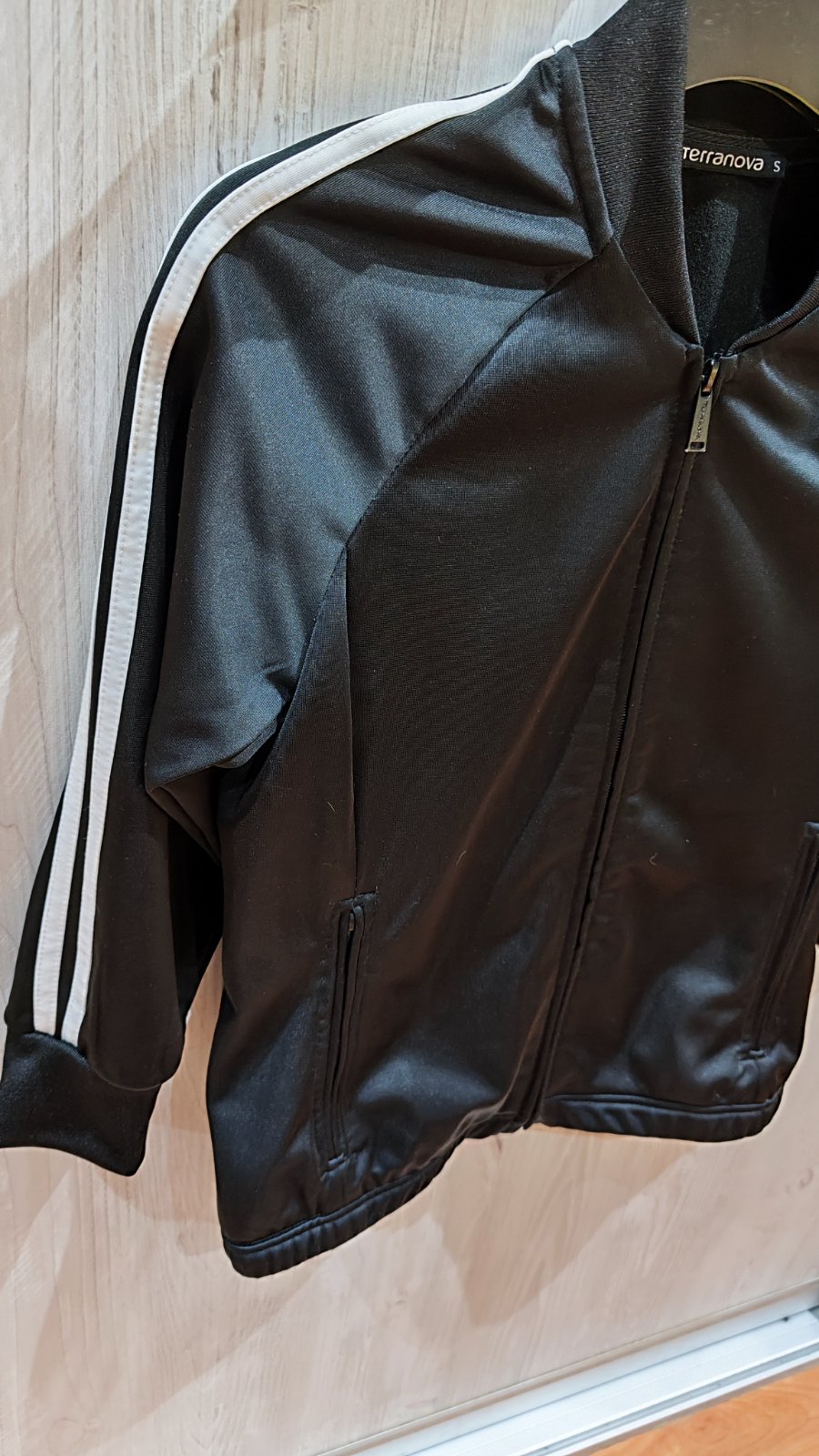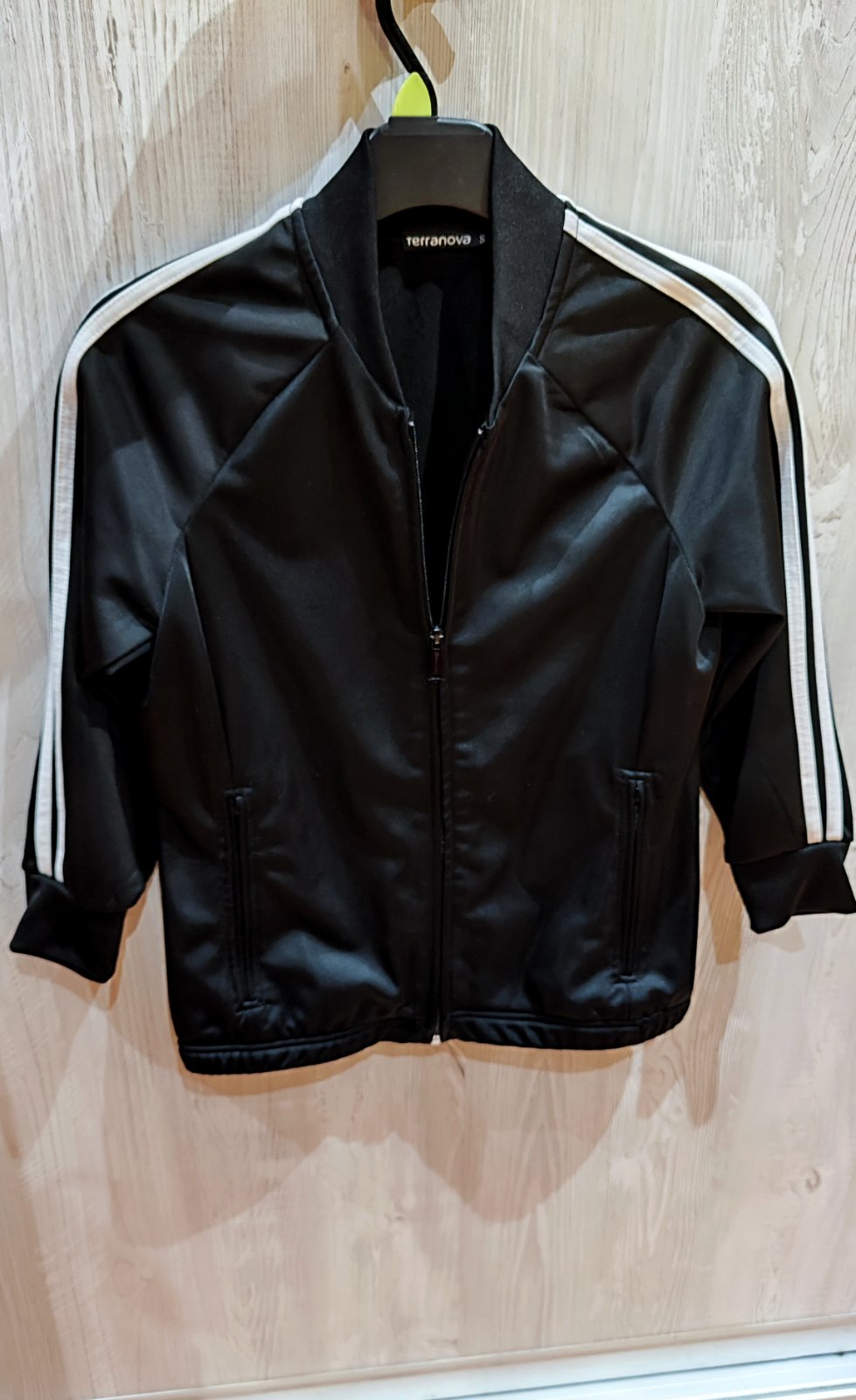 Sýto čierna mikina / bundička s bielymi pásikmi na rukávoch, rukávy sú trištvrťové, veľkosť písaná S ale odporúčam skôr na XS.