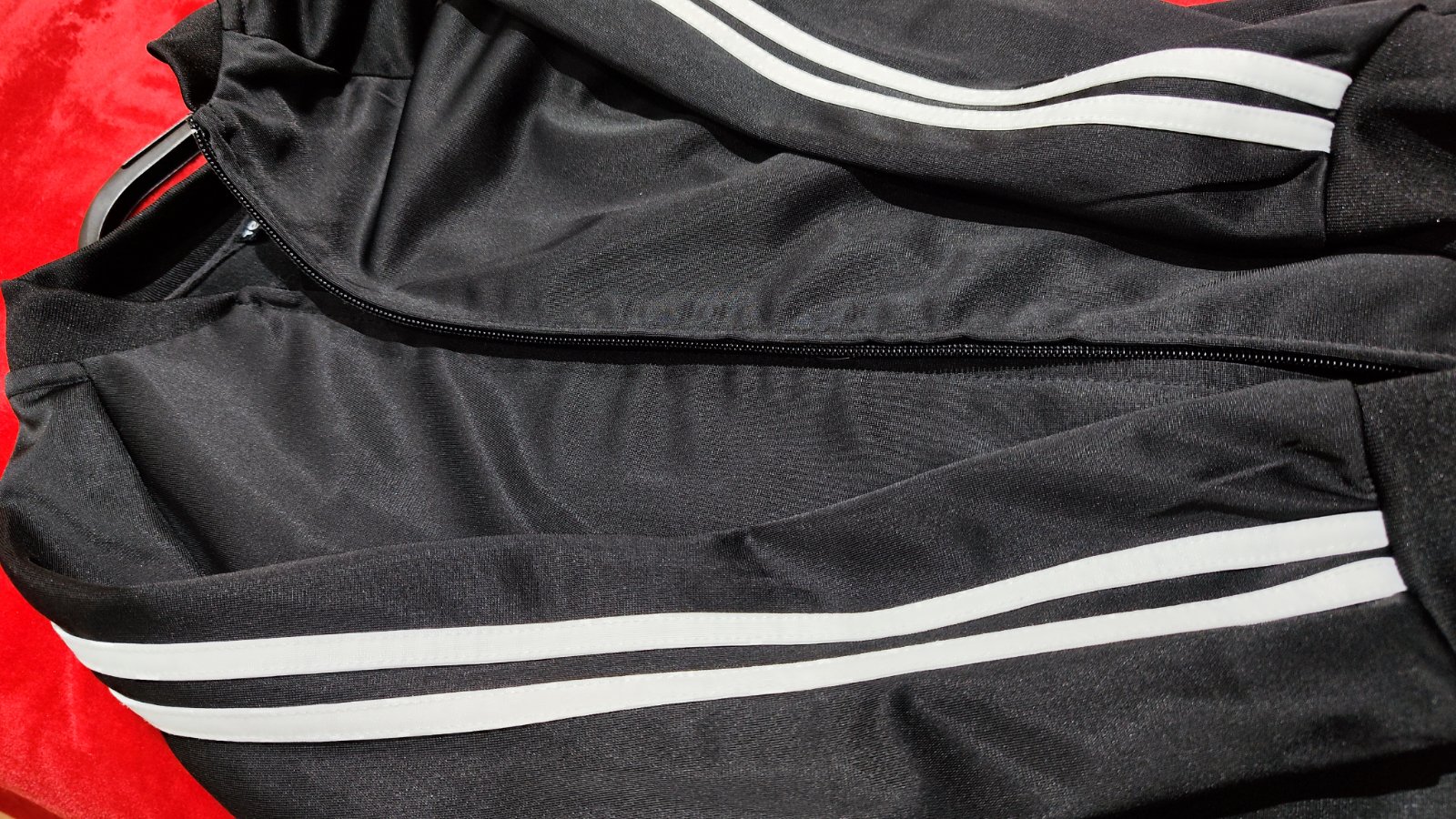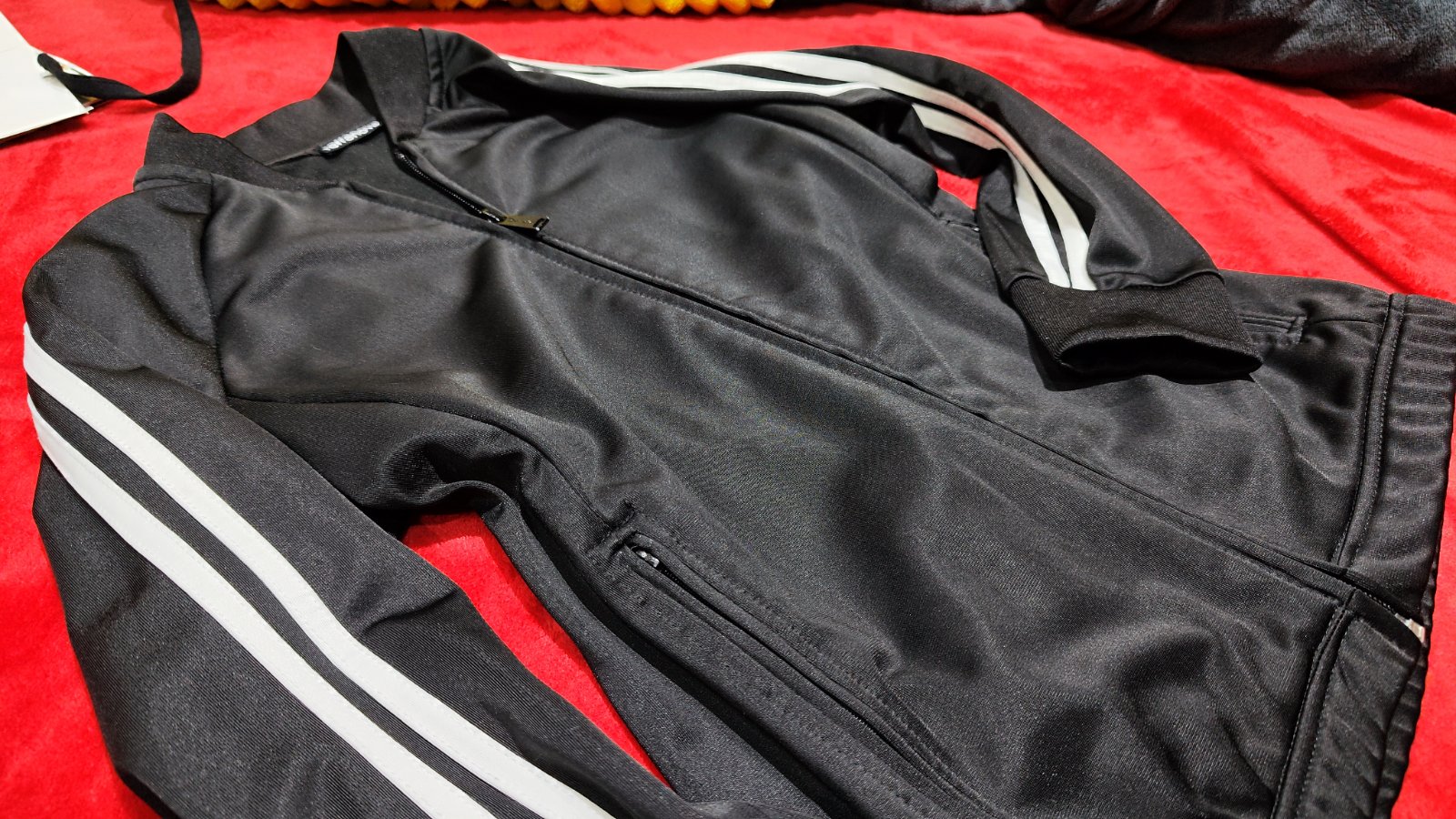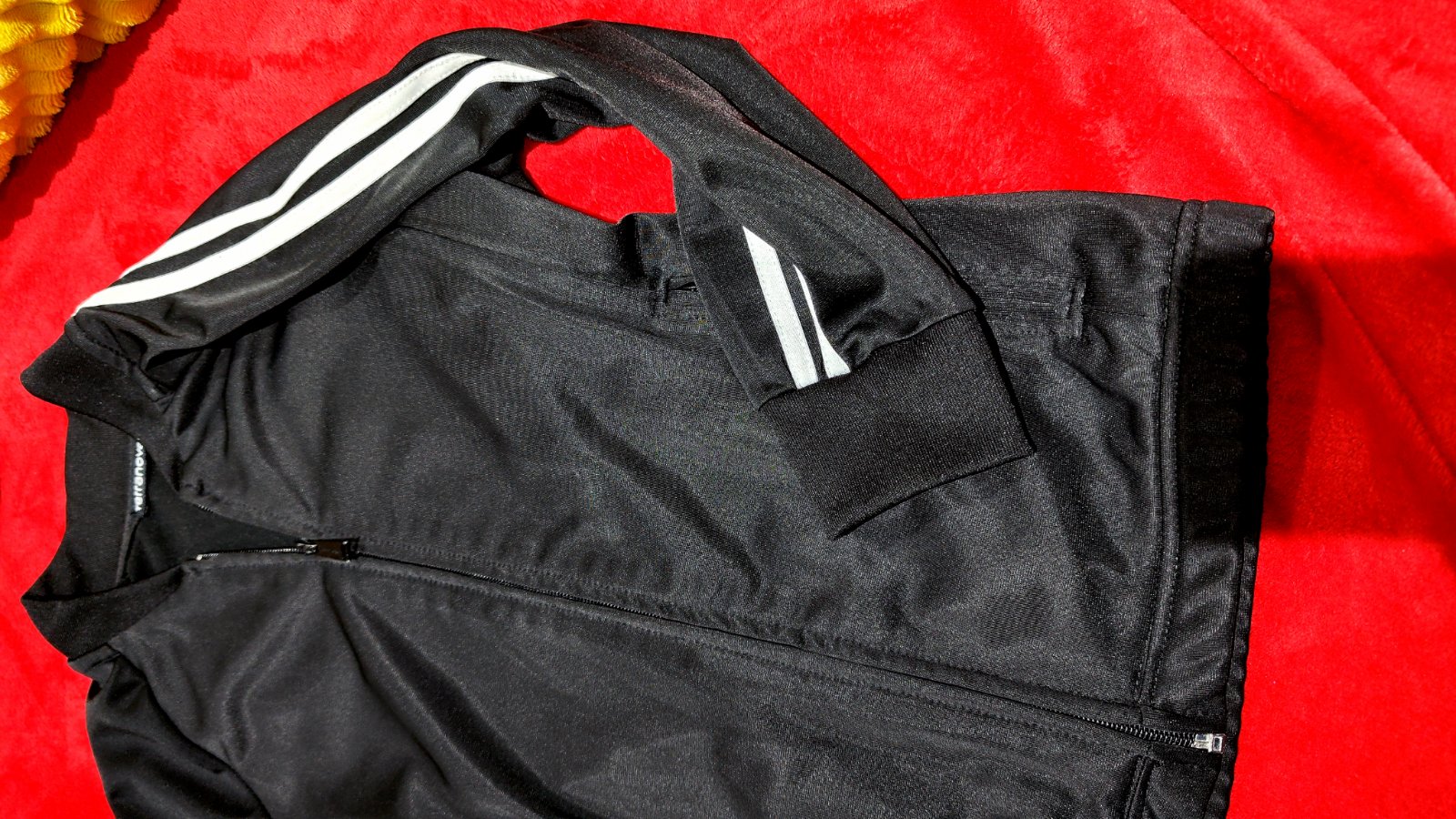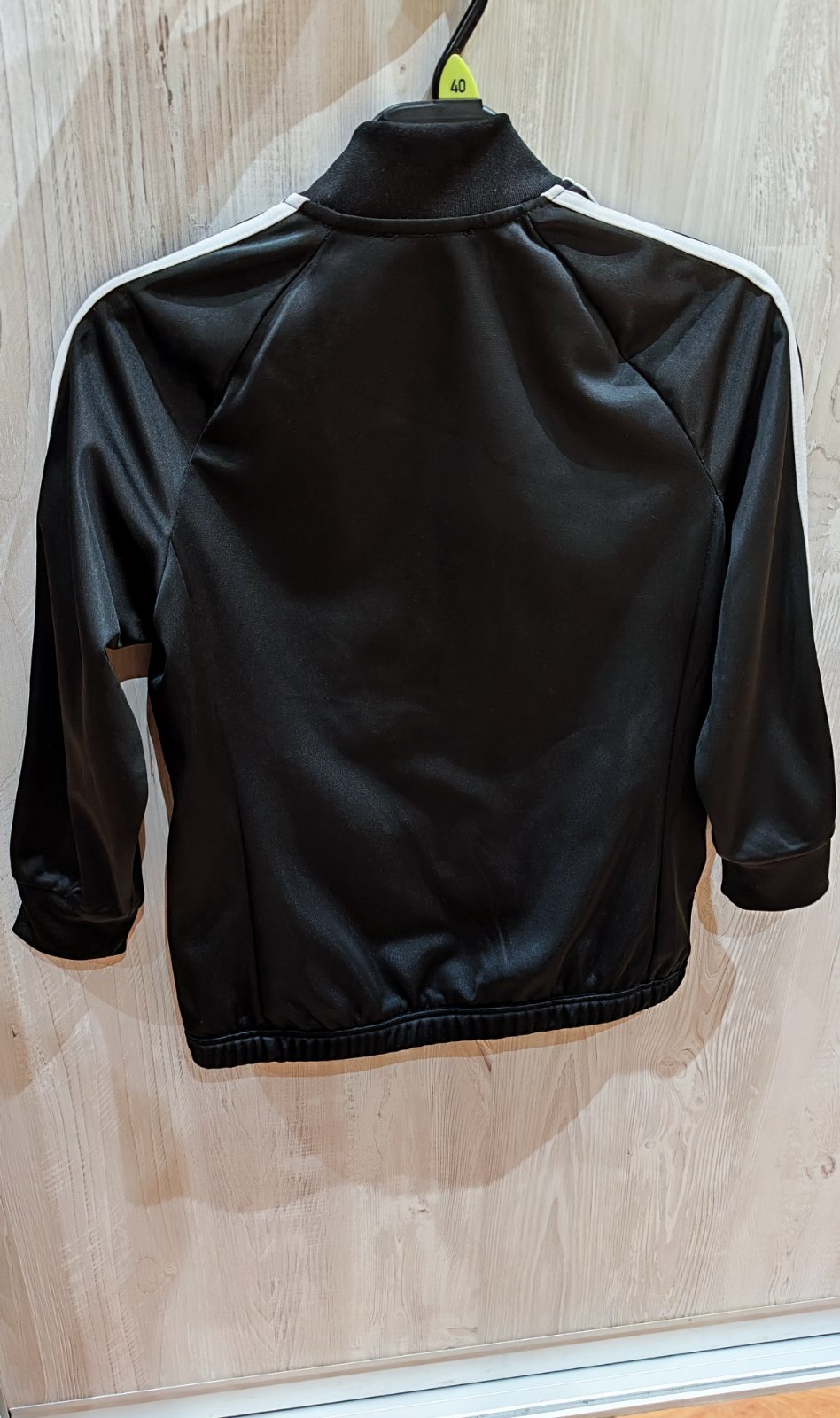 Sýto čierna mikina / bundička s bielymi pásikmi na rukávoch, rukávy sú trištvrťové, veľkosť písaná S ale odporúčam skôr na XS.