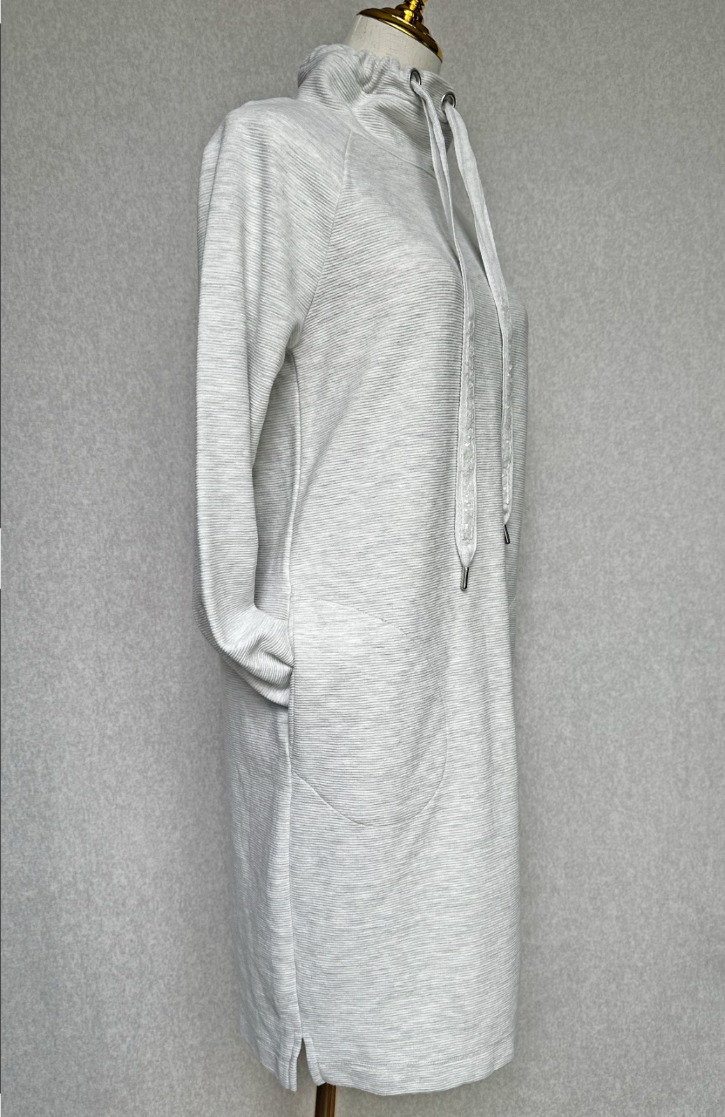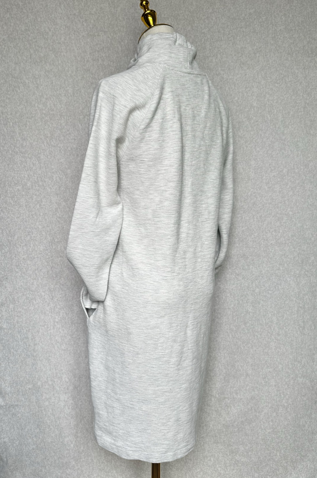 Pohodlná mikinová / tepláková tunika v svetlúnkej sivej farbe. Dá sa nosiť aj ako šaty k teniskám. Vhodná na prechodné obdobie alebo aj na zimu pod dlhú bundu / kabát. Vysoký golier (rolák) sa dá utiahnuť pre lepšiu izoláciu. Po bokoch sú praktické vrecká. V super stave, bez poškodení.