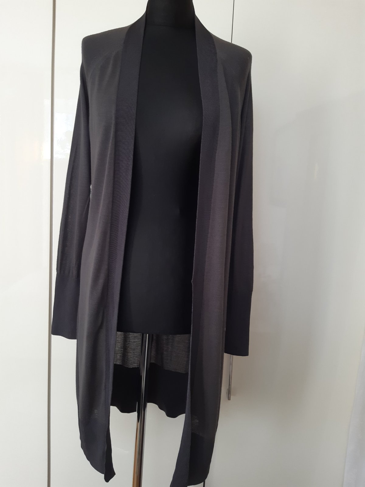 Veľmi pekný , elegantný kardigan dobrej kvality, je dlhší. Materiál je príjemný, mäkký, tenký, presvitá, hodí sa aj na spoločenskú príležitosť, pôsobí športovo-elegantne. Dl. 102 cm, dl. reglánového rukáva od krku 75 cm, šírka cez prsia 50x2 cm. Kardigan je vo veľmi dobrom stave, bez poškodenia. Zle sa mi fotilo,na niektorých fotkách je svetlá farba, ale farba je jednoliata tmavošedá, nebadať použitie.