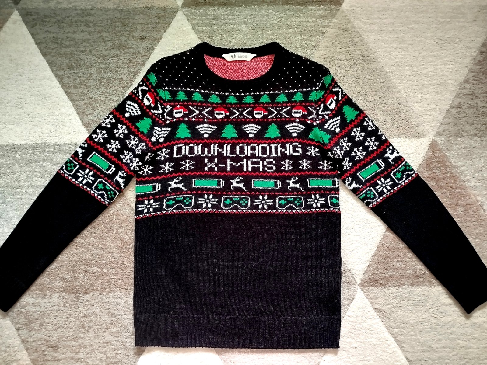 Vianočný svetrík H&M, veľkosť 158/164. Dĺžka 64cm, prsia 44cm, rukáv od krku 69cm. Použitý len na Vianoce, super stav bez žmolkov. Cena + pošta.