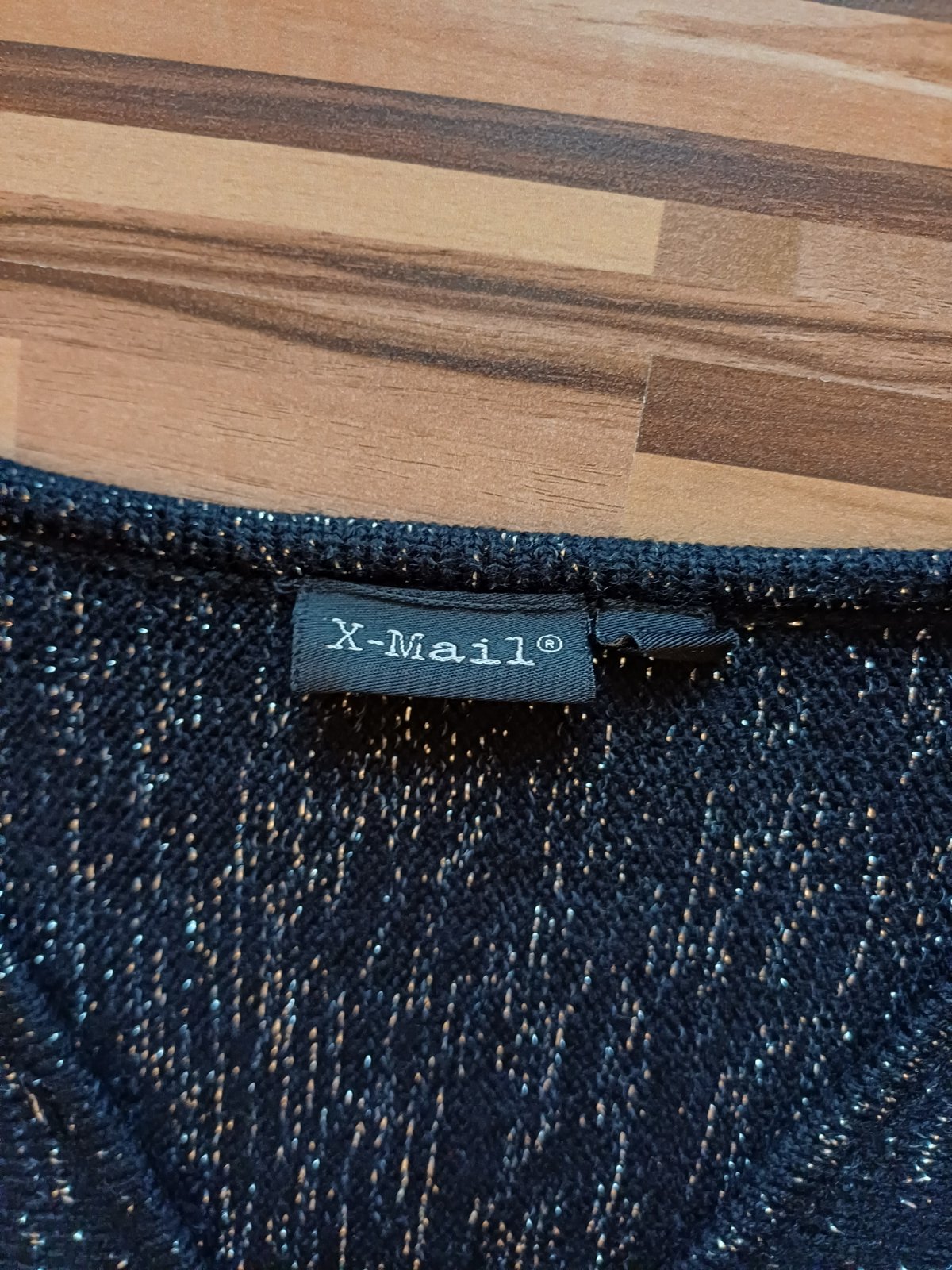 Pulóver zn. X-Mail, veľ. L. Čierny s trblietavou striebornou niťou. V páse vrúbkovaný, obtiahnutý, výstrih do V, široké zvonové rukávy. Na bežné nosenie aj na príležitosť. Materiál 100% polyakryl. Dĺžka od ramena po spodný okraj 61 cm.