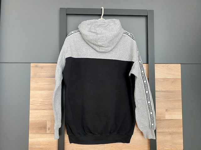 Mikinka je zvnútra zateplená flísom, rukávy majú po stranách ozdobný lem a sú zakončené patentom, z prednej strany sú klokanie vrecká. Mikinka je v dobrom, zachovalom stave, má iba jemné žmolky na šedej časti, zvyšok bez poškodení. PC 24,99 €