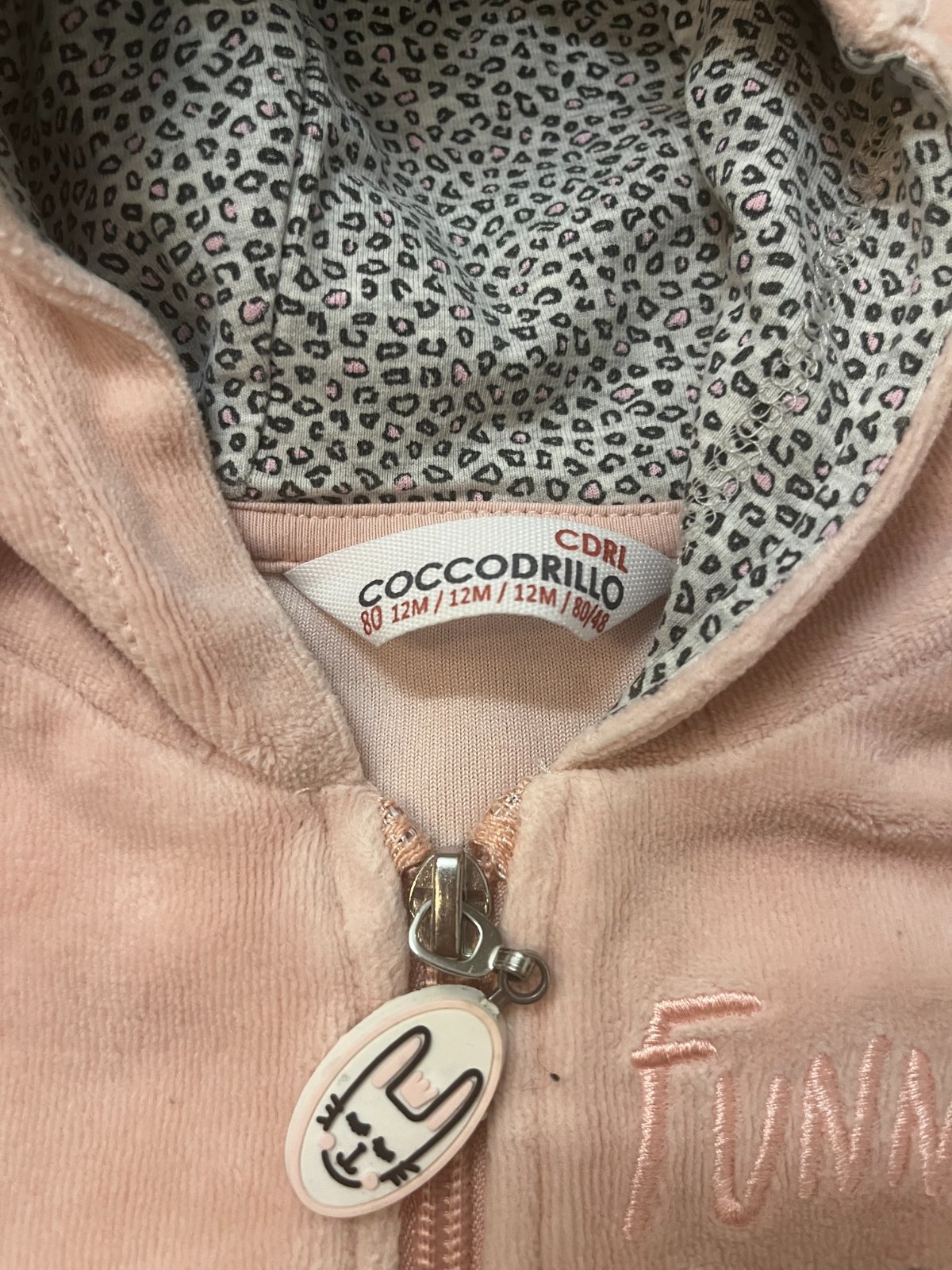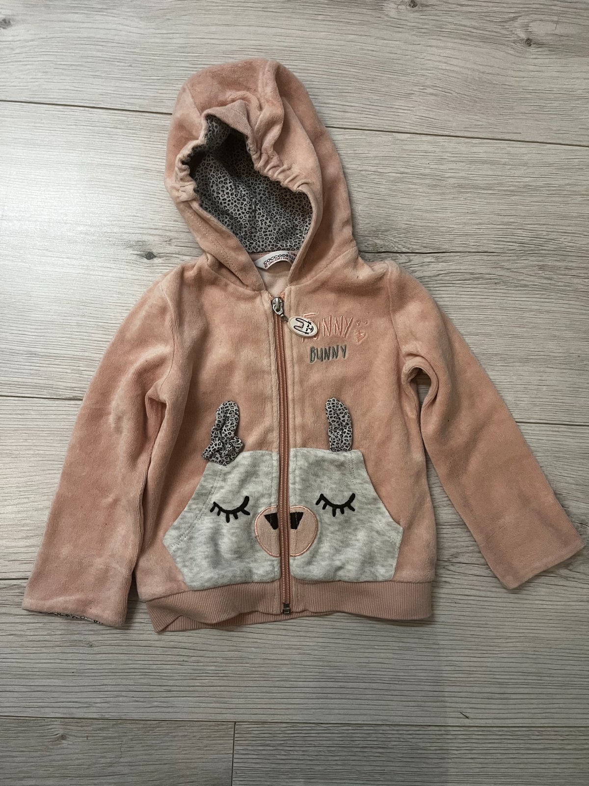 Predám bledoružovú mikinu s kapucňou so zapínaním na zips s motívom zajačika značky Coccodrillo, veľkosť: 80 (9 - 12 mesiacov).