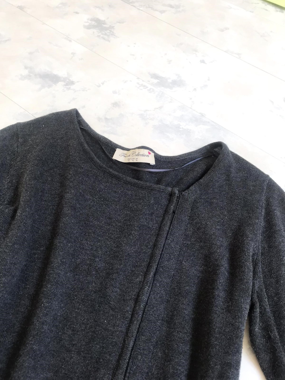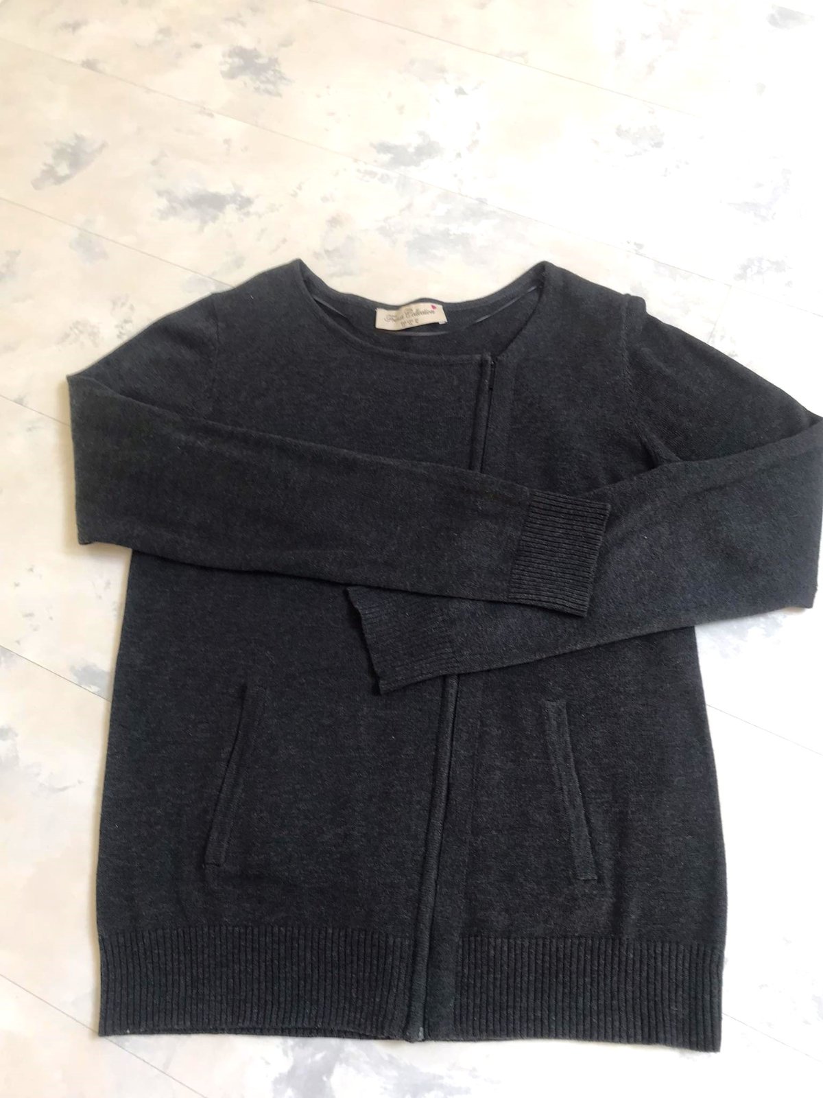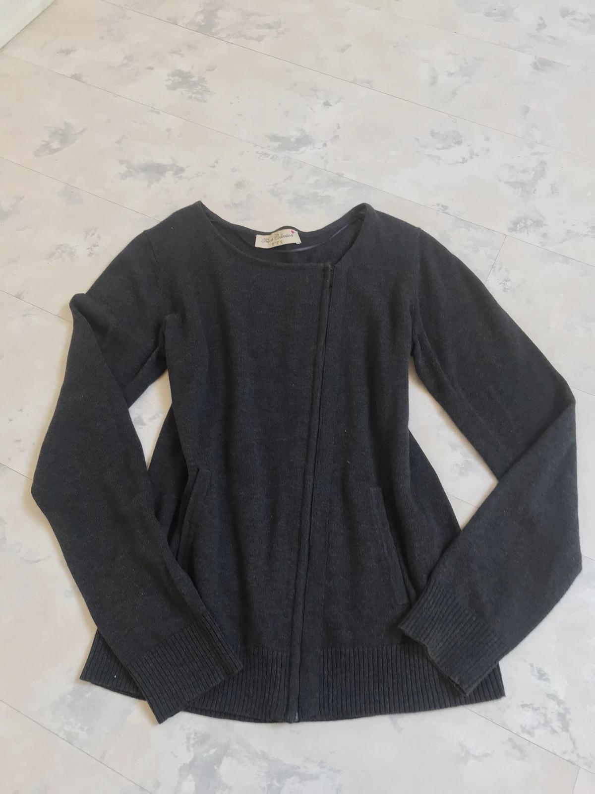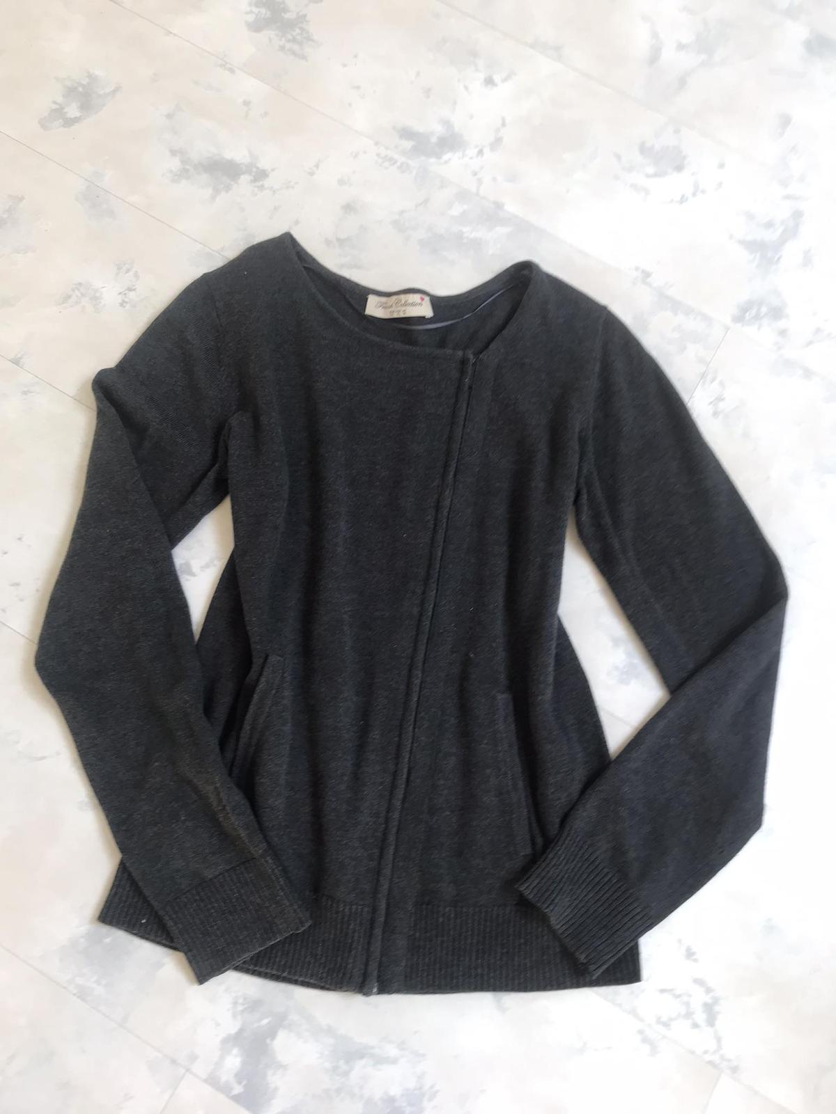 svetrík so zaujímavými detailami,bočné vrecká,top stav,farba antracitovo šedá,uvedená veľkosť 14/42,55 % acryl, 45 % bavlna