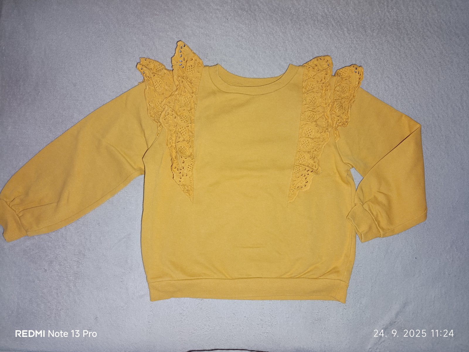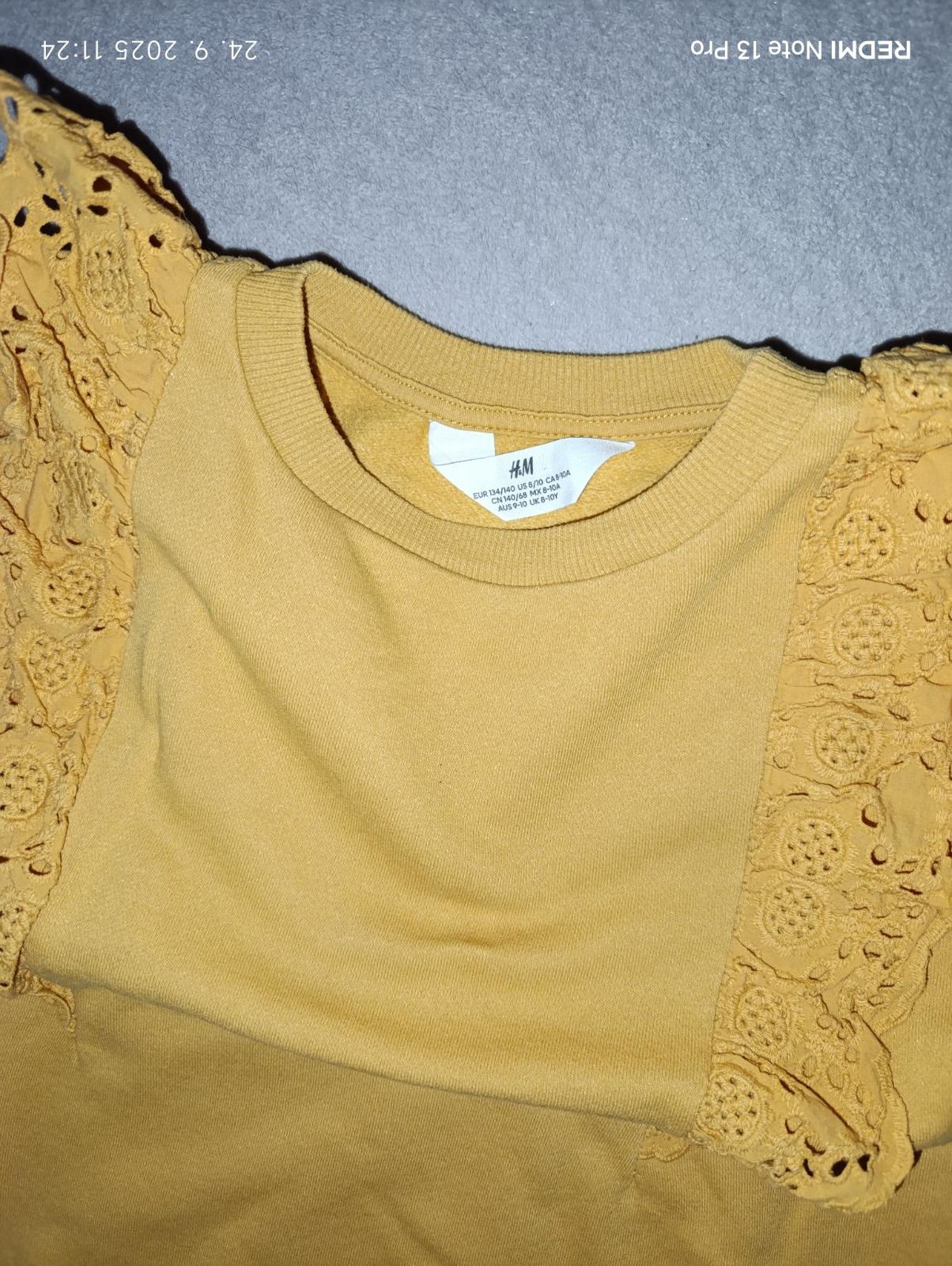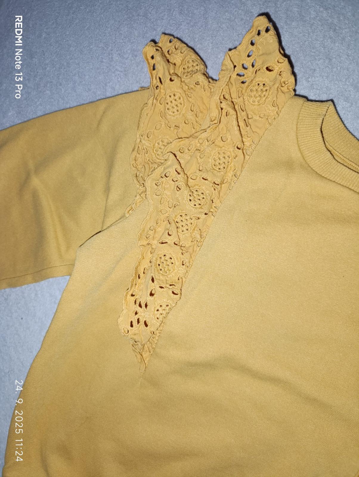 Nádherná mikina horčicovej farby s madeirovou čipkou.Dvojčíslo 134/140