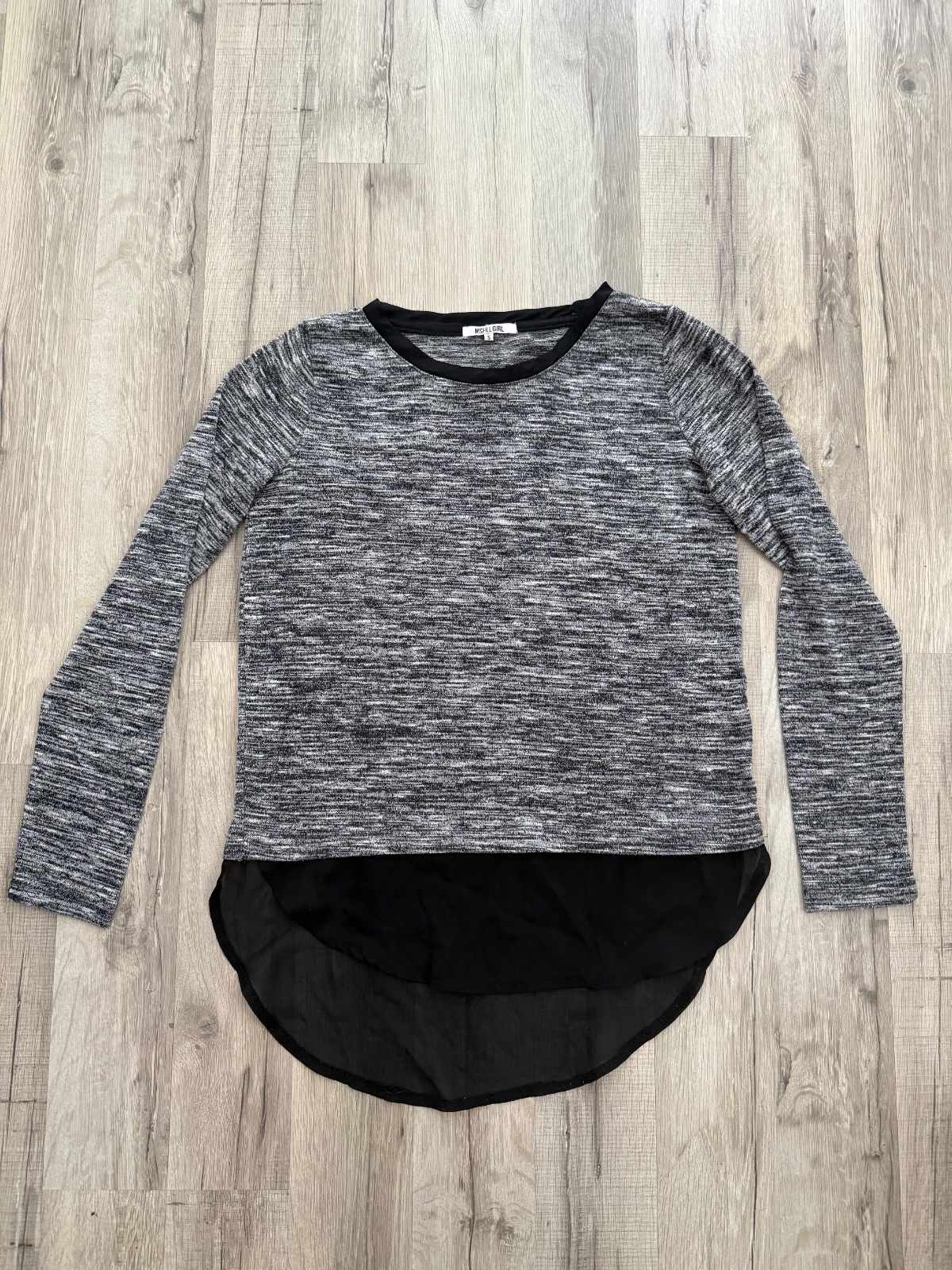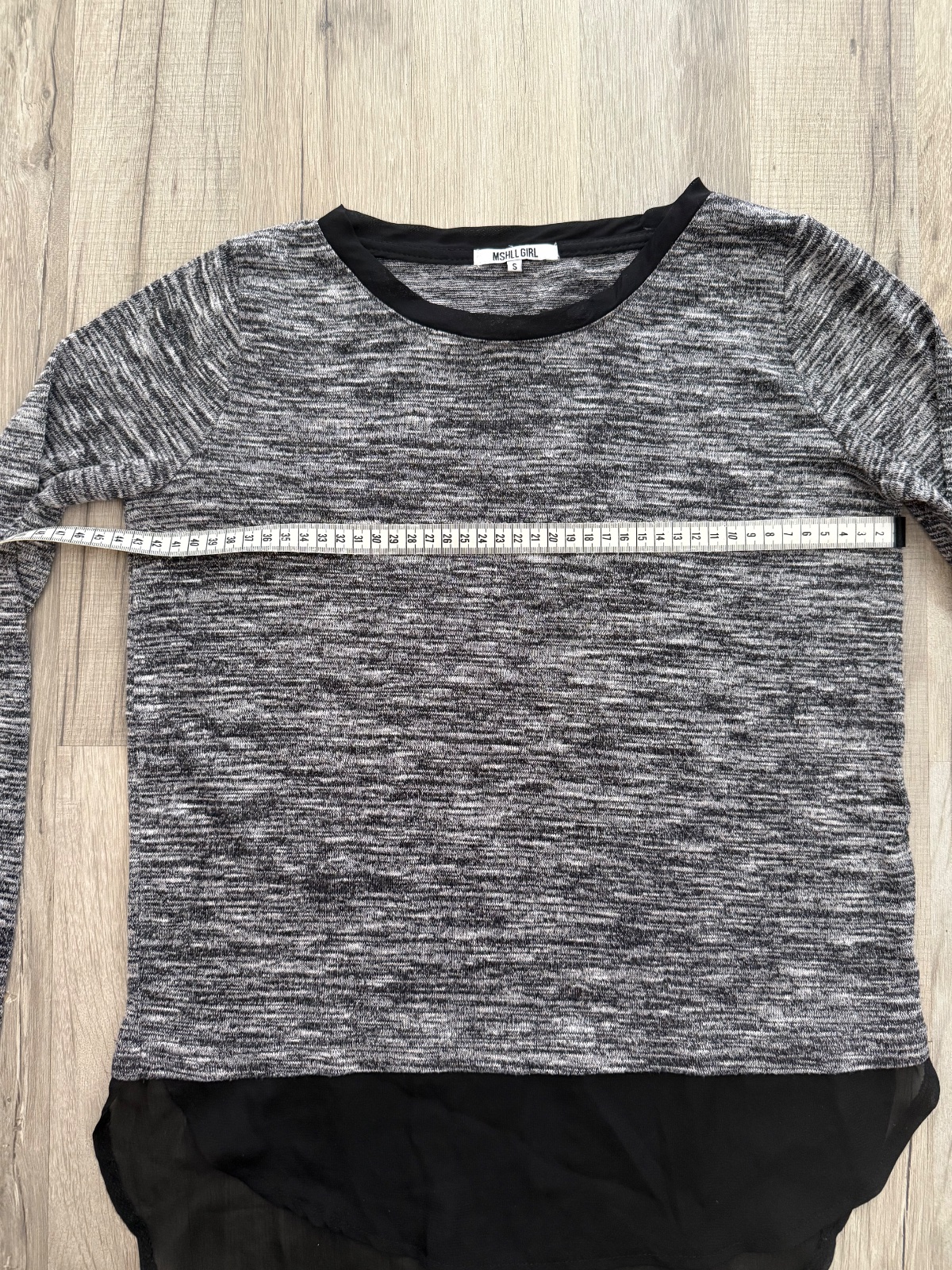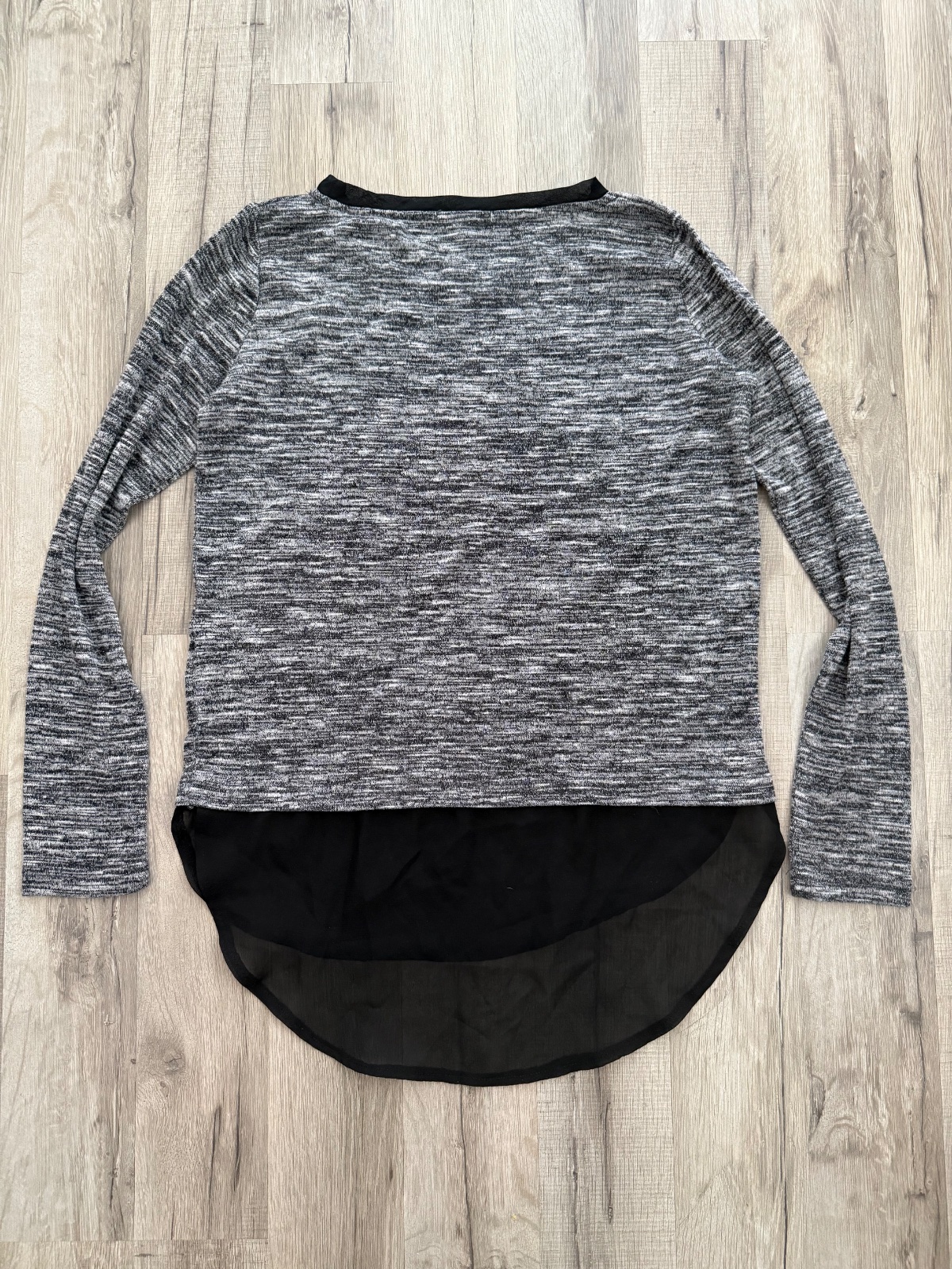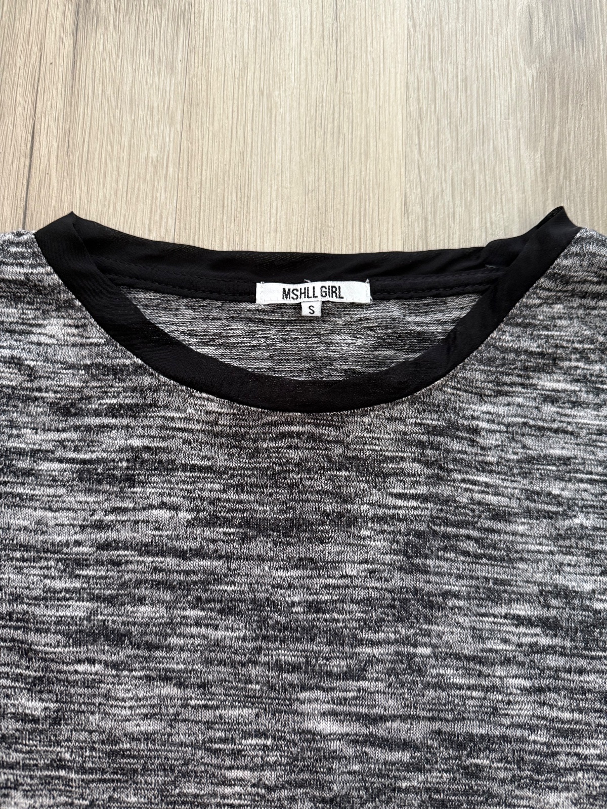 Tenký svetrík v šedej žíhanej farbe, veľkosť S, rozmery na foto. Bez poškodení, minimálne nosený. Cena 3€ + poštovné