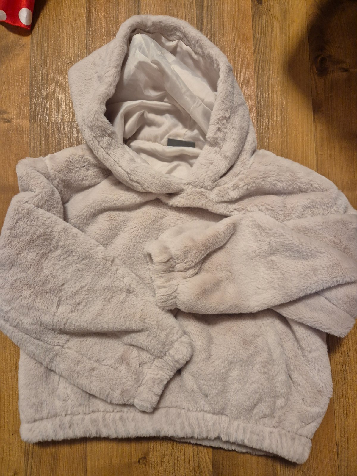 Predám huňatú dievčenskú mikinu s kapucňou vo veľ. 146/152. Nosená, bez poškodení.