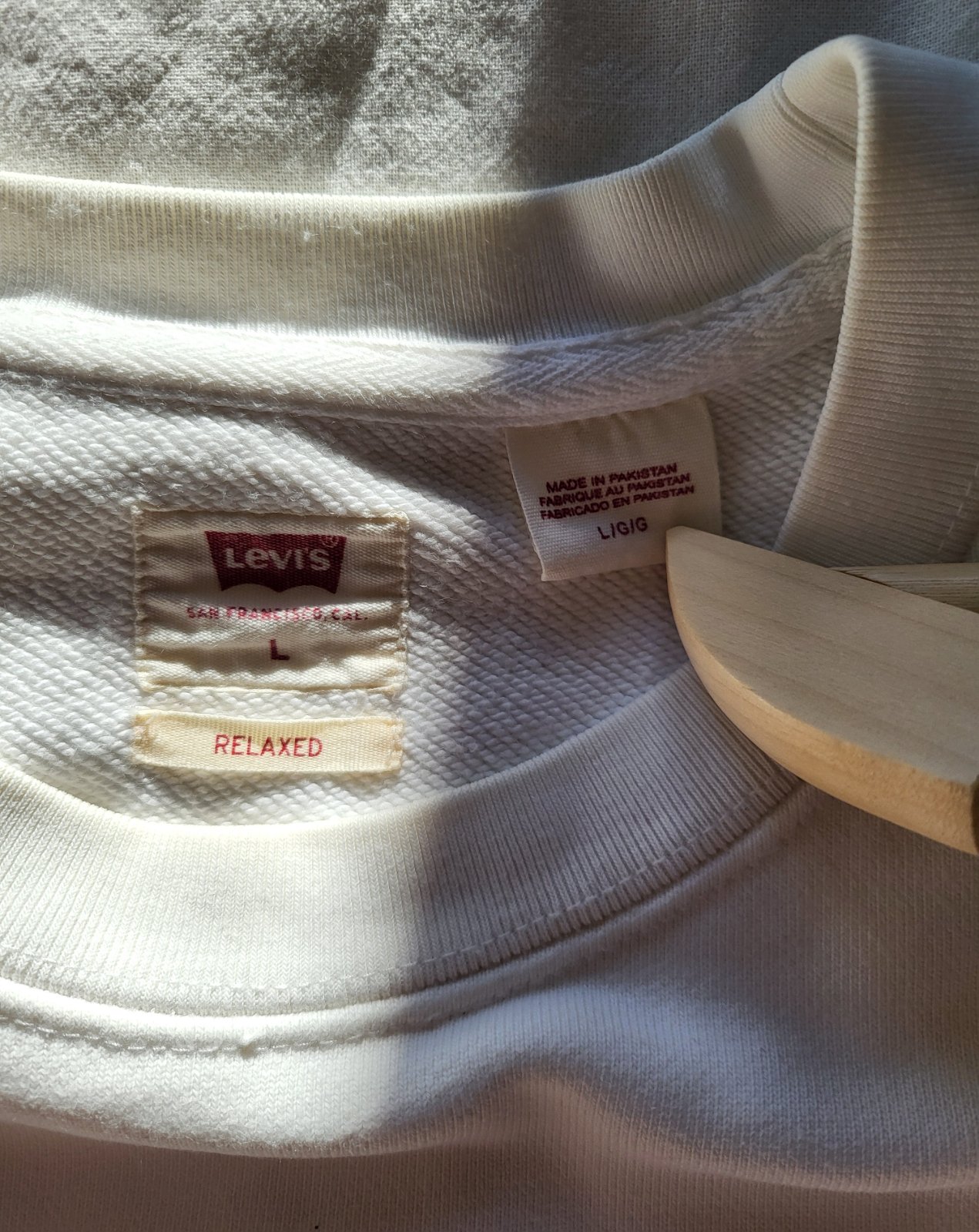 Je mierne zazltnuta na golieri, ale kto vie ako správne používať bieliace prostriedky, tak sa toho zbaví. Ináč je v poriadku, len mužovi je väčšia, lebo je to také väčšie Lko, tak ju nechce nosiť.