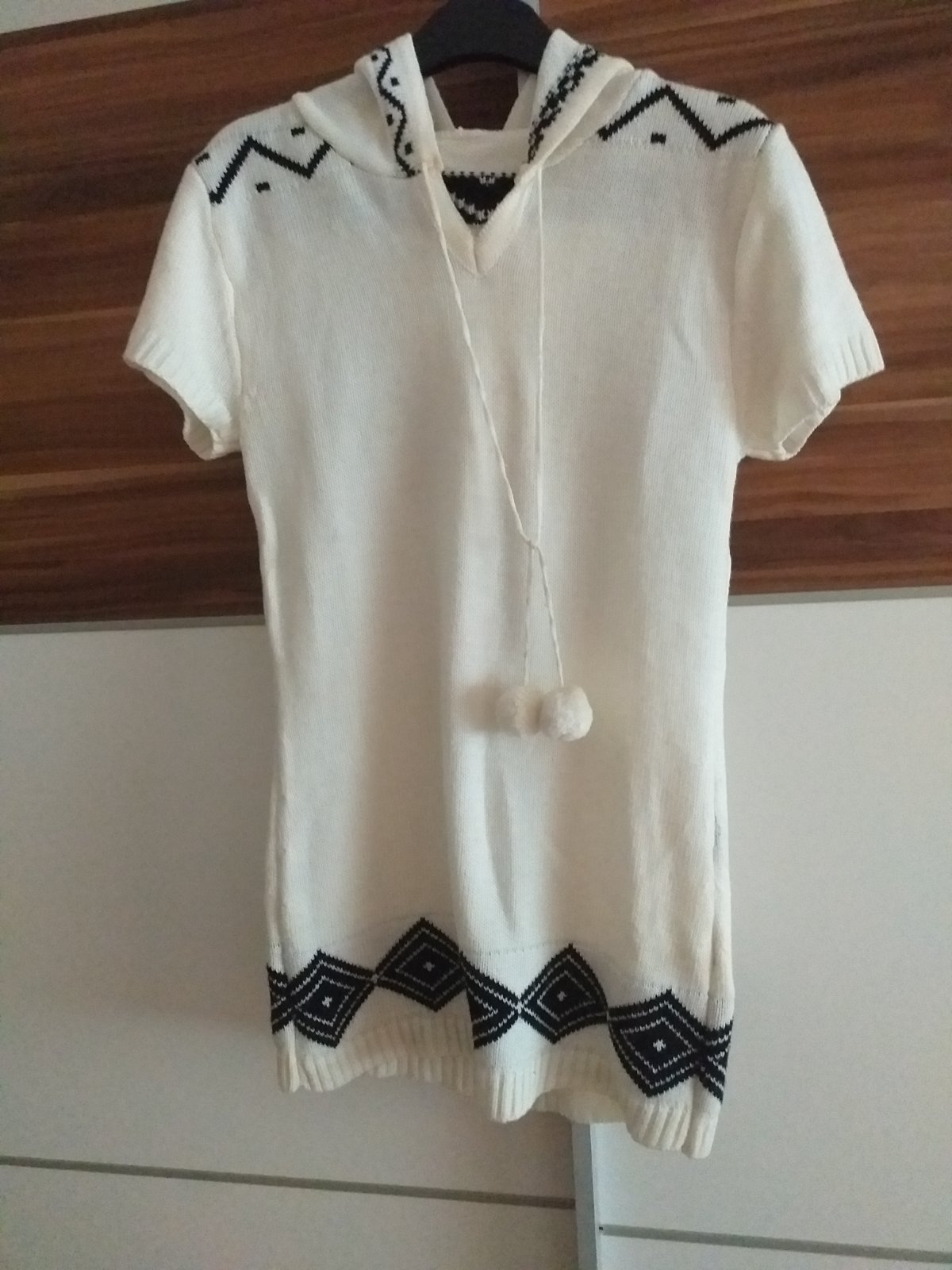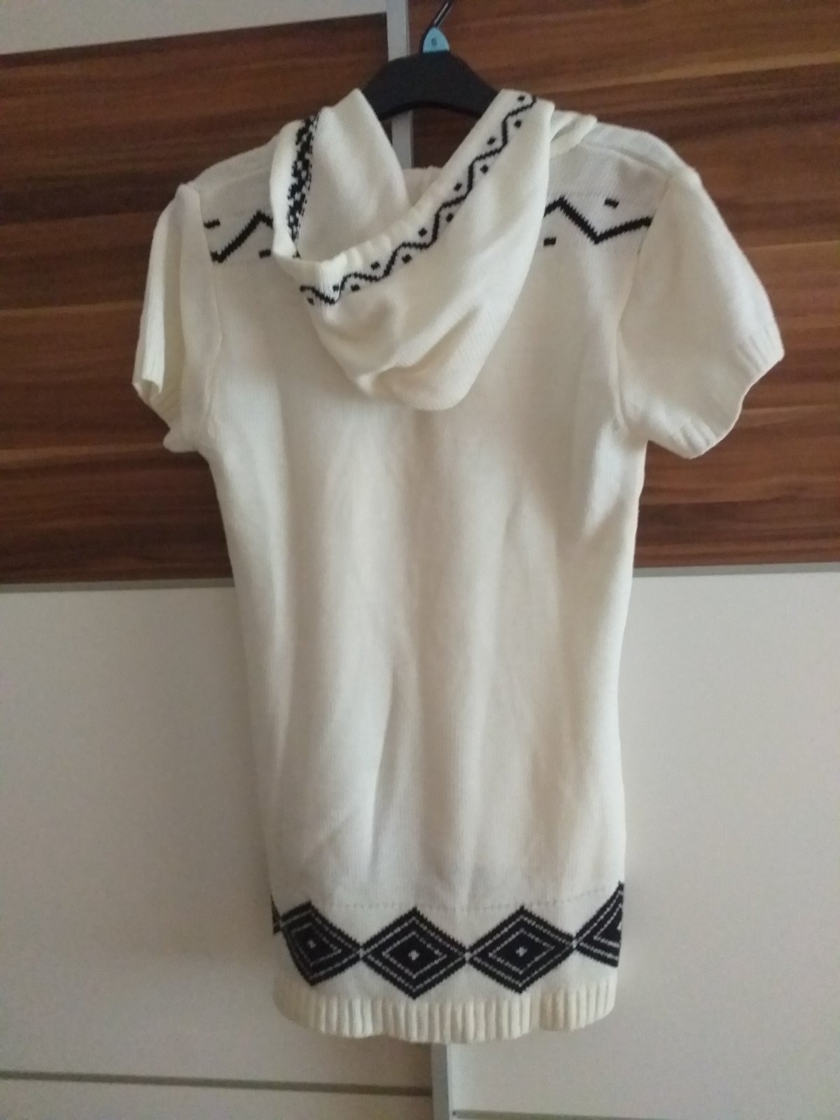 Predám dlhý biely (krémový) sveter s pásmy v dobrom nosenom stave bez poškodení. Zapína sa pri krku z oboch strán, čím vzniká rolákový efekt.