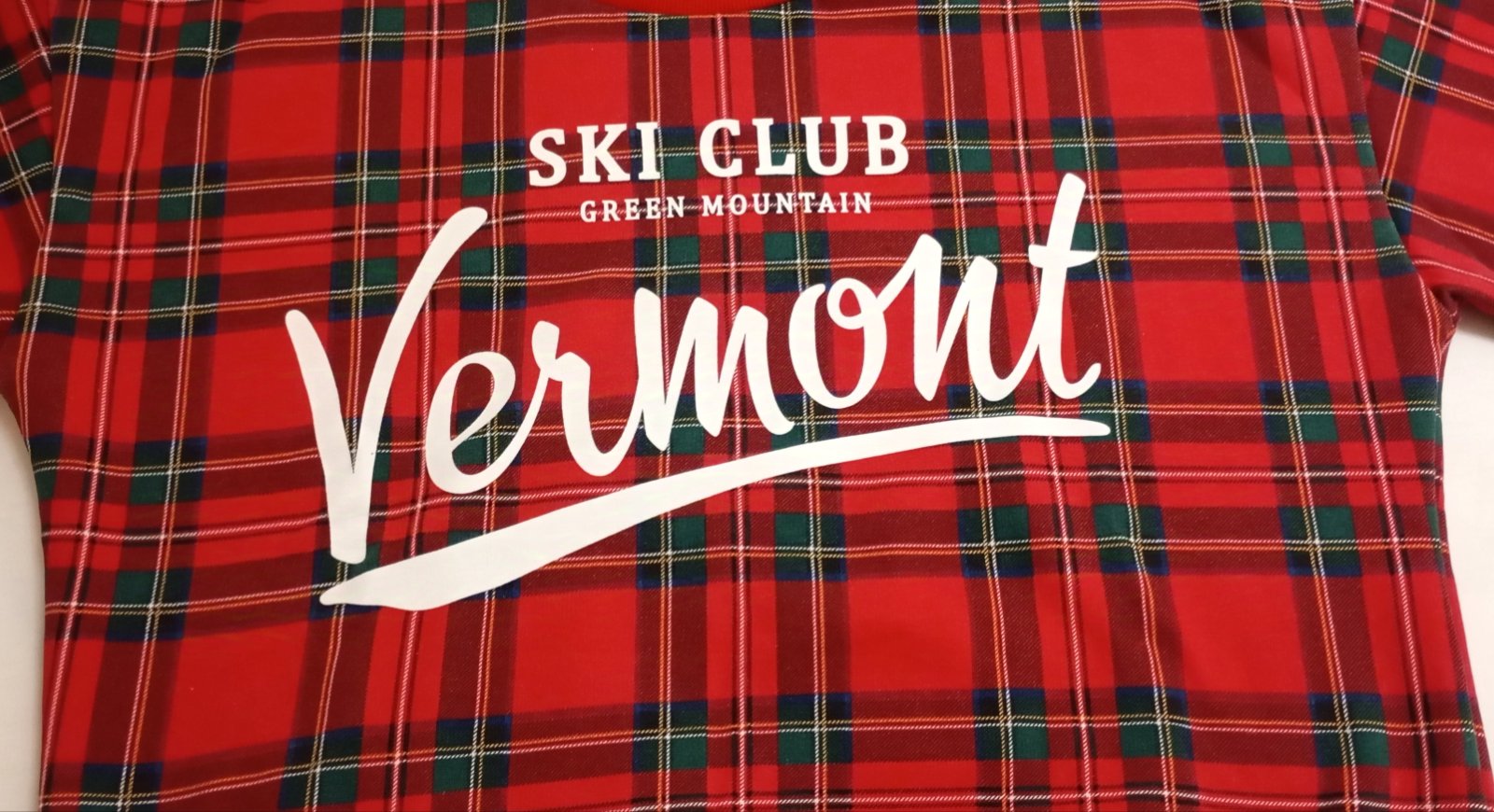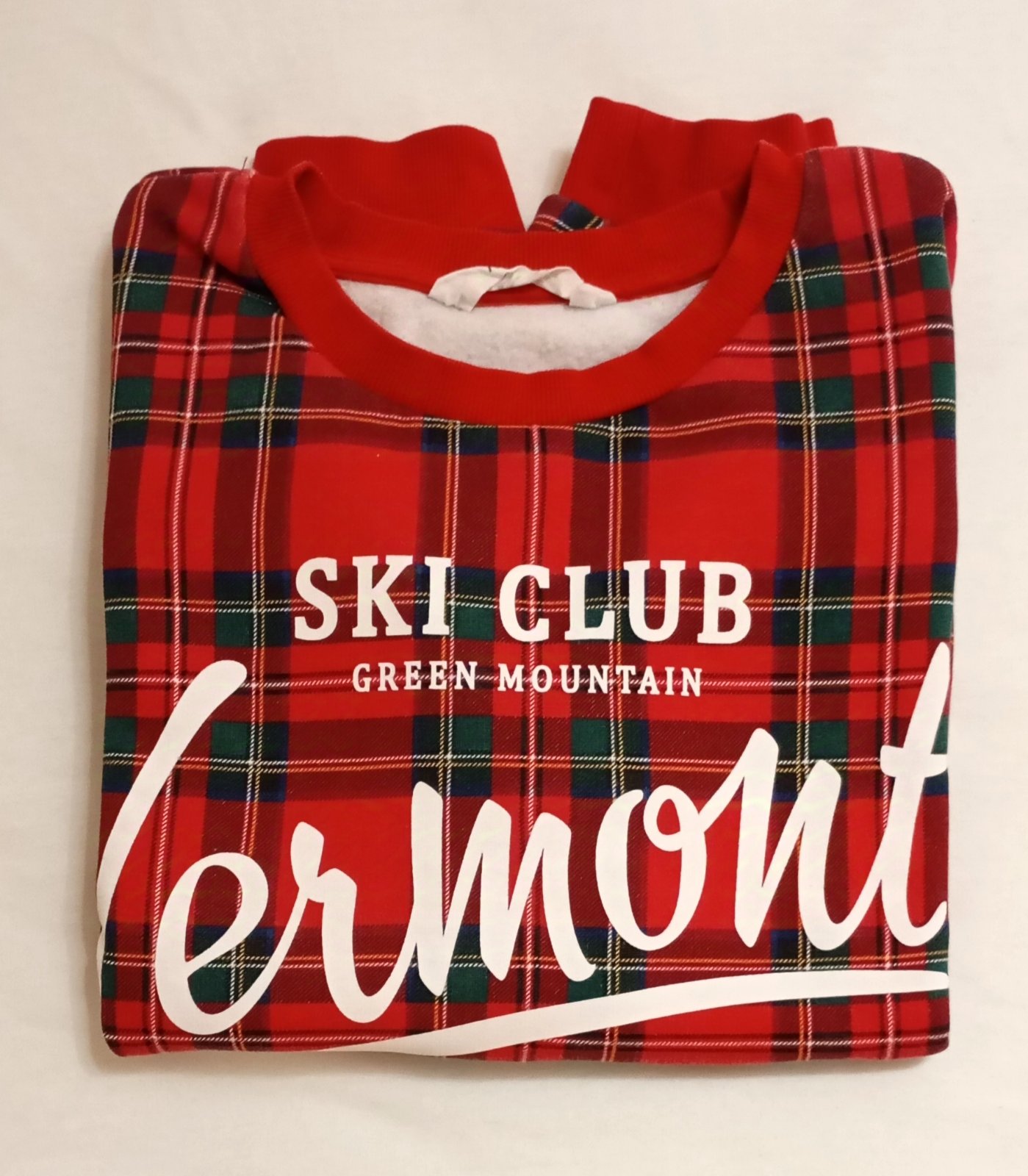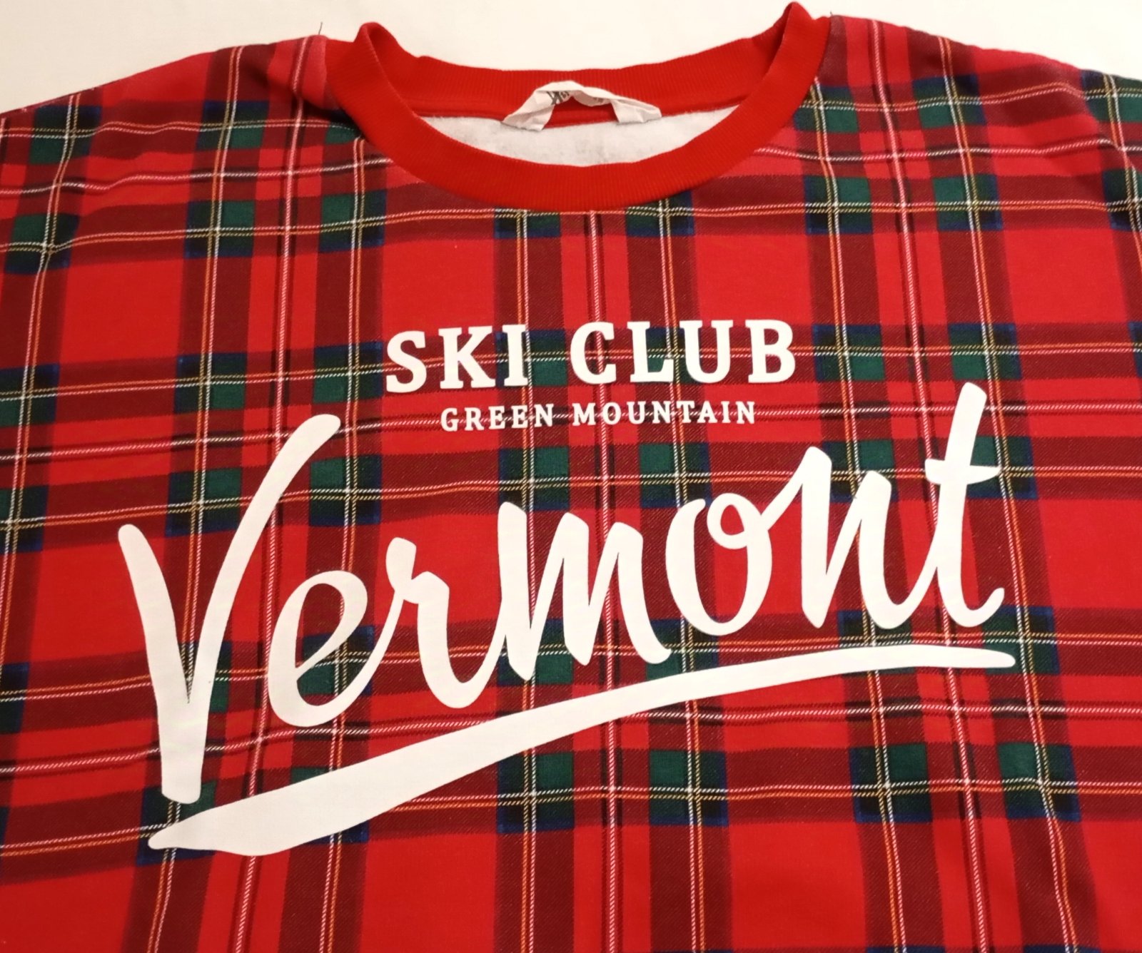 Červeno-tmavozeleno-čierna károvaná mikina/sveter s bielym nápisom "Ski Club Green Mountain Vermont". Strih je skrátený na štýl crop-topu. Zvnútra podšitá teplou bielou vrstvou.