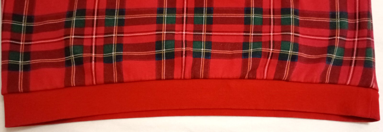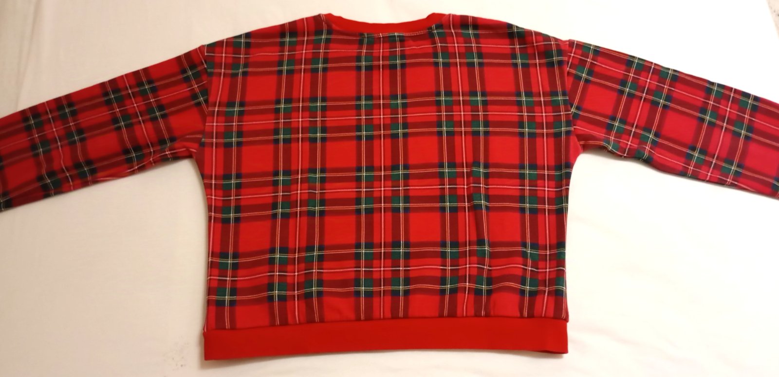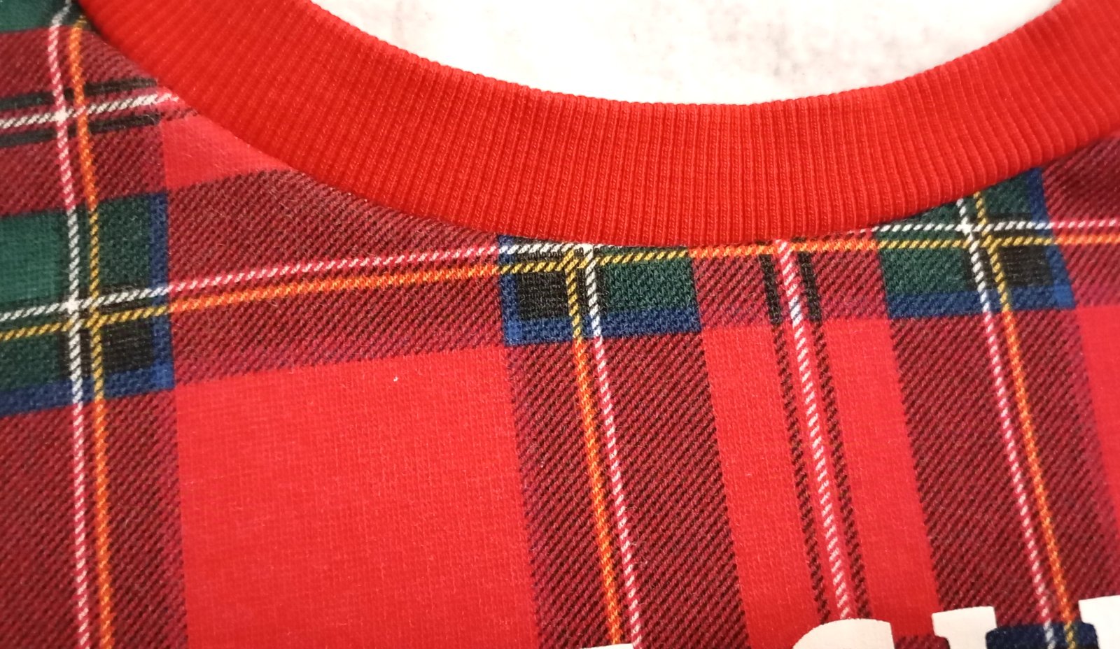 Červeno-tmavozeleno-čierna károvaná mikina/sveter s bielym nápisom "Ski Club Green Mountain Vermont". Strih je skrátený na štýl crop-topu. Zvnútra podšitá teplou bielou vrstvou.