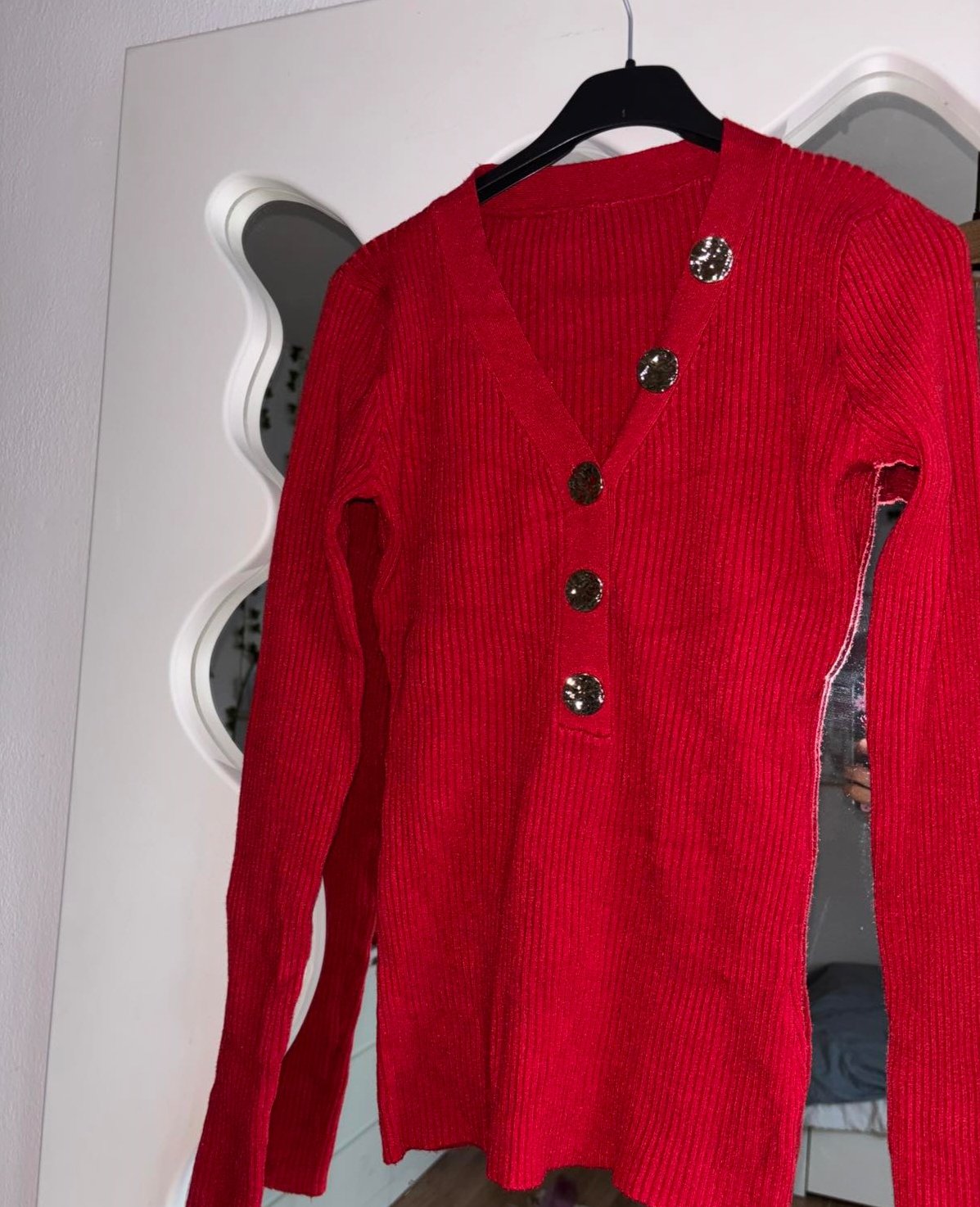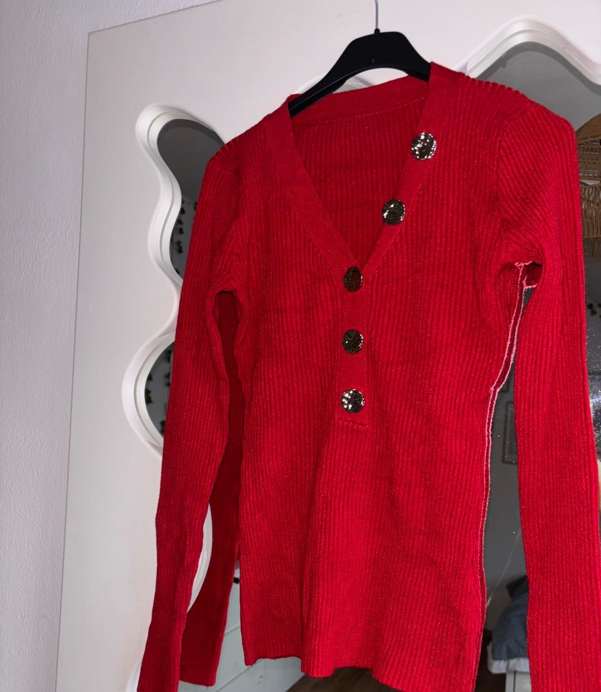 Výborný stav,jasnocerveny pružný svetrík, veľkosť S/M,s.pod pazuchami 38 cm,d.59 cm