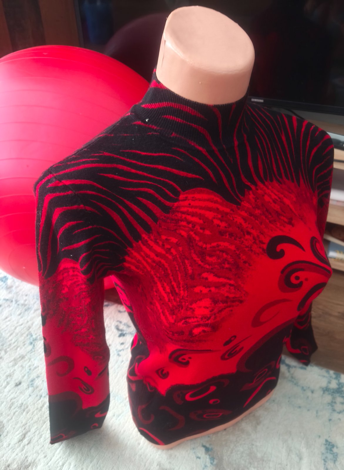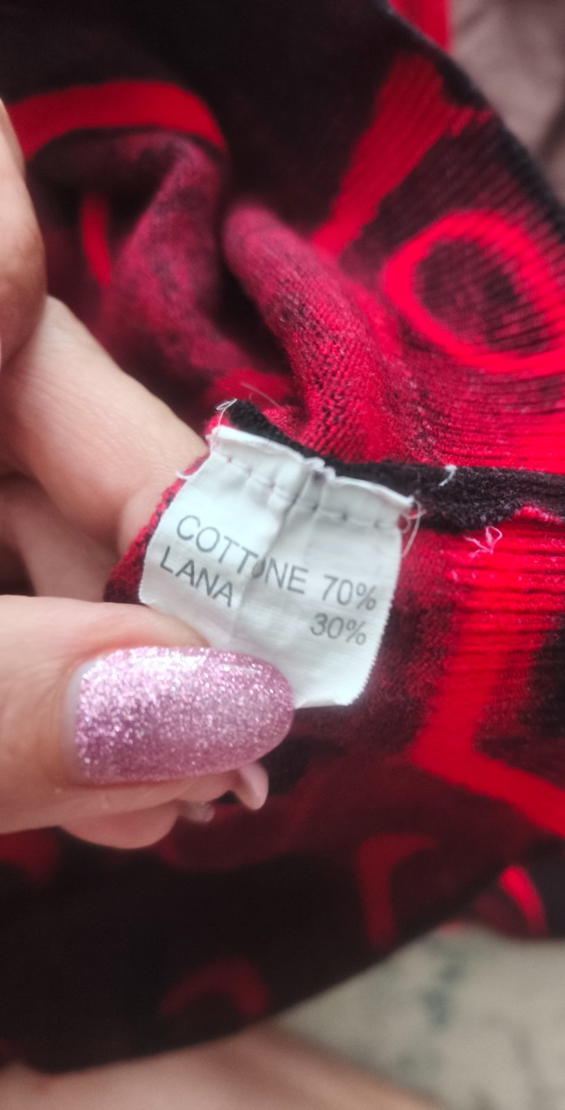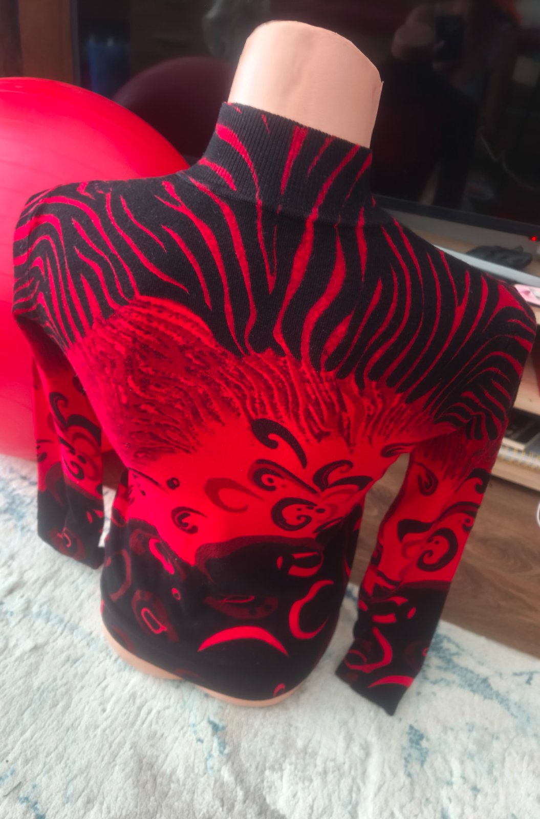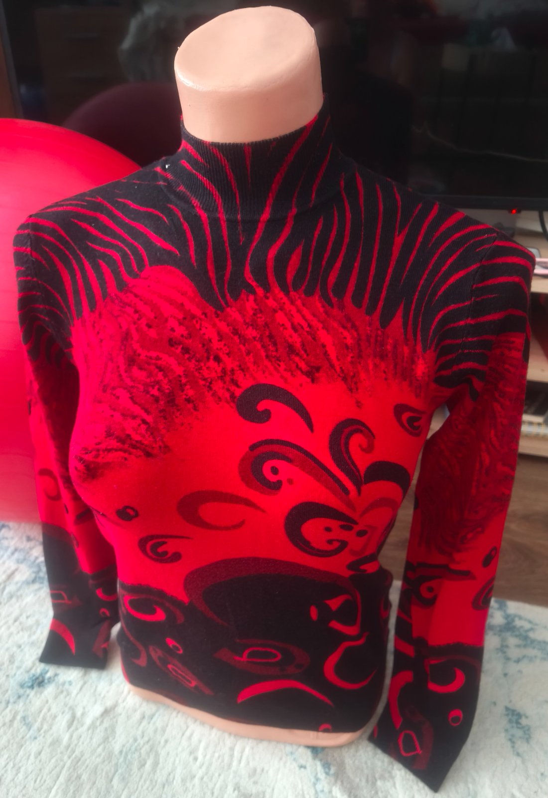 Tá červená farba nie je taká výrazná ako na foto je tmavšia. Veľmi pekný roláčik sadne na s/m, materiál je príjemný mäkký.