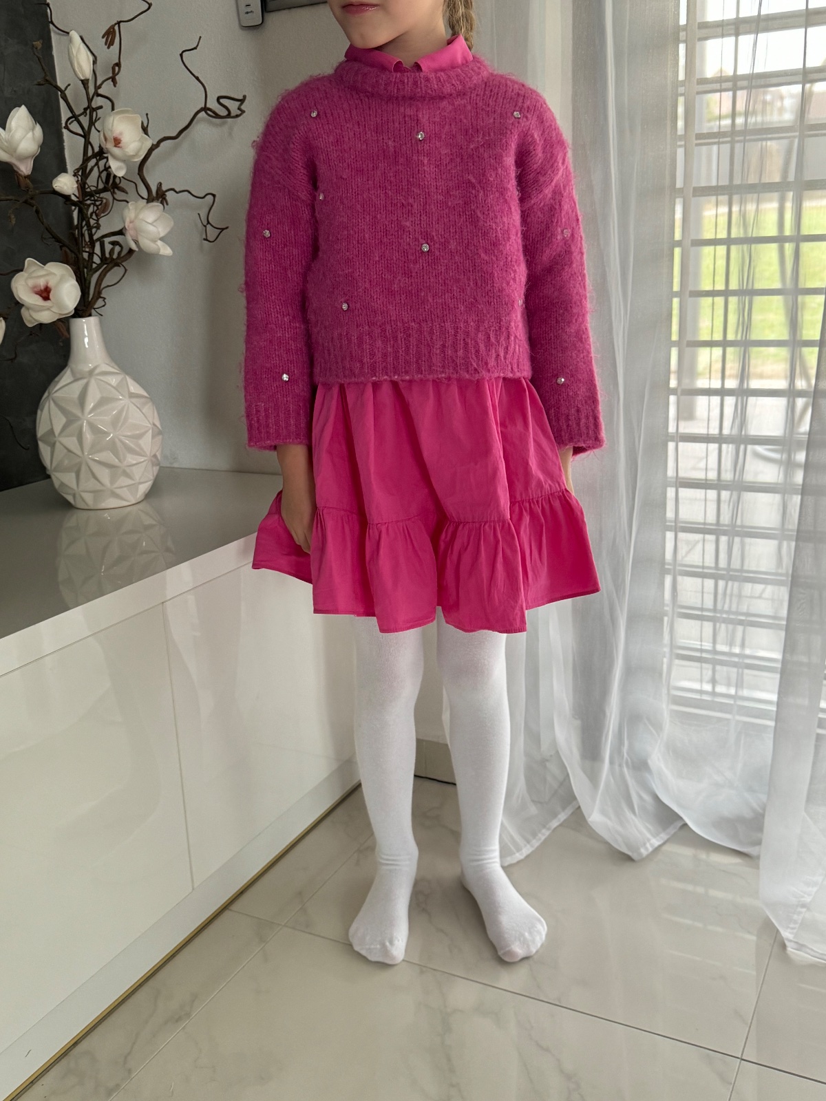 Predám pletený sveter s kamienkami v cyklamenovej farbe vo veľkosti 120 (6-7 rokov) pre malé parádnice. Značka Zara. Nosený dcérkou. Tým, že obsahuje alpaku je akoby zožmolkovaný, ale dá sa to odstrániť. Keď sa ošetrí, parádu ešte isto narobí.