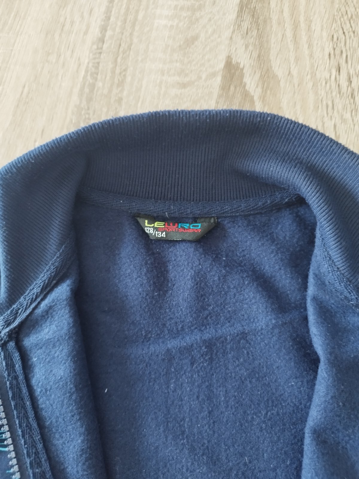 Bavlnená mikina 128/134, tmavomodrá, zn.lewro. celková dĺžka 50cm, šírka pod pazuchami 2x39cm, rukáv od krku 2x53cm, spodný rukáv 38cm. Jemne žmolky. Dobrý nosený stav, bez poškodenia.