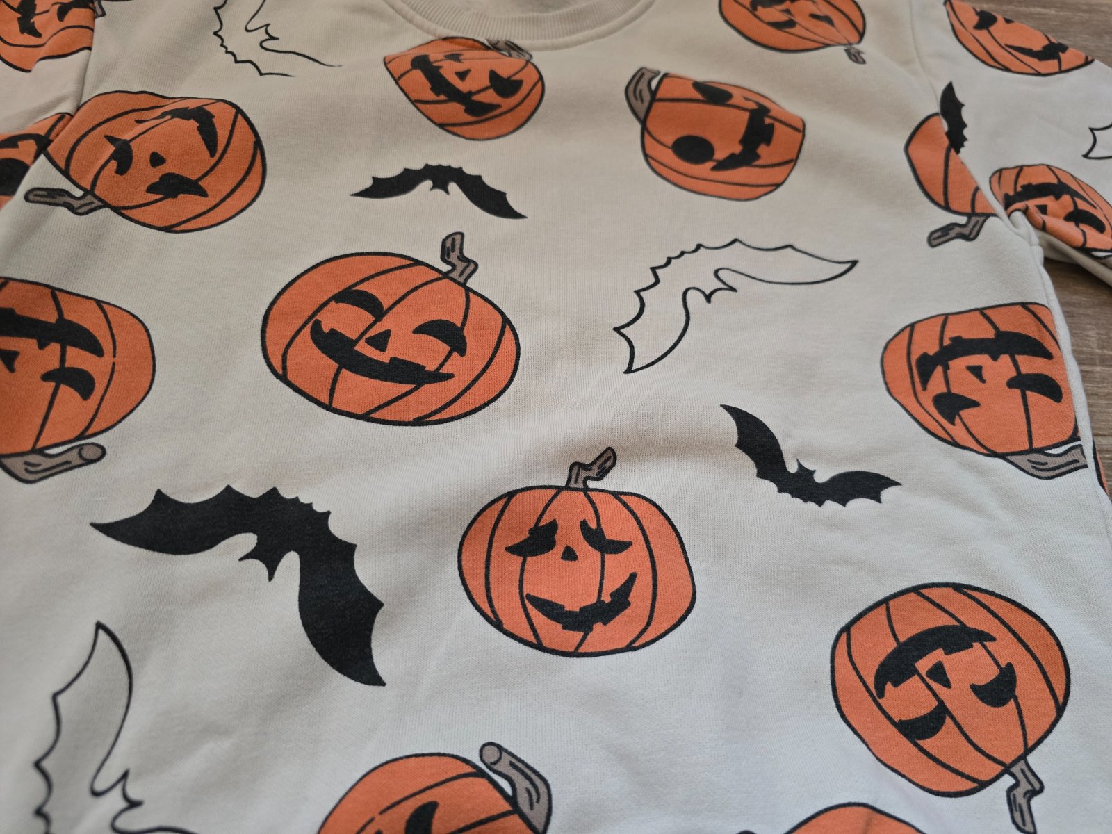 Oranžová mikina s potlačou s vysokým stojačikom. Veľkosť som dala 128 odhadom, nemáme už visačku.