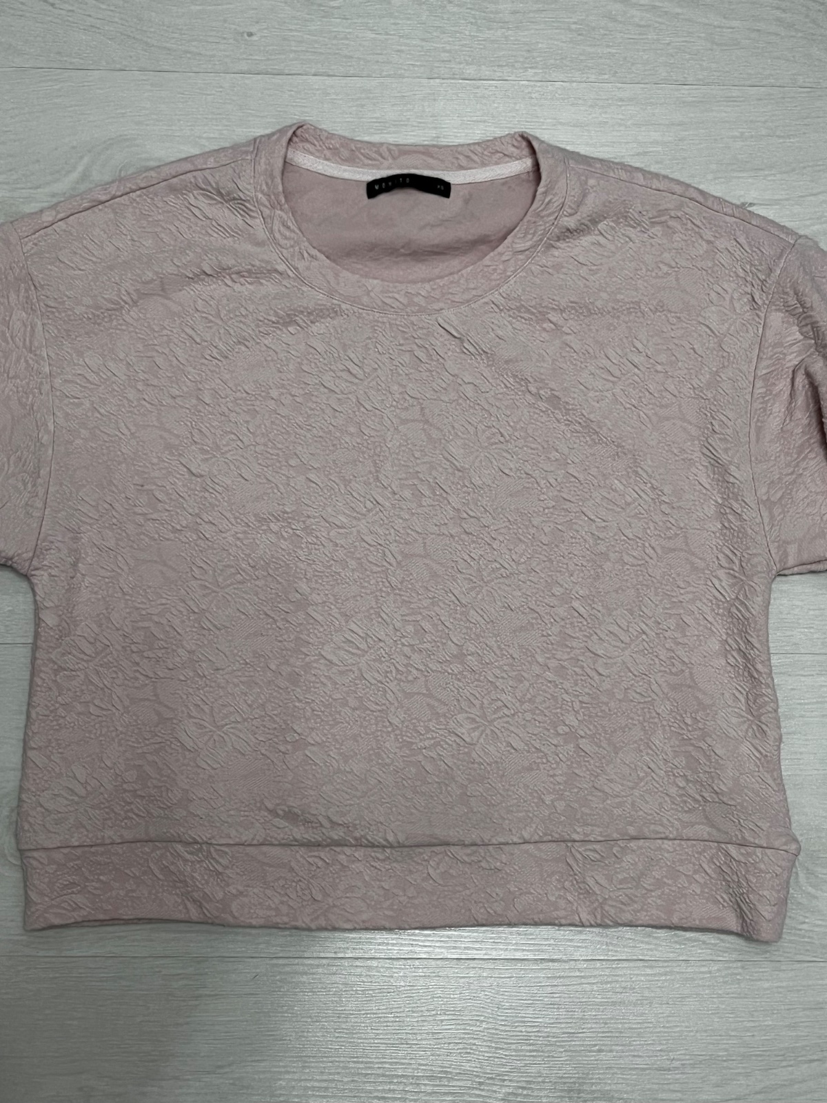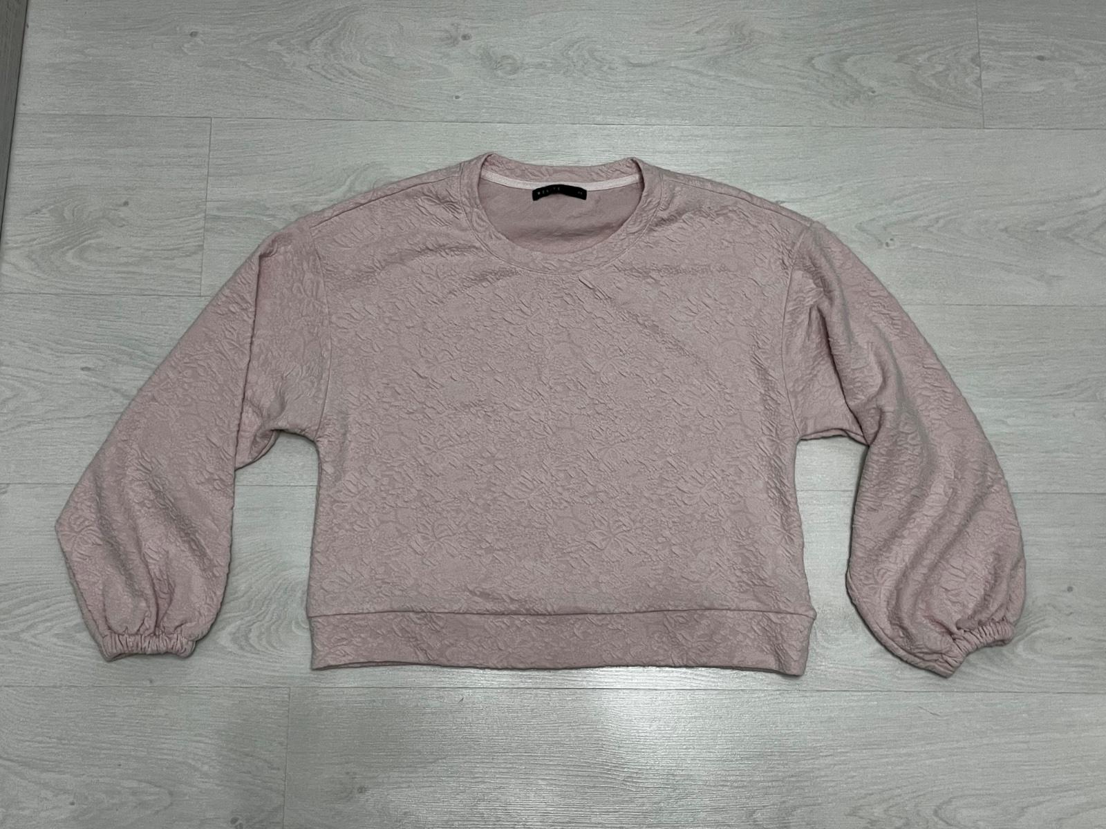 Mikina staroružovej farby, pekná jemná podtlač 3D, v dobrom stave bez poškodenia, rukáv voľný, široký nakonci stiahnutý gumičkou, dlžka rukáva 3/4
