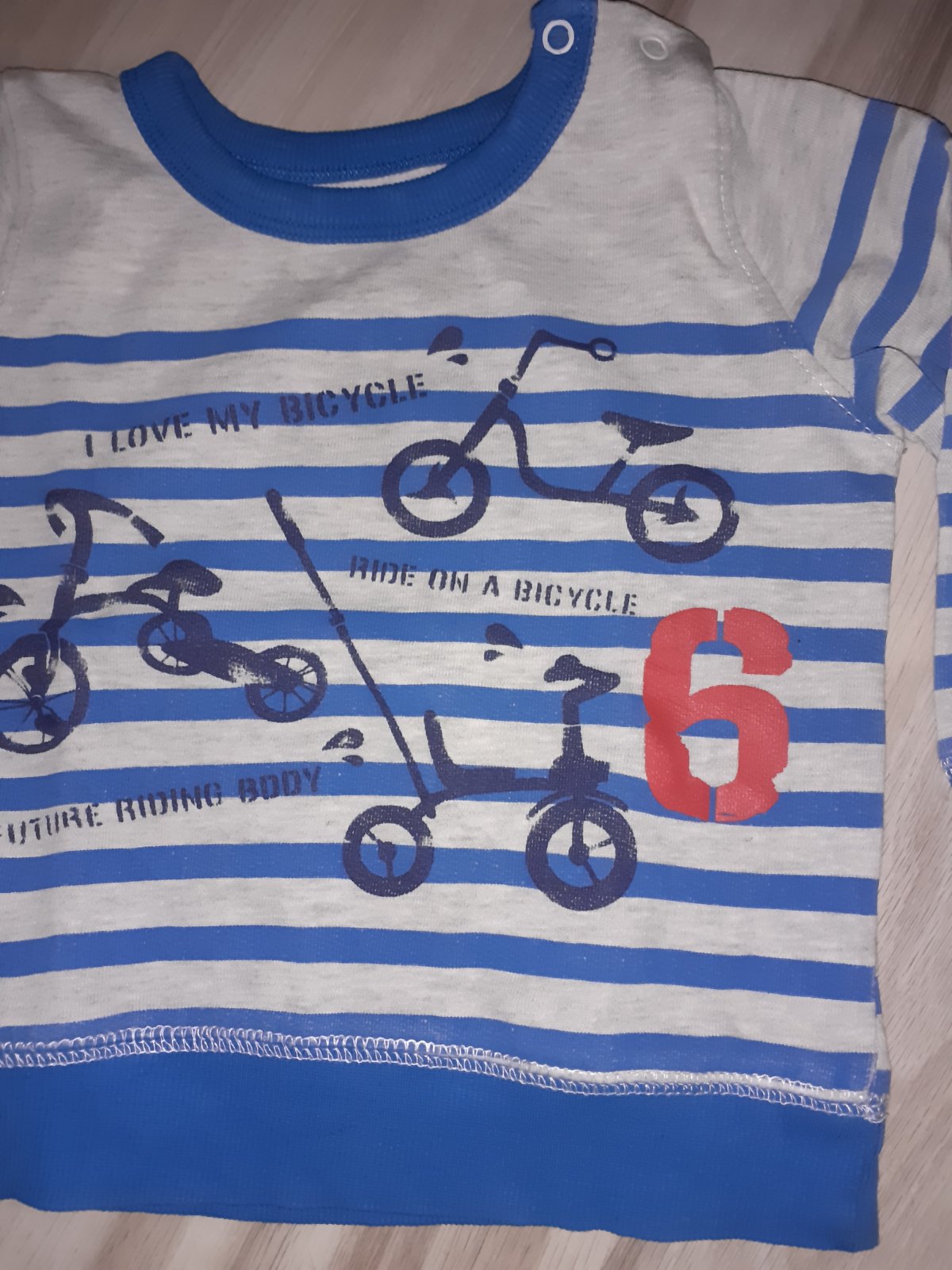 Bavlnený pulóvrik s potlačou pásikov a bicyklov, na ramene zapínanie cvočkami, nevyťahaný, nevyblednutý, bez fľakov, dier a žmolkov.