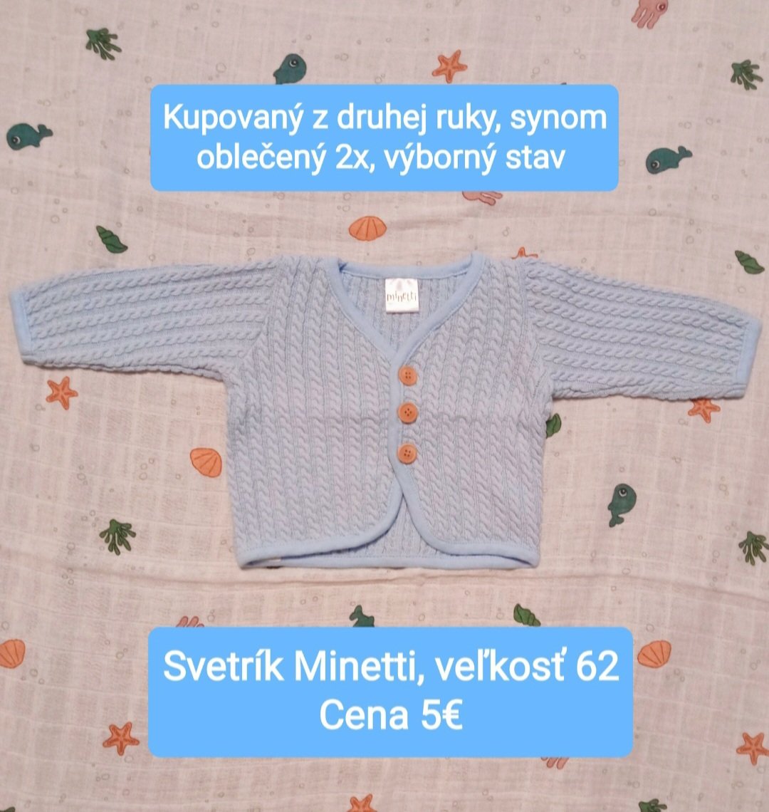 Ahojte 😊 Keďže tu rada nakupujem, idem skúsiť aj predávať. Mám väčšinou chlapčenské veci ale nájdu sa aj dievčenské. Väčsina je po jednom dieťati, v super stave, žiadne dierky ani fliačky, ak by predsa bolo nejaké poškodenie, mám to v popise. Pri kúpe viacerých vecí sa viem dohodnúť aj na cene. Posielam po prevode na účet buď packetou alebo poštou podľa cenníka. Osobný odber je možný v Piešťanoch pri Lidli na bratislavskej. Recenzie mám najmä z fb zo sreenov, v prípade záujmu pošlem.