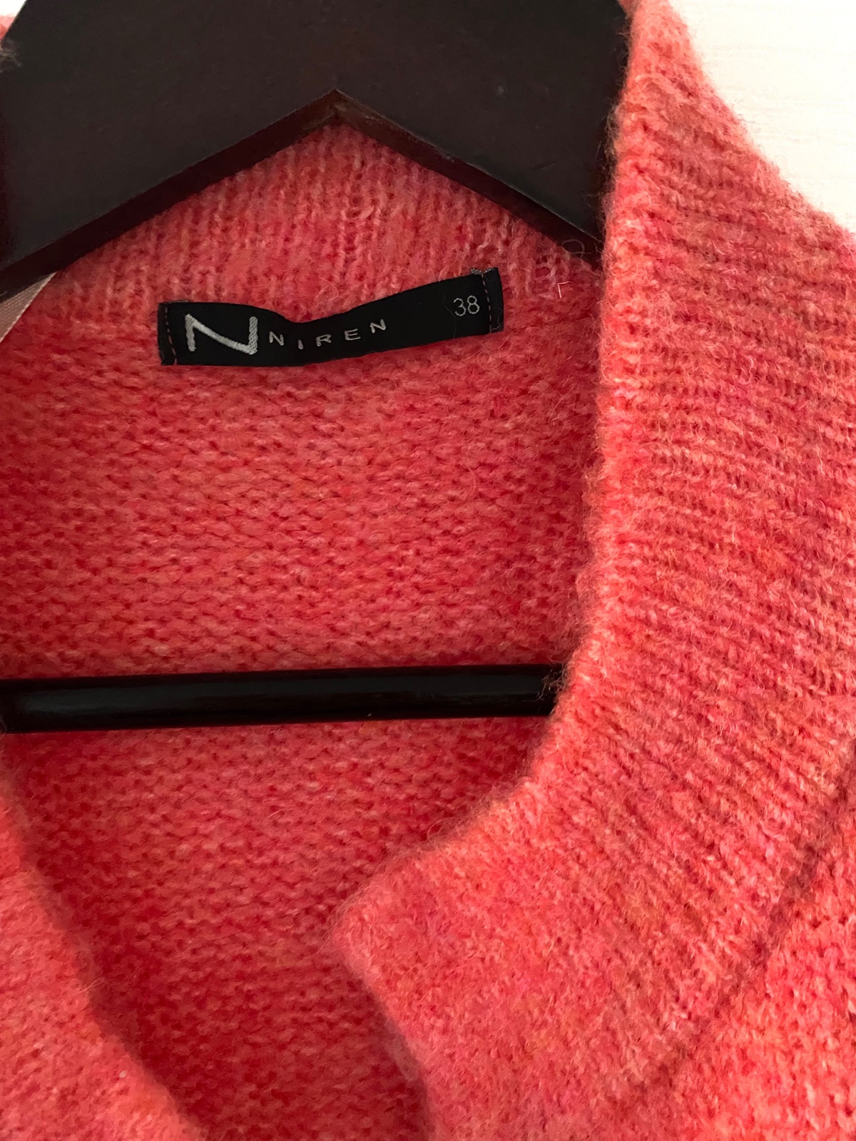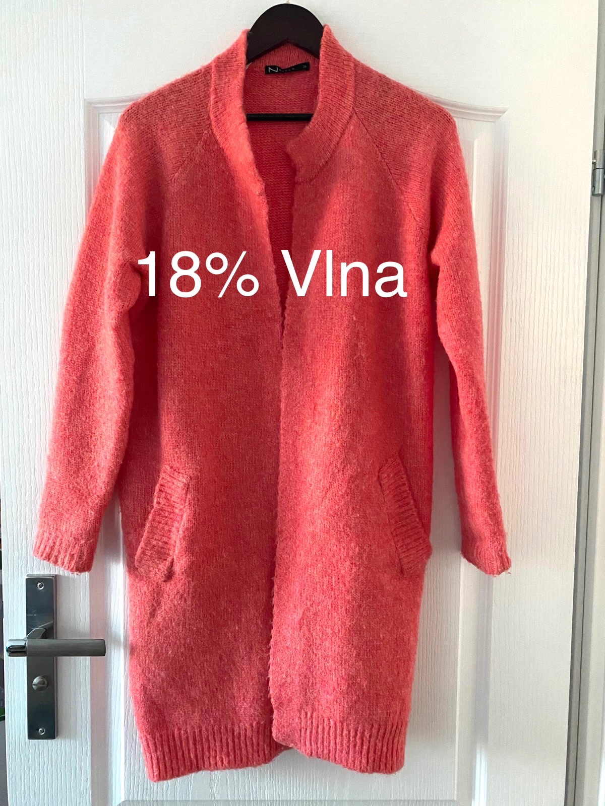 Dlhý marhuľový kardigan z vlnenej zmesi. Má bočné vrecká a vyšší golier pri krku. Je otvorený vpredu a má širšie rukávy. Je perfektný ako kardigan cez bielu košeľu alebo rolák, alebo ako kabát na jarné dni. Povedala by som, že veľkosť M; všetky miery sú na fotografiách.