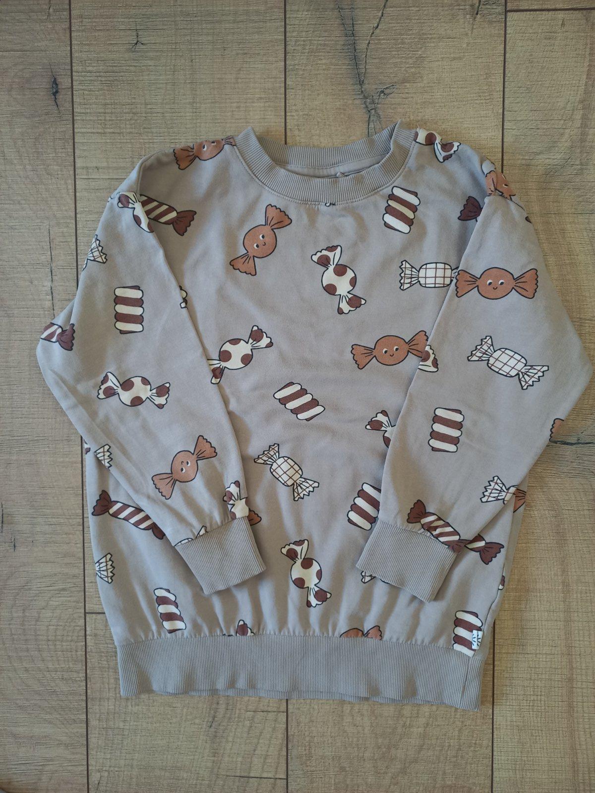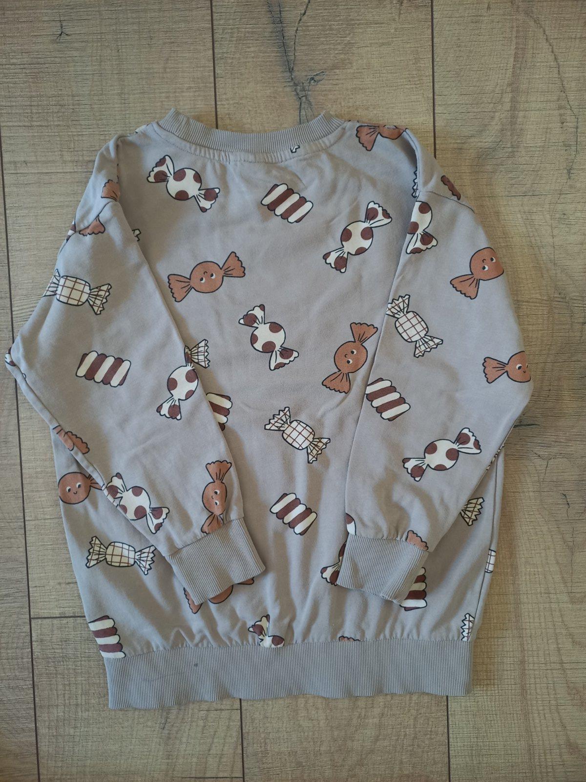 Mikina z Lindexu s chutnou potlacou cukrikov, velk. 128. Na spodnej manzete vzadu je mini popisana fixou, vid posledna foto, mozno pojde vyprat. Zohladnene v cene.