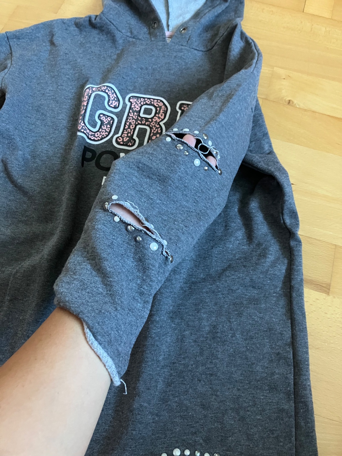 Pekná predĺžená mikina s aplikáciami na ruke imitácia dier, bez poškodenia