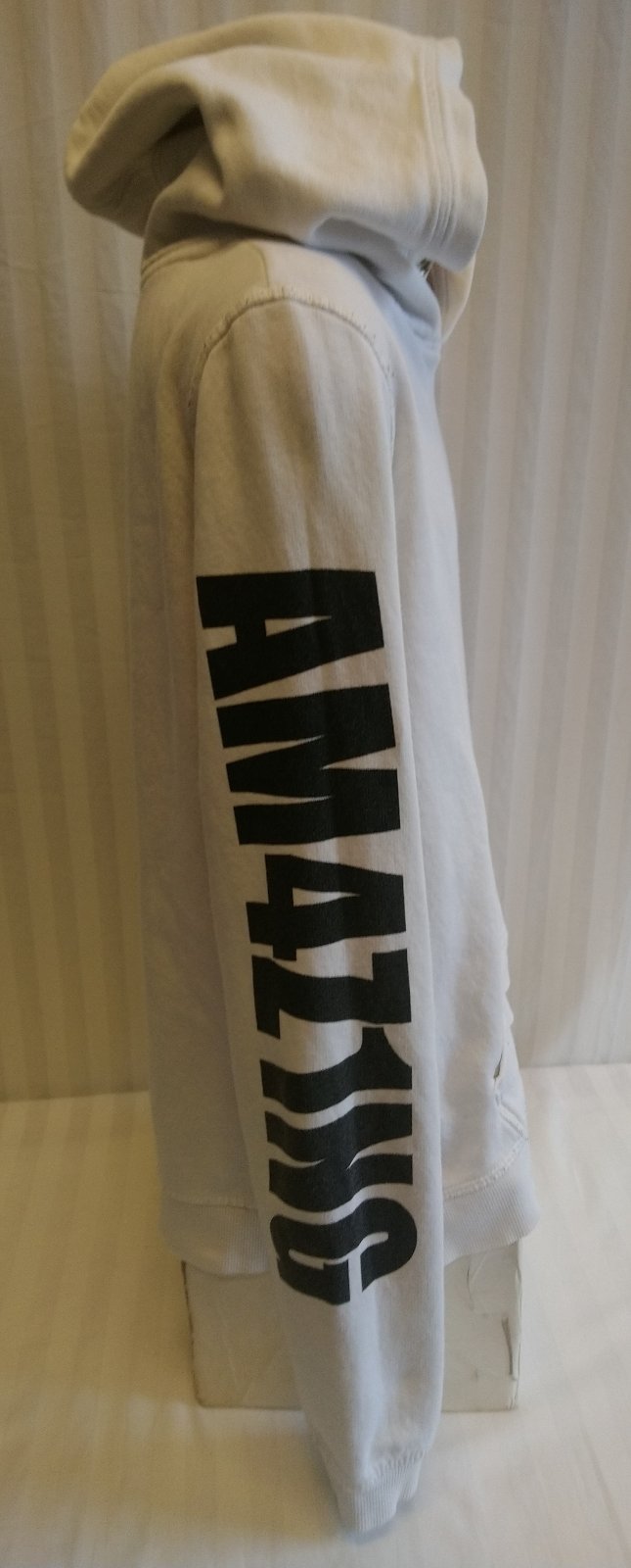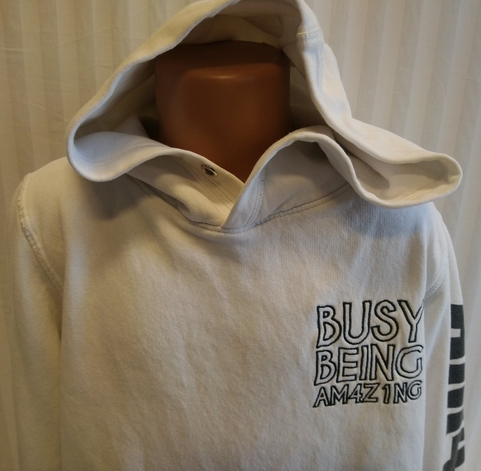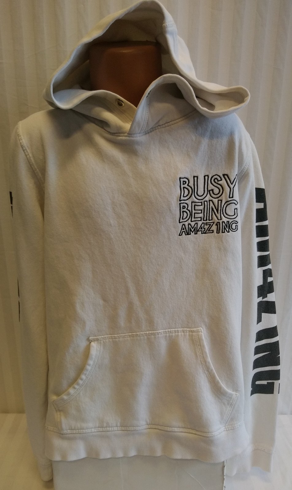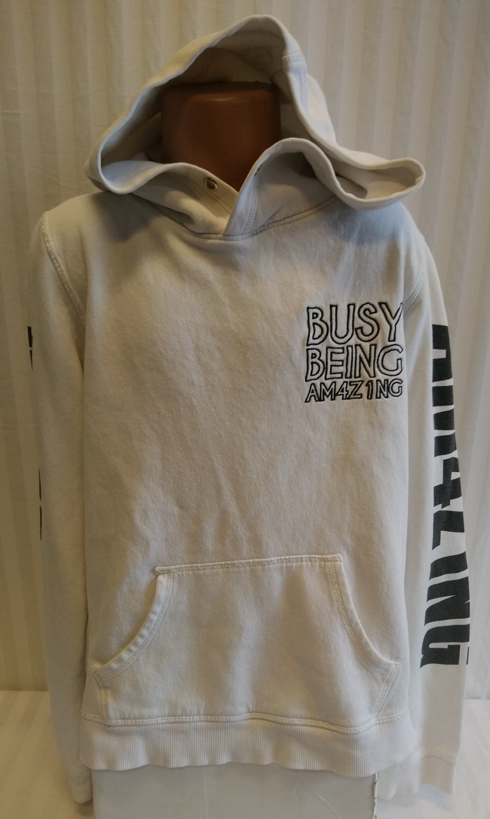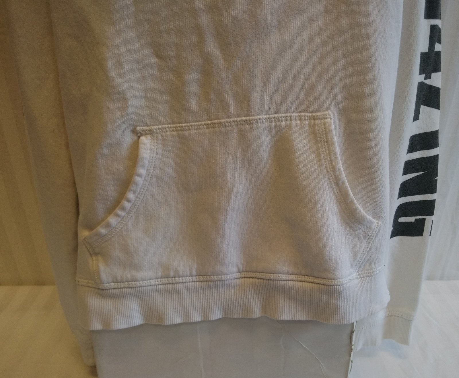 biela mikina s kapucňou s nápismi, klokanie vrecko,