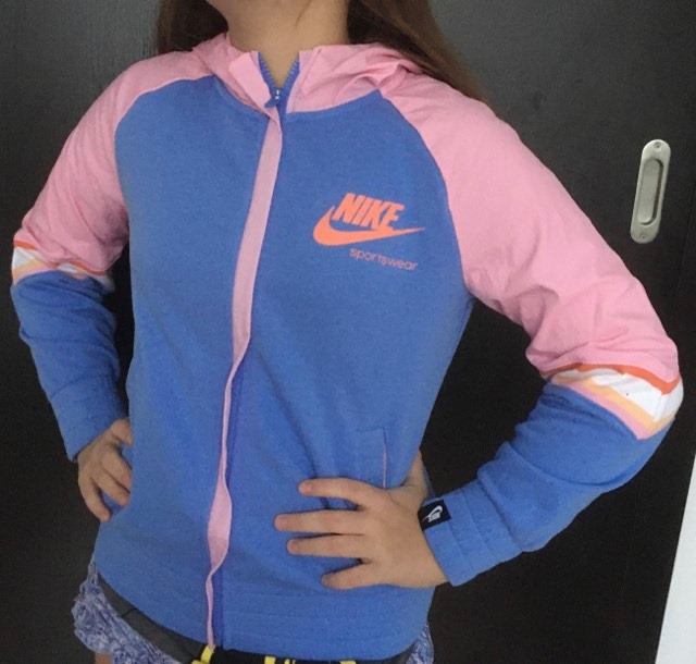 Ponúkam perfektnú mikinu. Krásna, farebnosť - ružová, bledo-fialková, biela oranžová. Nosila som ju prevažne v lete na tričko ako veľ. XS/S, písaná veľ. 146-156 cm.
