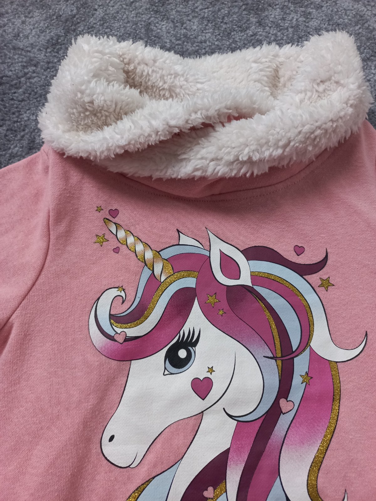 Malo nosena tepla dlhsia mikina s hunatym, vyssim krkom, jemne zmolky z prania, volnym okom nie su vidiet. Znacka Dopodopo (Takko), velkost 110.