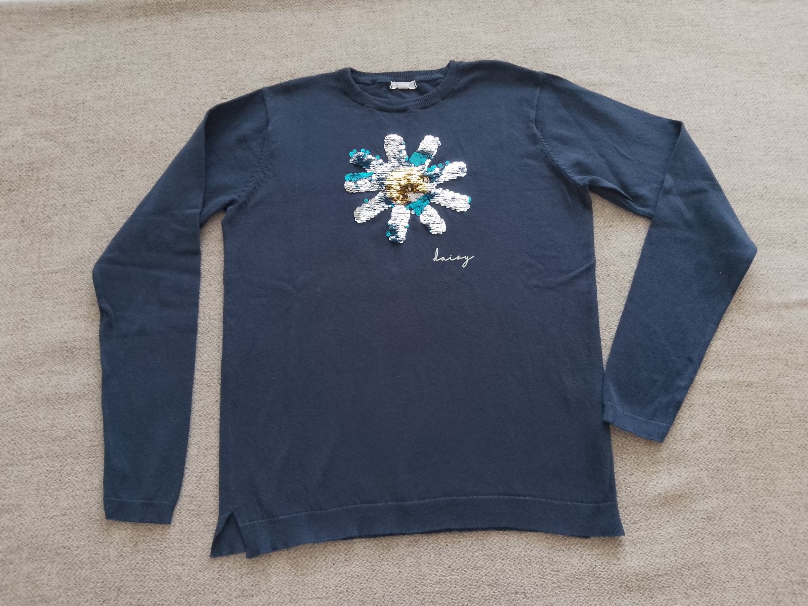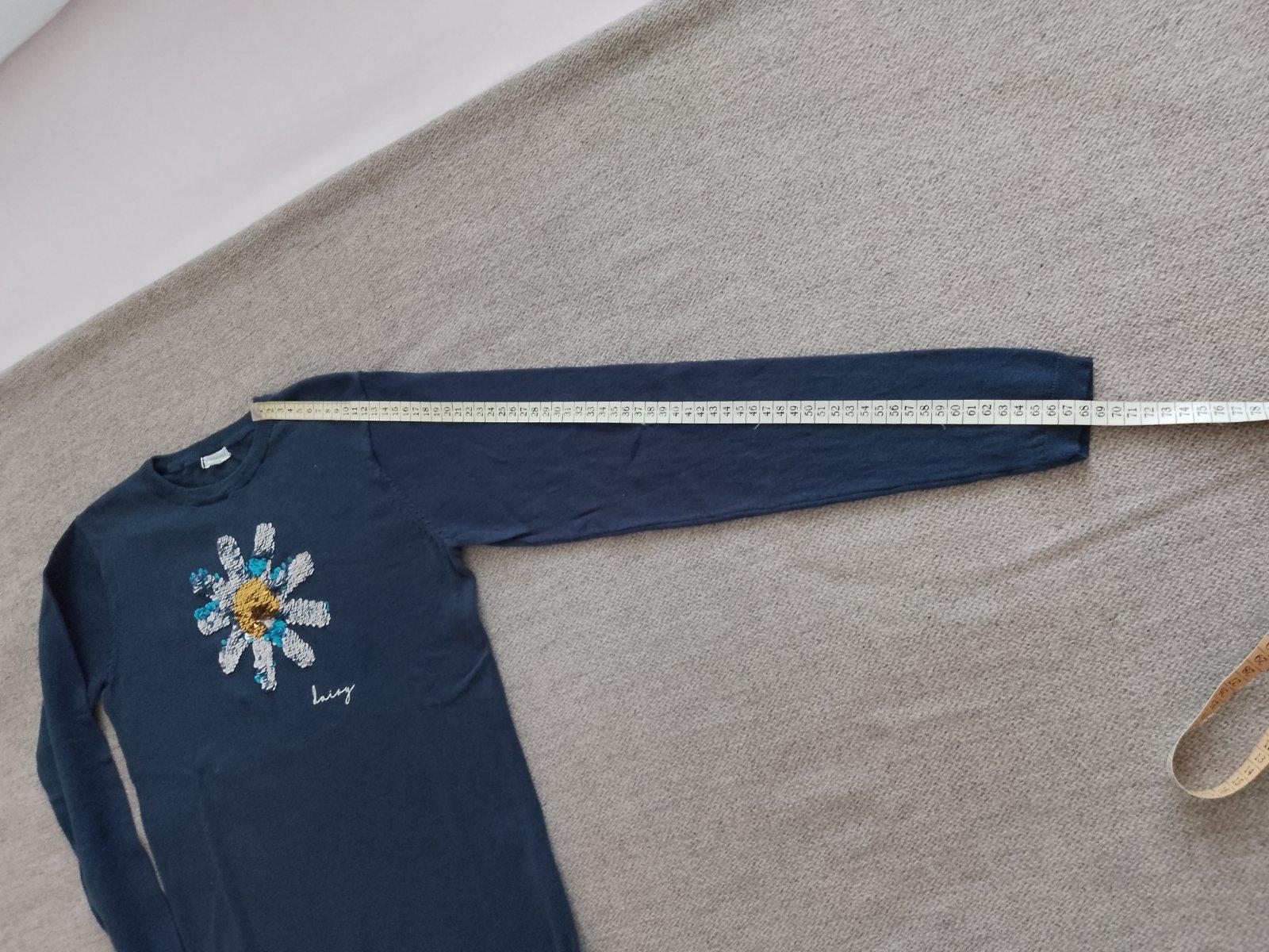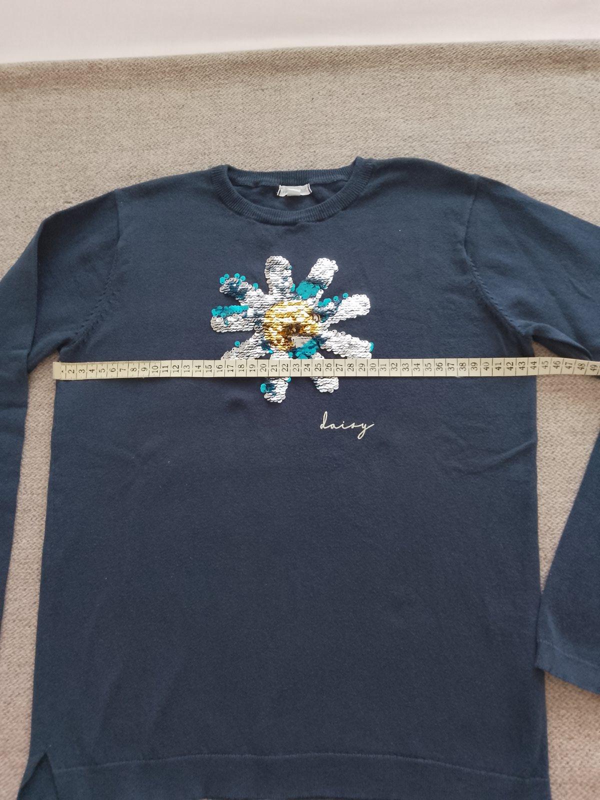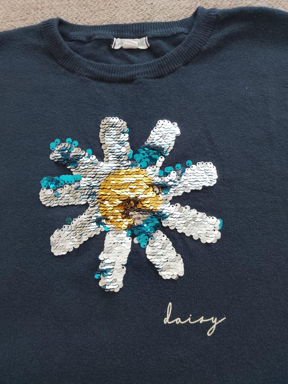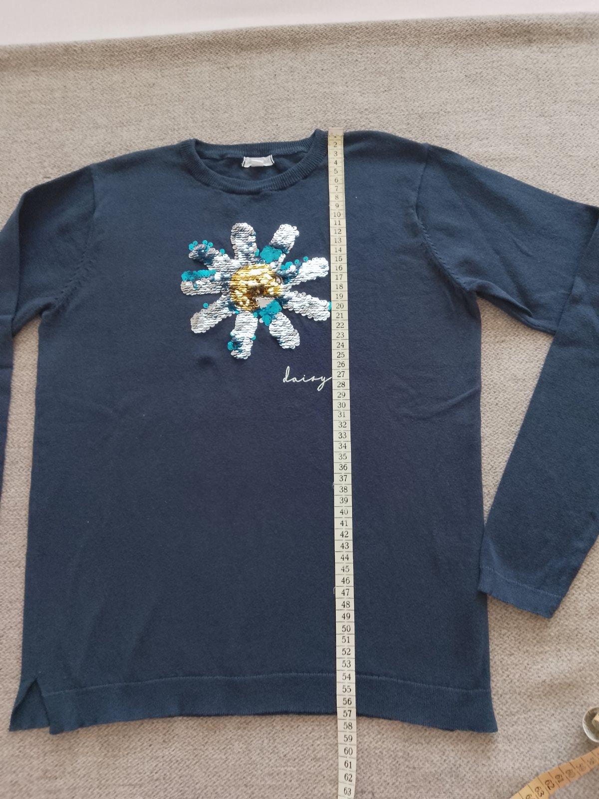 Dievčenský svetrík nenosený, len opraný. V TOP stave. Rozmery - viď foto. Na prednom diely je aplikácia z premieňacích flitrov.