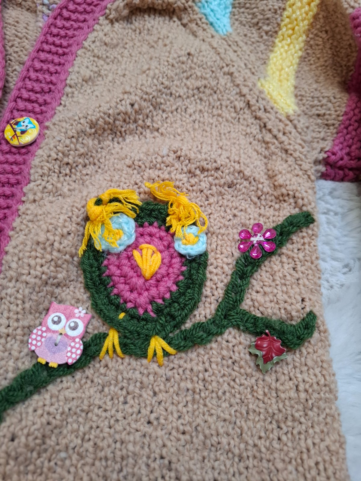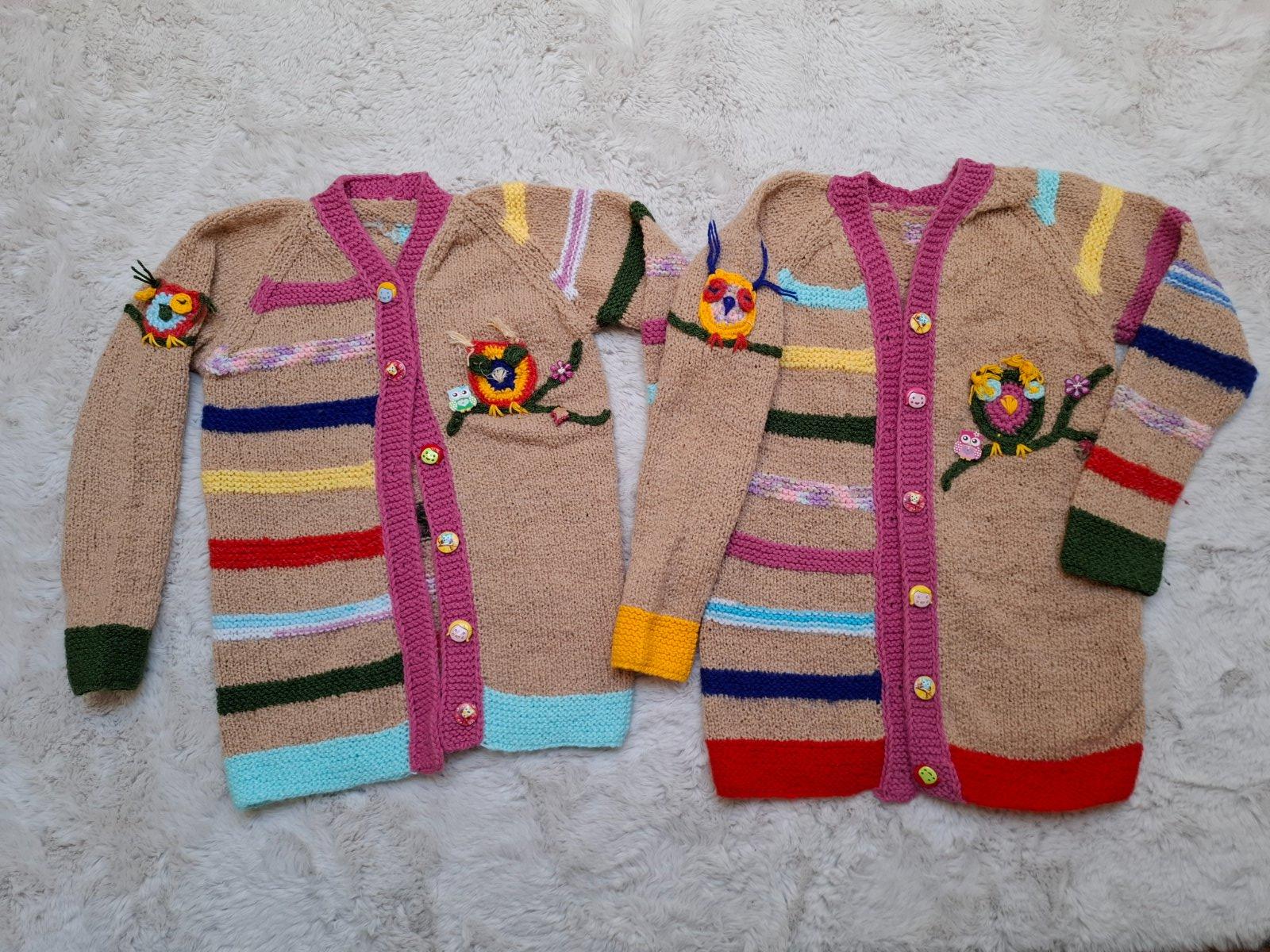 Rucne pletené svetre so sovickami, veľkosť cca 152, cena za kus 5,50 Eur, spolu 10 Eur