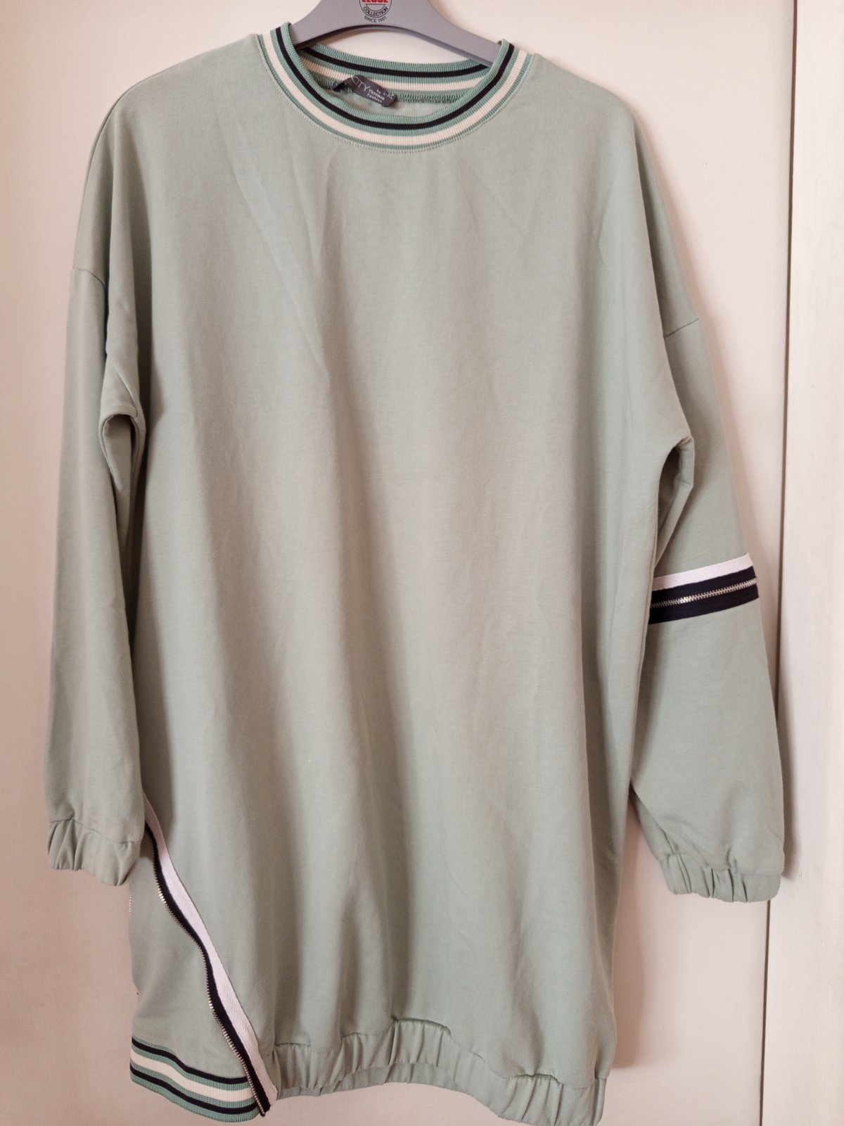 Mikina tenšieho materiálu, široký strih, je nenosená, bola iba opratá, bavlnená. Šírka 63cm, šírka dole v patente 48cm, dĺžka 58cm.