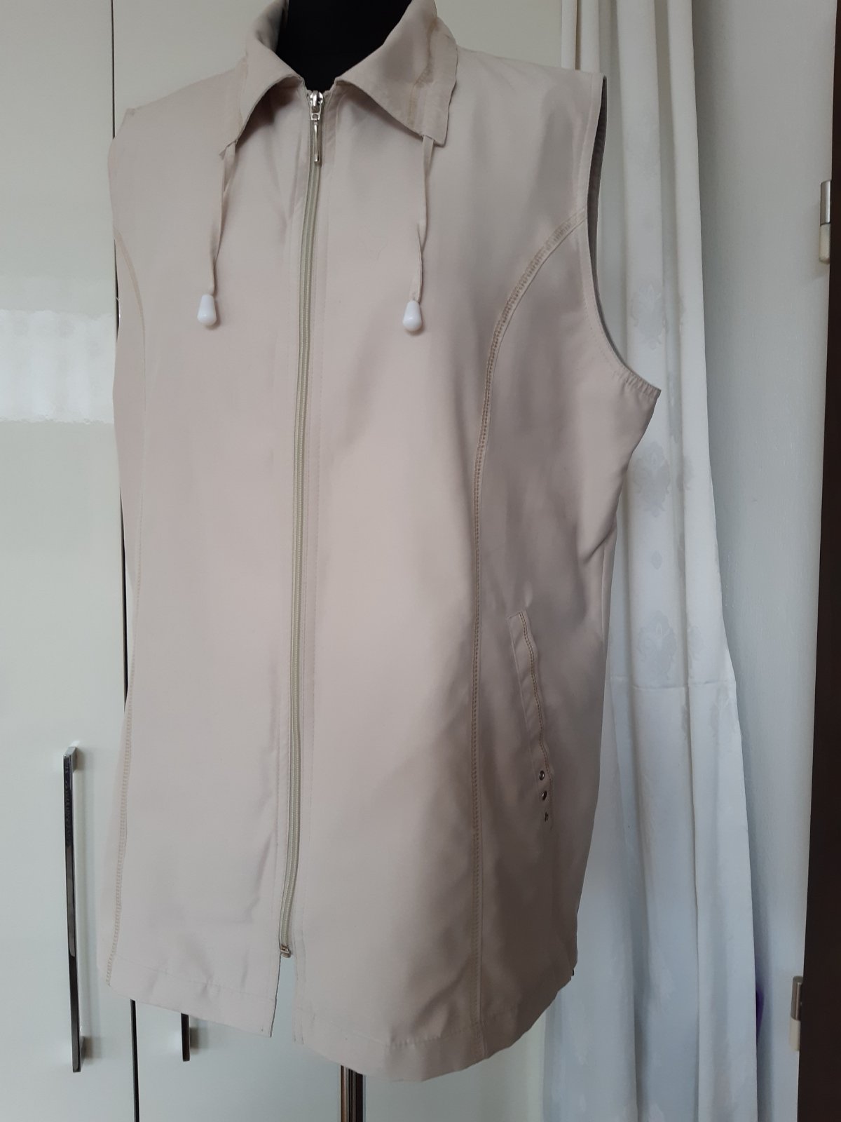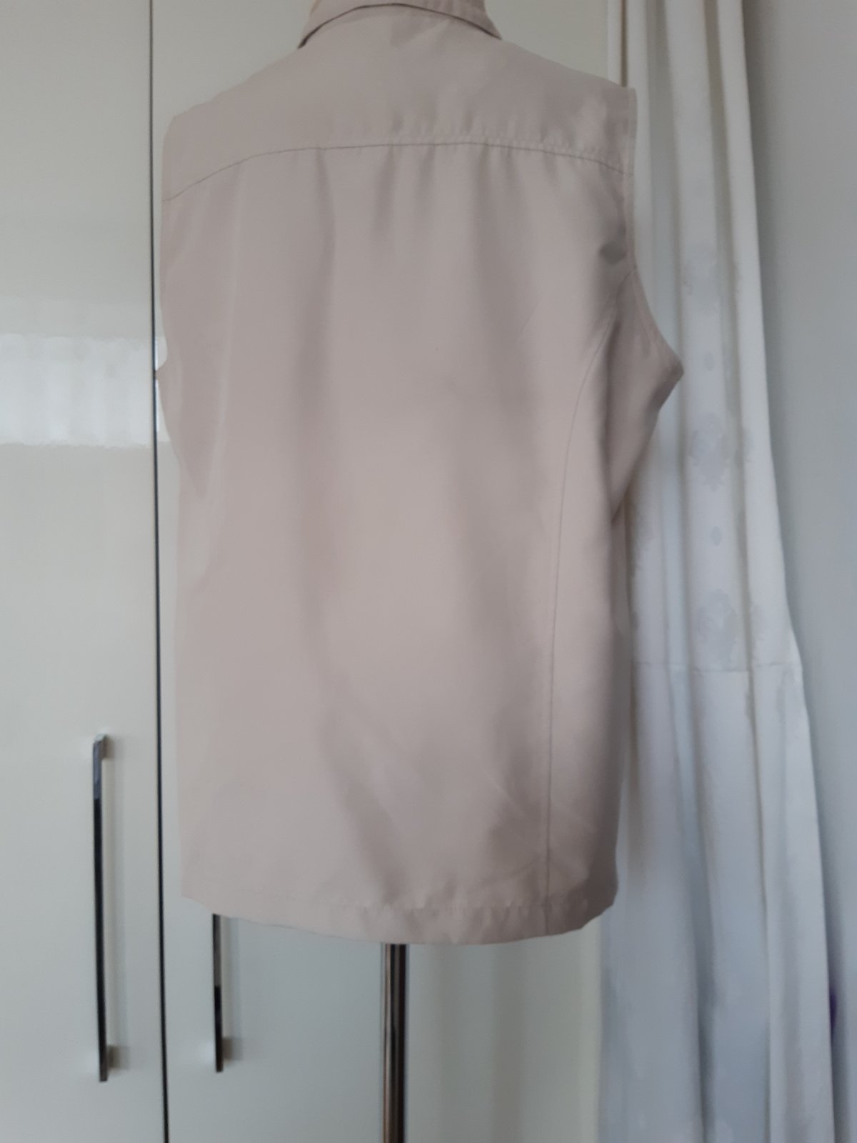 Príjemná vesta na prechodné obdobie má podšívku. Materiál je ako balonový, aký býva na ja prechodnom oblečení., 88% polyester, 12% nylón. Dl. 71 cm, šírka cez prsia 61x2 cm. Na bokock sú rozparky na zips. Vesta je vo výbornom stave, bez poškodenia..