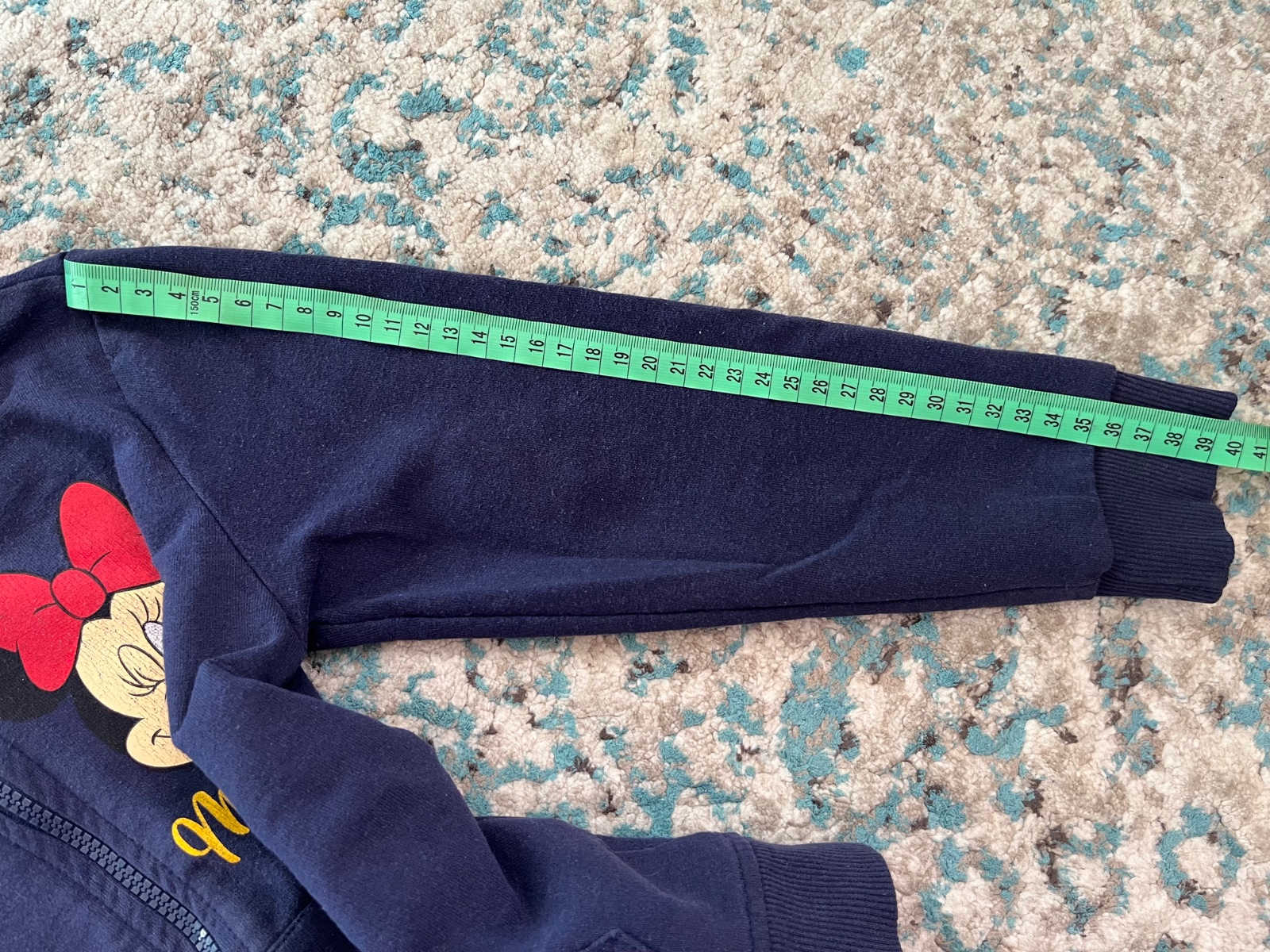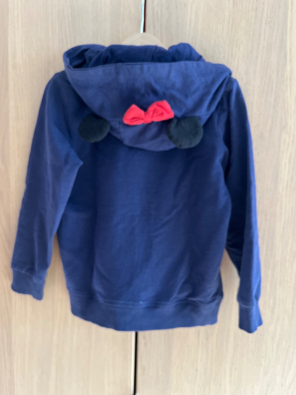 Mikina je vo fajn stave. Má kapucňu s mašličkou a uškami. Má známky nosenia, minižmolky a popraskanú aplikáciu. Stále však nositeľné, bez dier či fľakov.