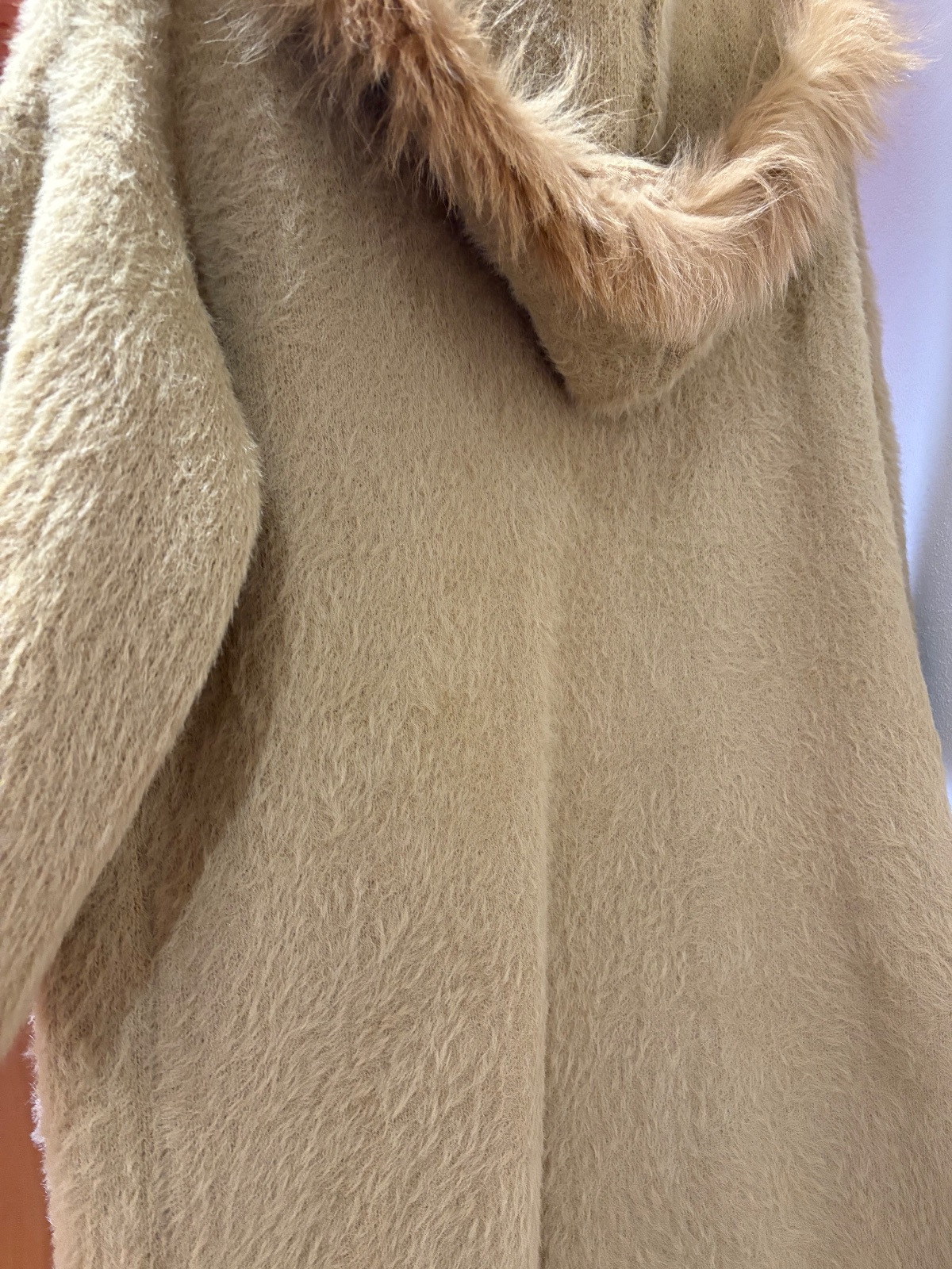Kardigan z alpaky s kapucňou bez zapínania. Pekná béžovo medová farba , mala som ho 2x triedim šatník. 3/4 rukáv.