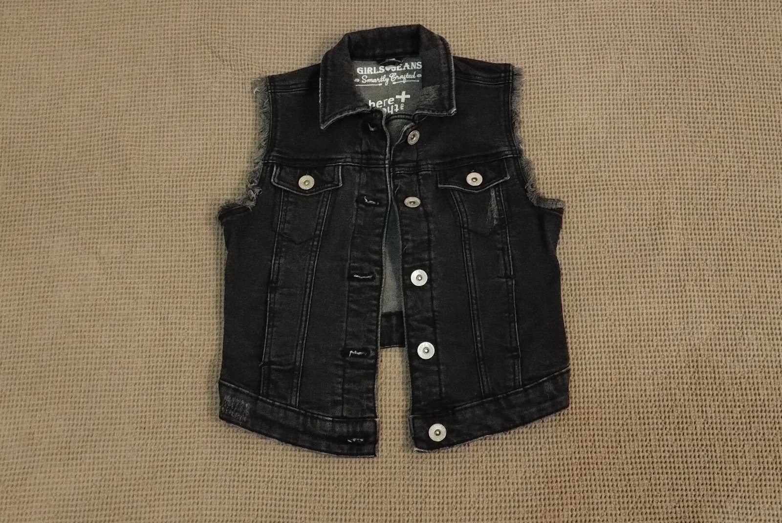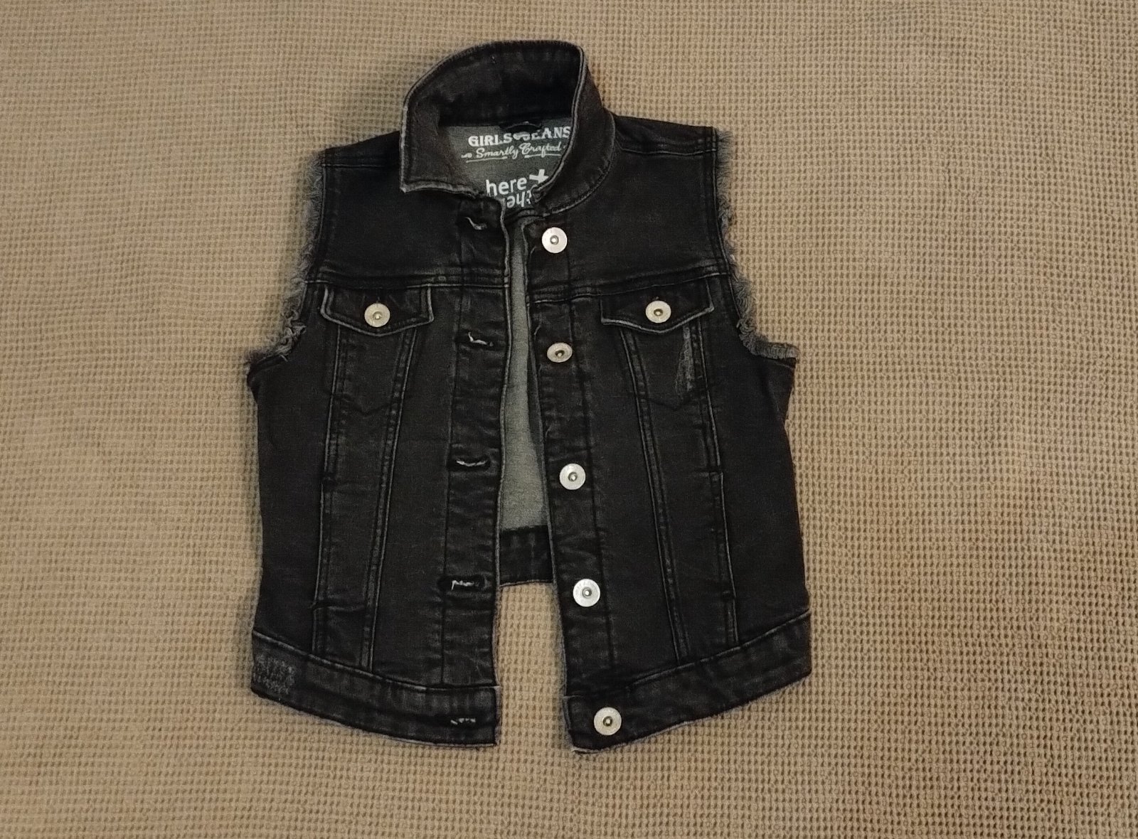 Riflová vesta v top stave, bez poškodení. Veľkosť uvedená 134, ale podľa rozmerov ju dávam do veľkosti 128...dĺžka predného dielu je 41cm, ZD je kratší...imidžovka