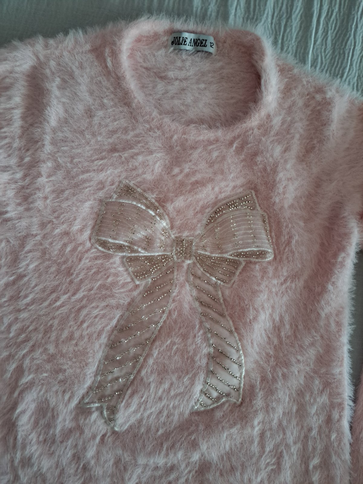 Nenosený chlpaty jemný svetrík s mašľou , písané na 12 rokov ale je menší, tak na 10 rokov. Elastický