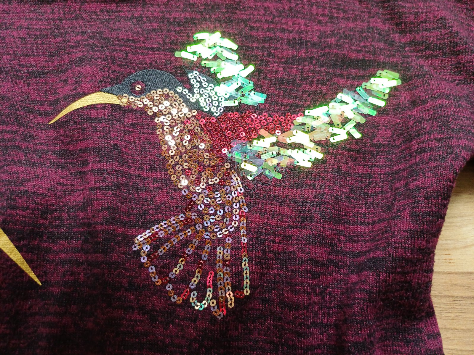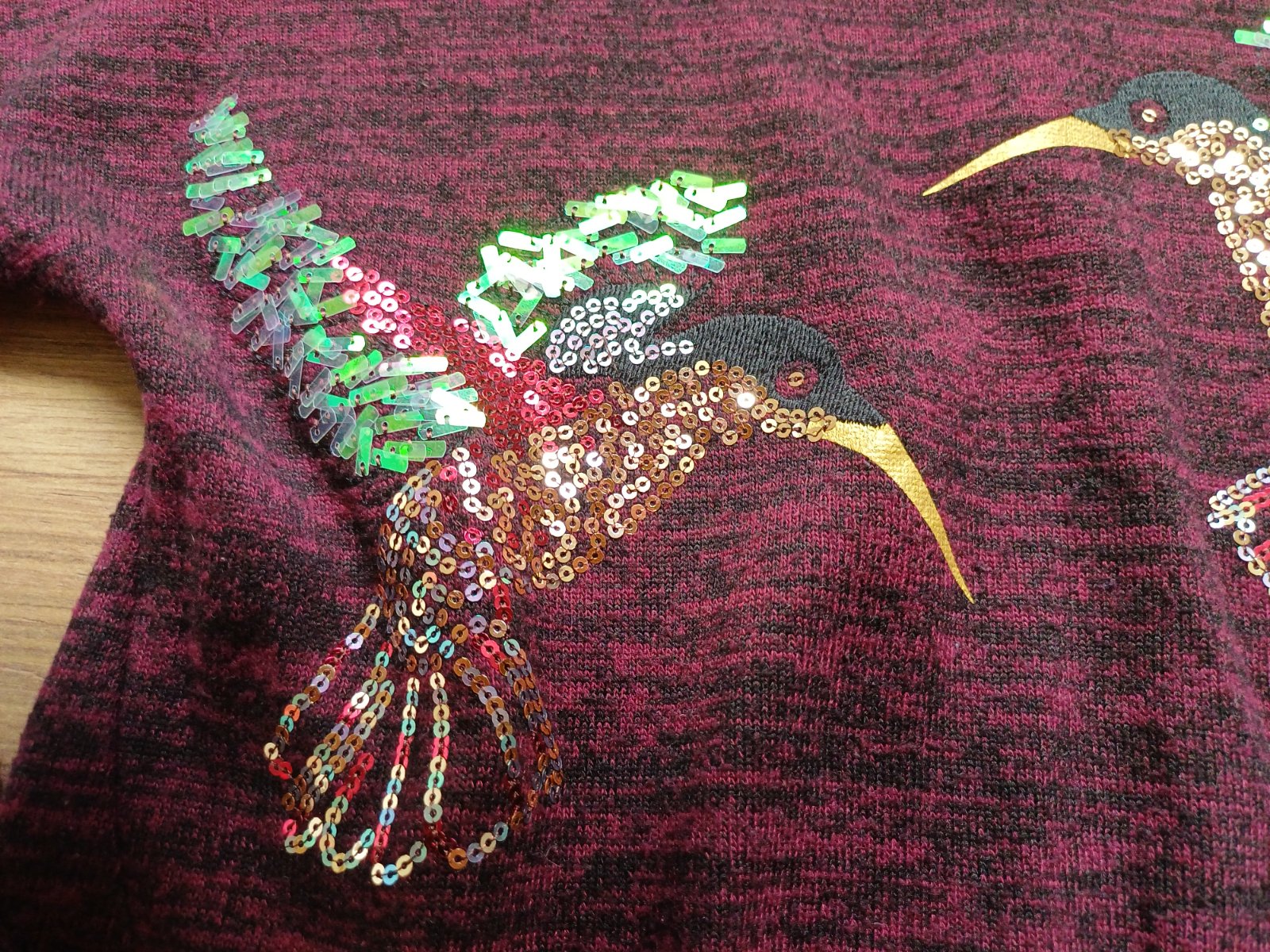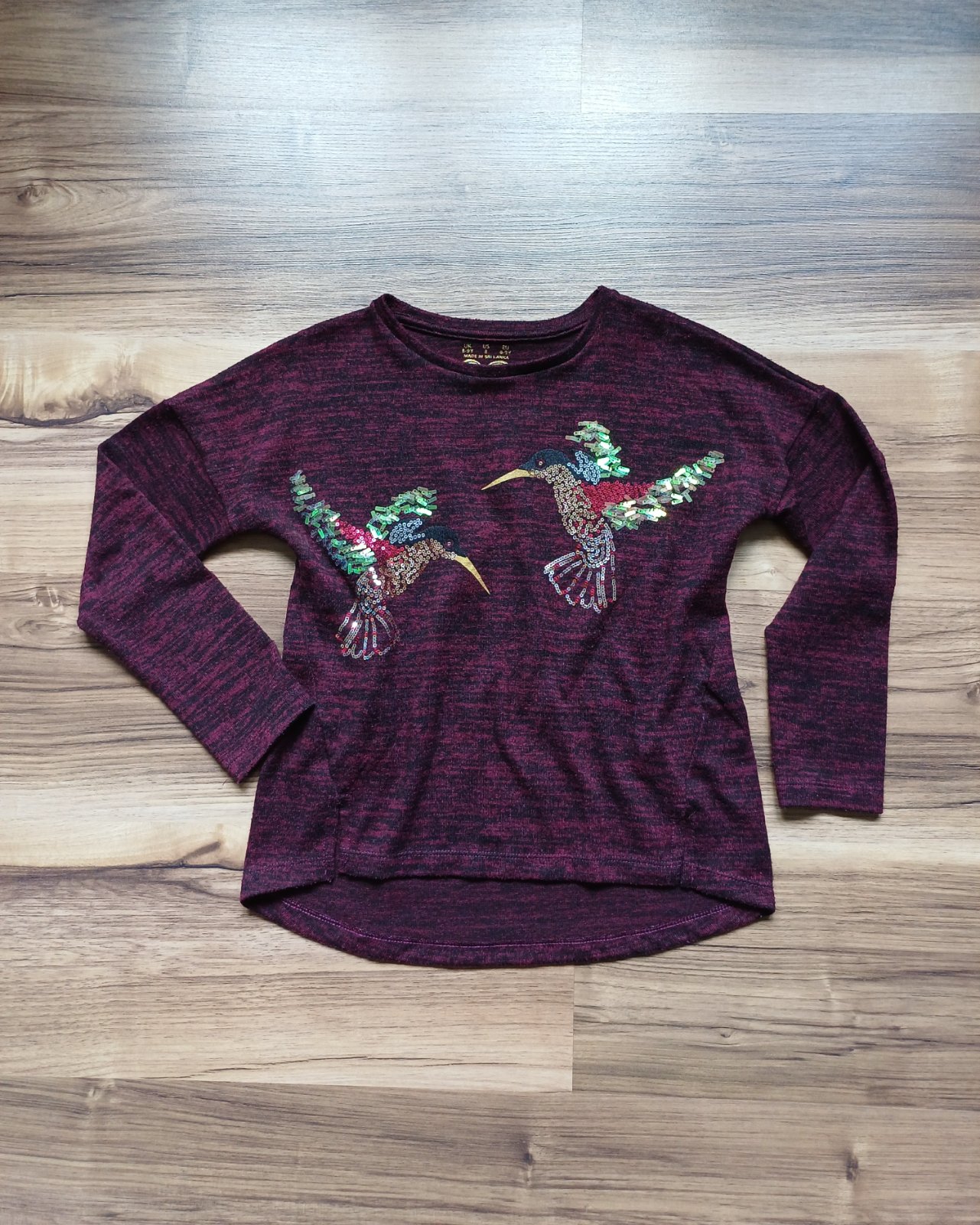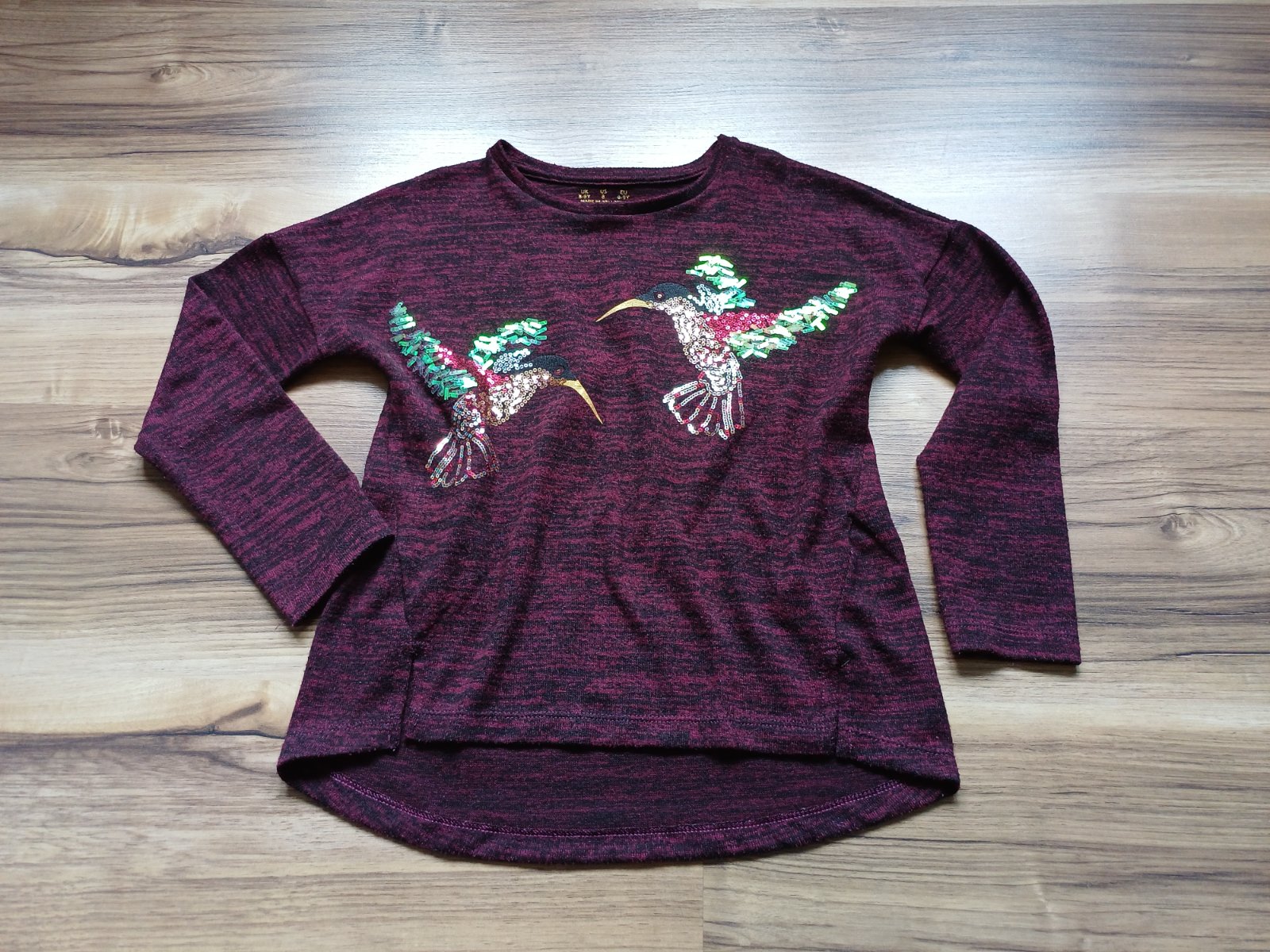 Minimálne nosený svetrík, nepoškodený, výborný stav, krásne ligotavé aplikácie vtákov, vínovo-čierna farebná kombinácia, celková dĺžka vpredu 47 cm, vzadu 55 cm, šírka pod pazuchami 2 x 42 cm, rukáv od krku 55 cm.