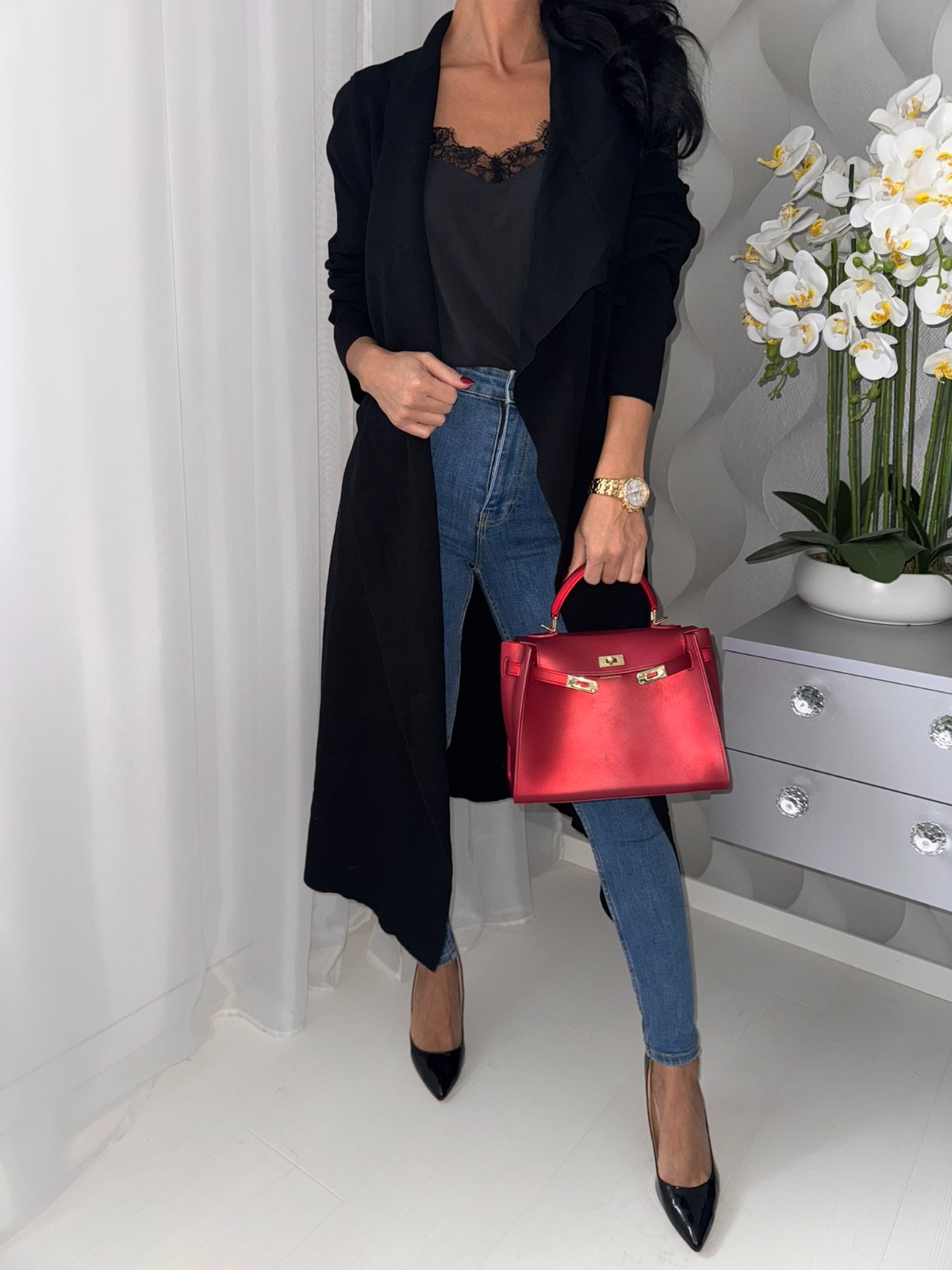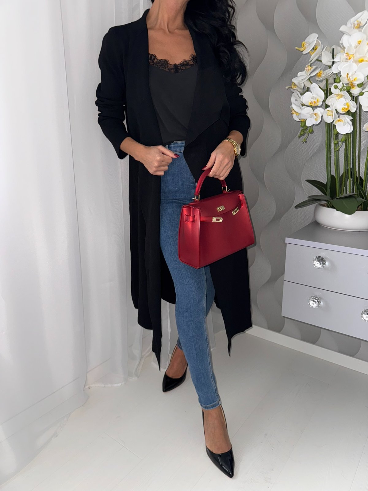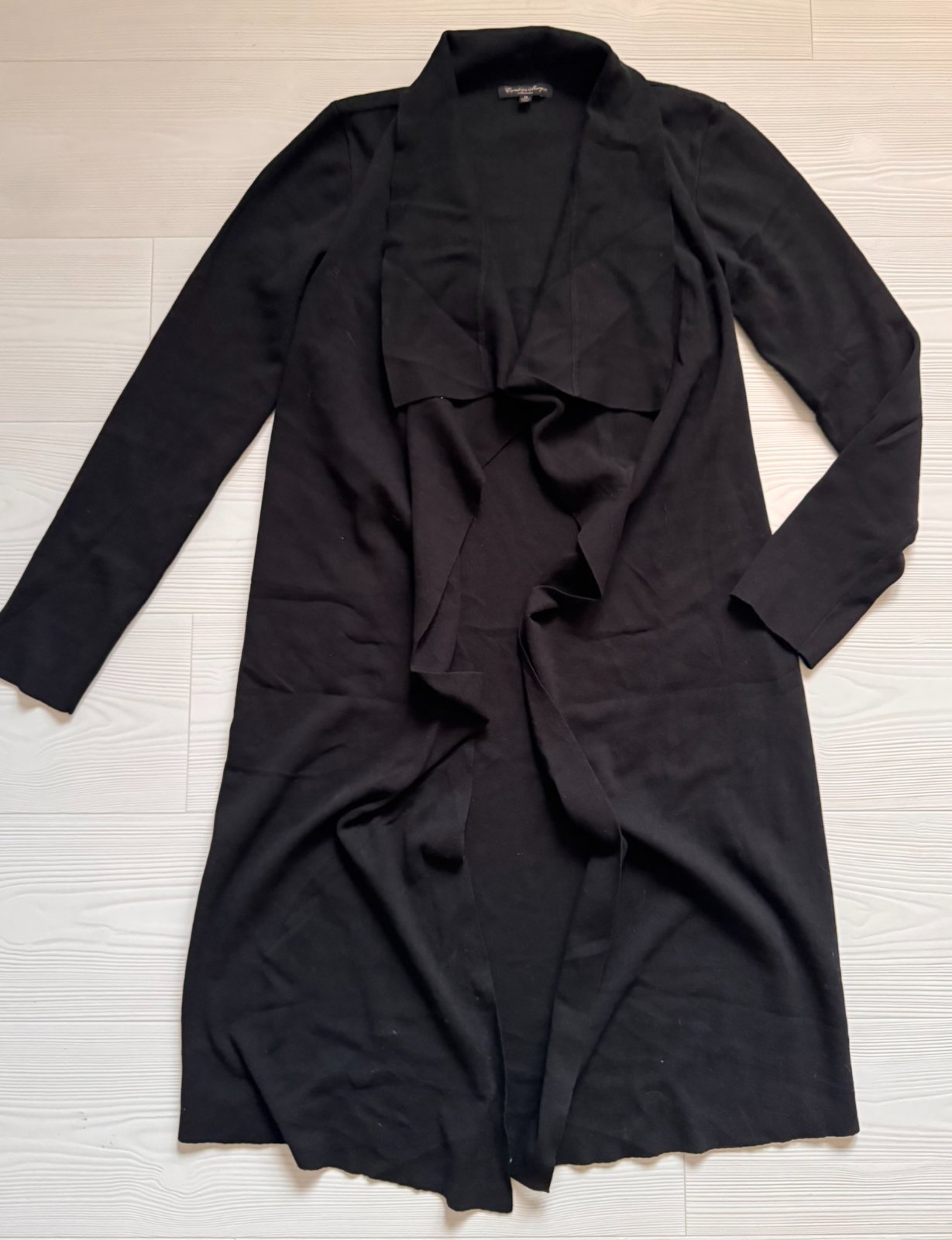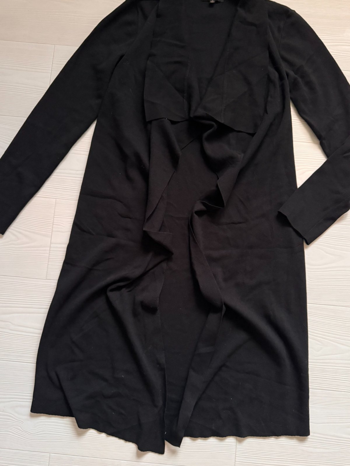 Dlhý čierny kardigán, veľkostne sa prispôsobí.