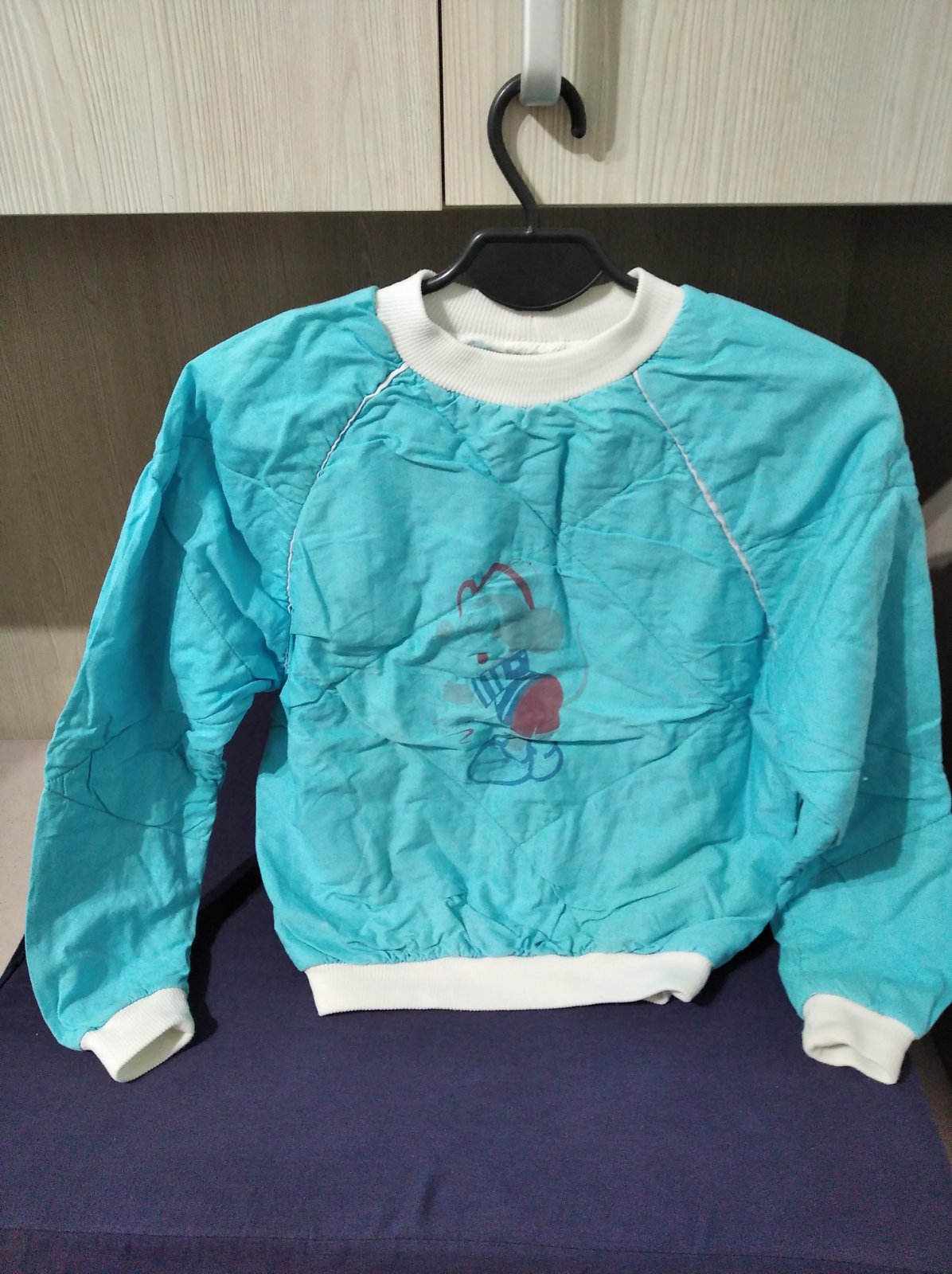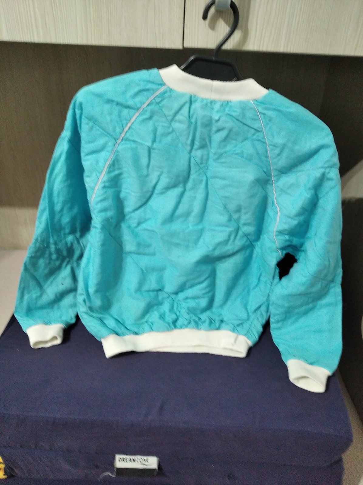 Mikina zateplená. Dĺžka cca 50cm, šírka 43cm. Vzadu sa niektoré stehy párajú a na oboch rukávoch malé čierne fľaky.