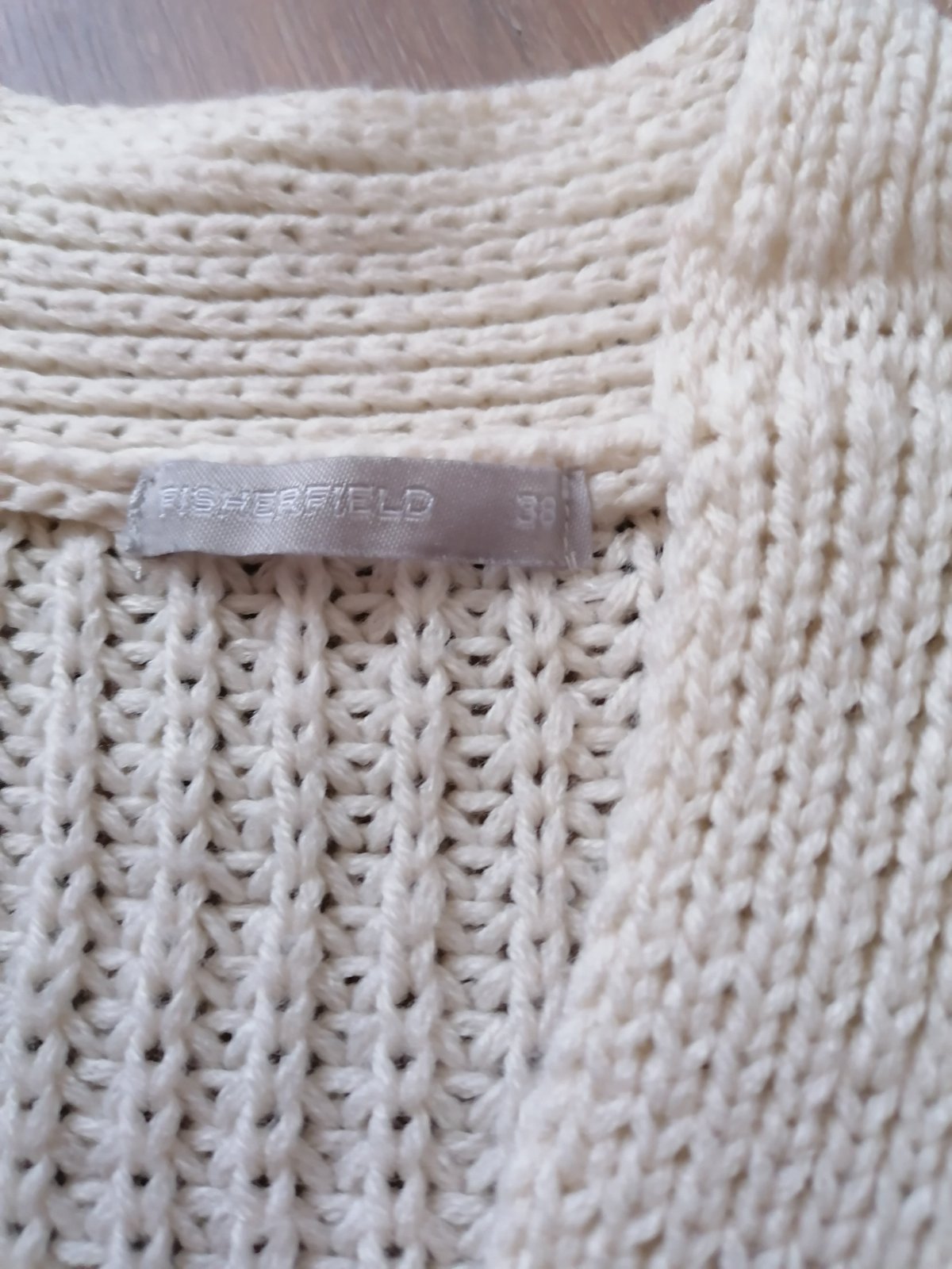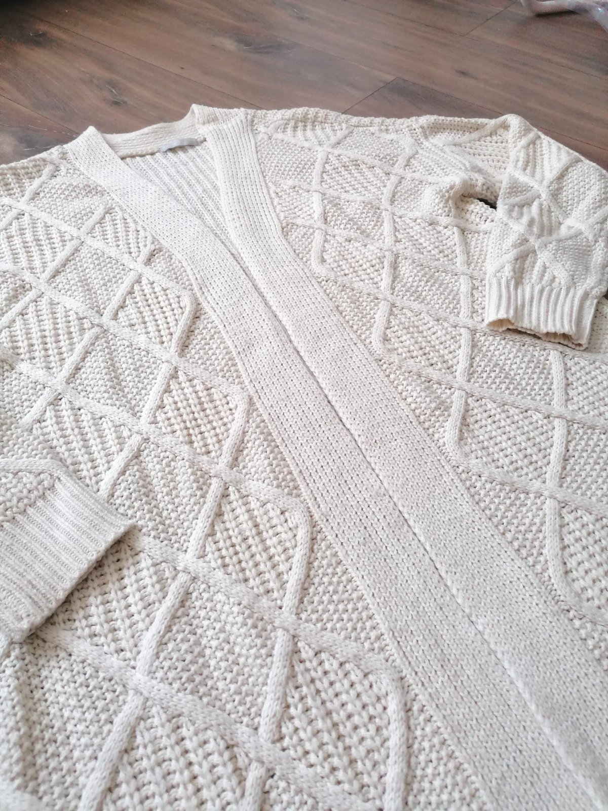 Skvelý univerzálny kúsok do šatníka. Farba taka maslova/béžová. Pekný strikovany, teply, nemá žiadne zapínanie. Sedí kľudne na viacero veľkosti, ja som nosila ako M, sadne určite aj L. Dĺžka 93 cm, šírka v prsiach 53 cm.