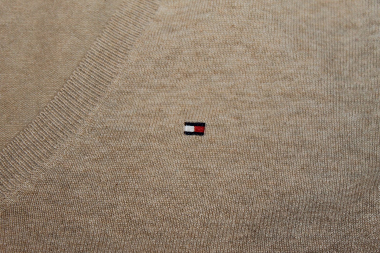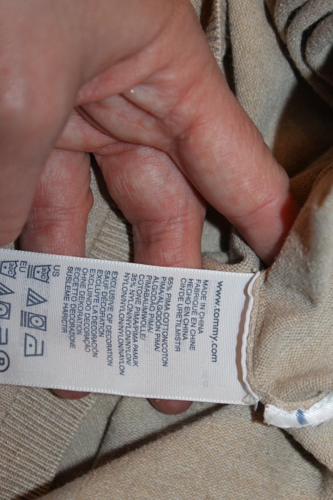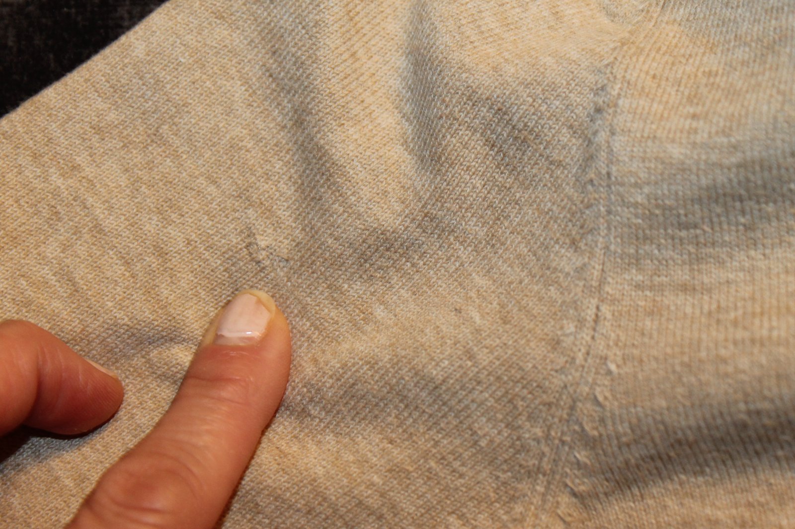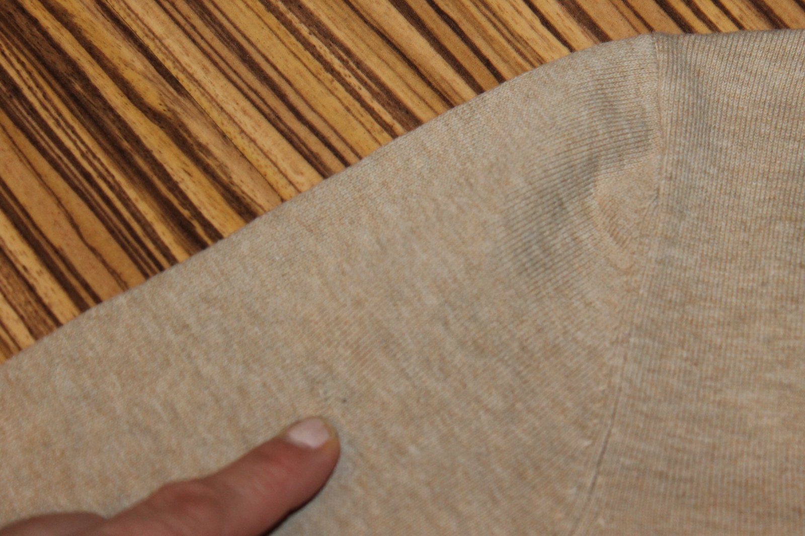 V super stave, na pravom ramene malá zašitá dierka (viď detail), na pravej ruke dva fliačiky, inak bez poškodení. Veľ. M, RO: š x47 cm, dl. 59 cm, rukáv od krku 66/45 cm. Váha 190 g.